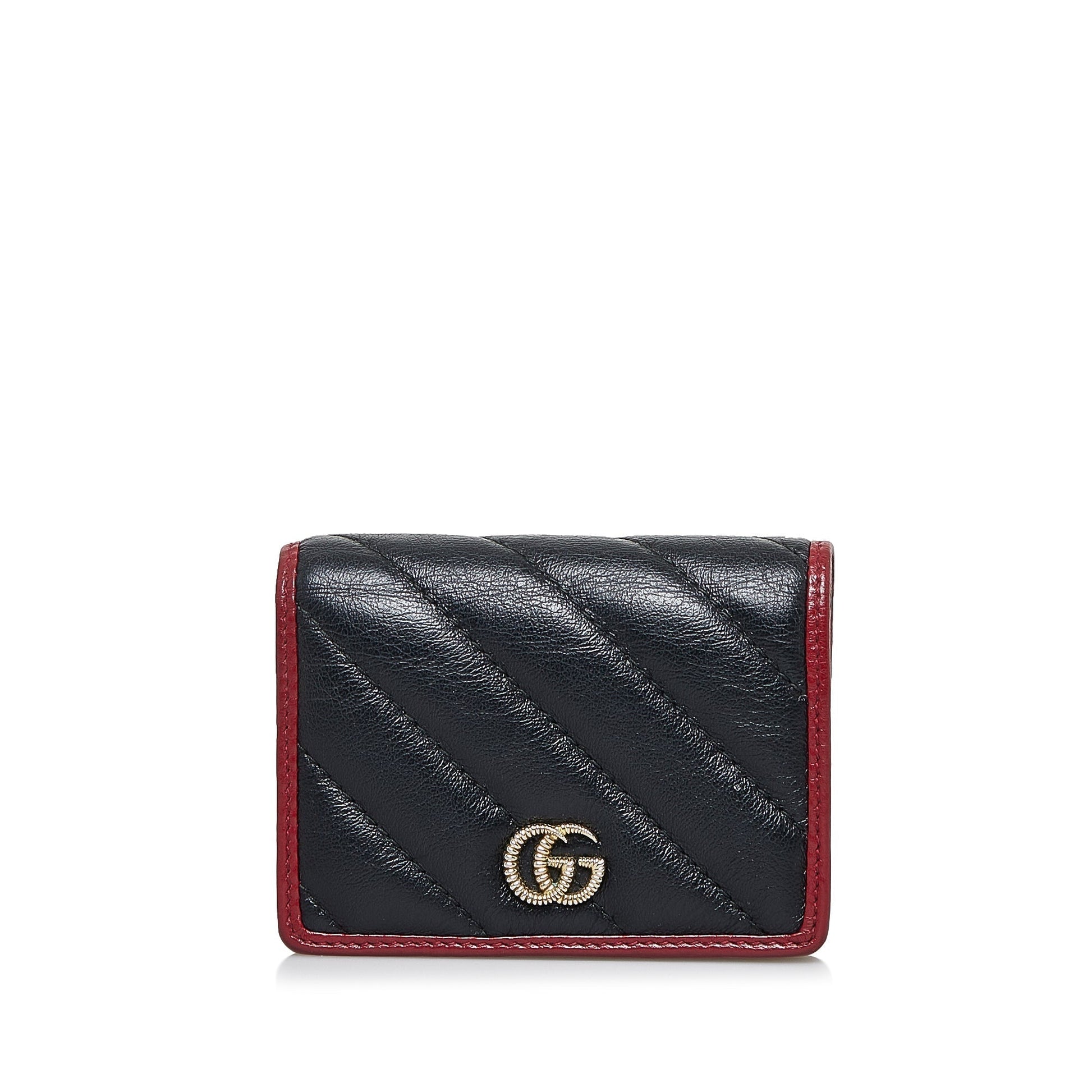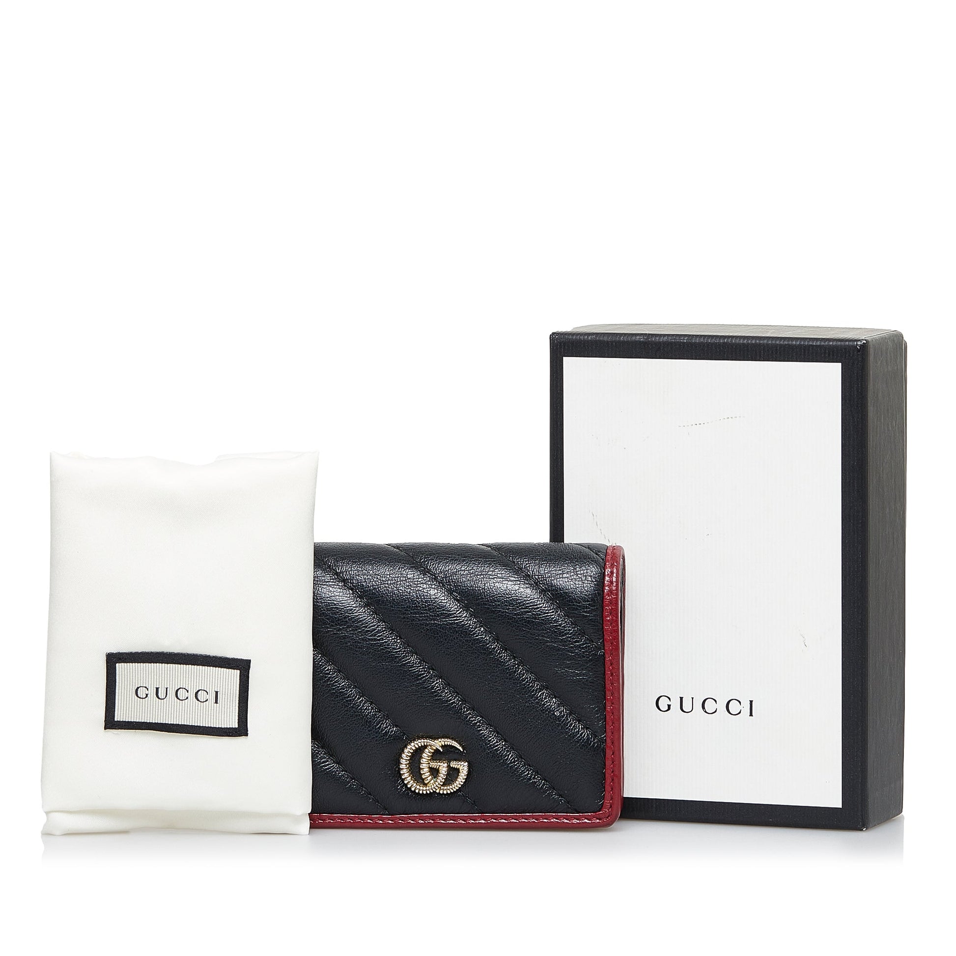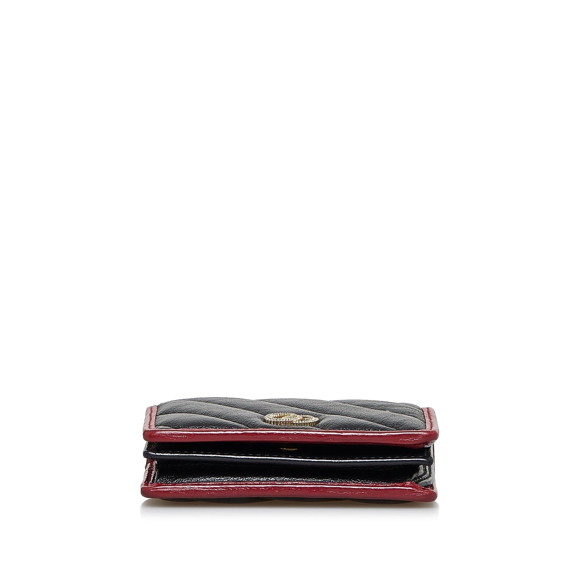This wallet features a quilted leather body, flap with interior slip pockets. Comes with box and dust bag.