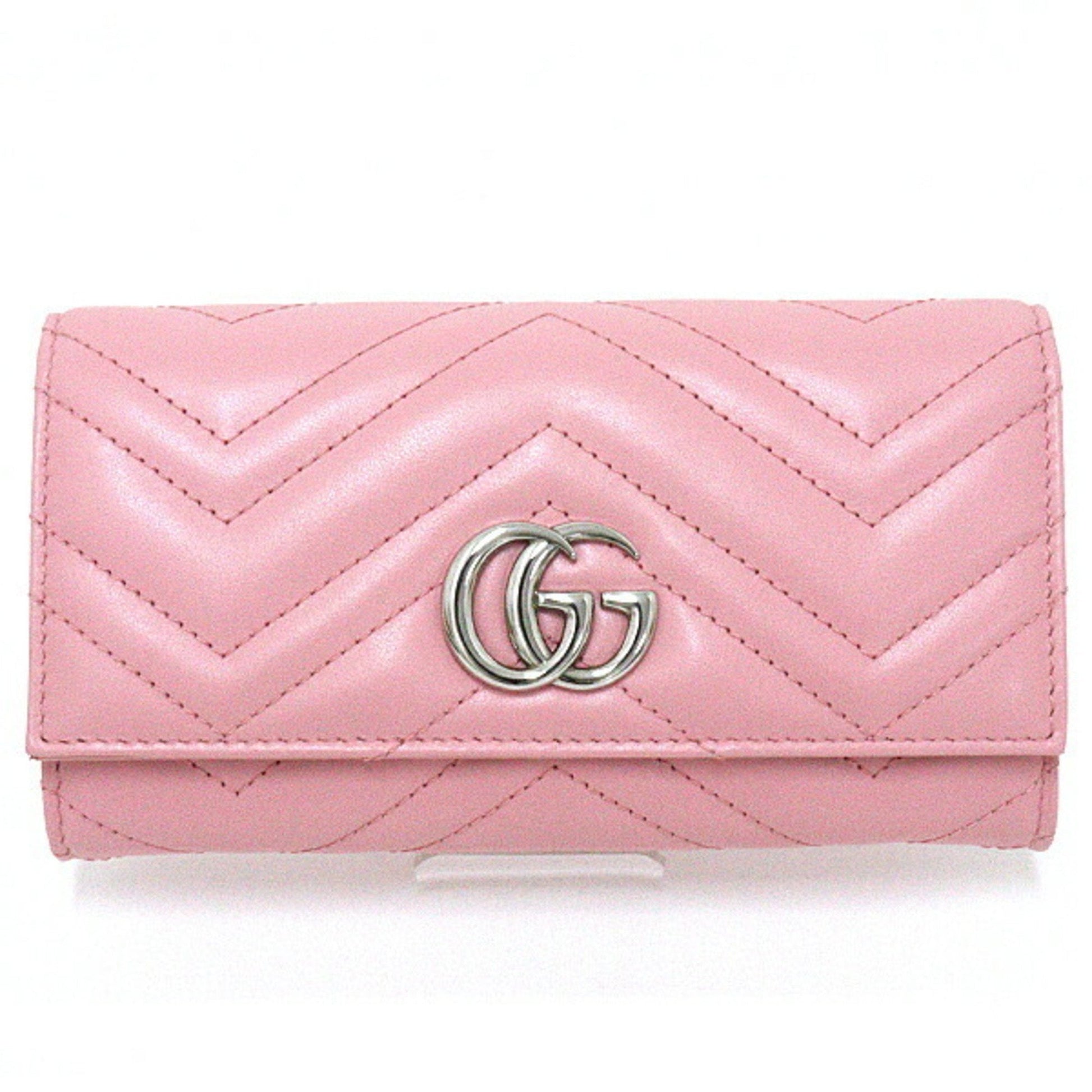 Gucci GG Marmont Continental Wallet Bifold Long Double G Chevron Quilted Leather 443436 Pink Silver Hardware