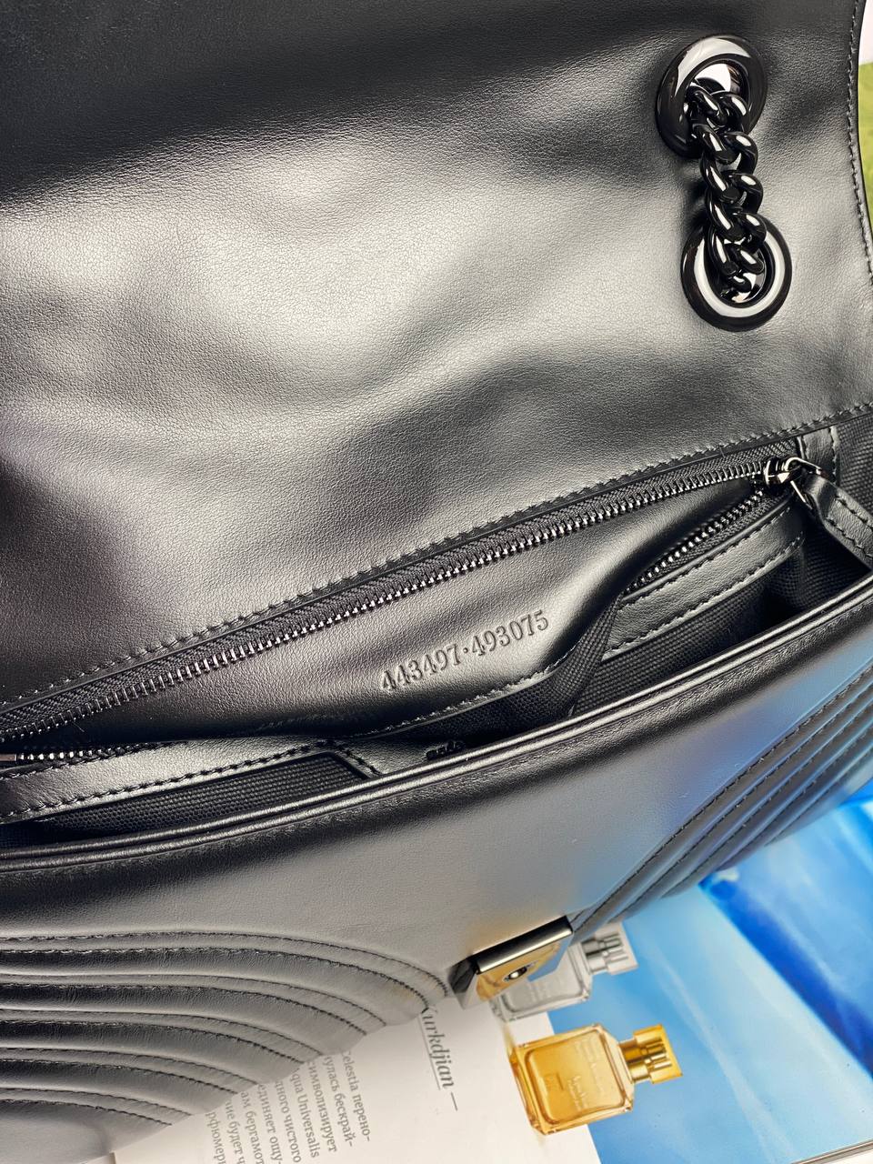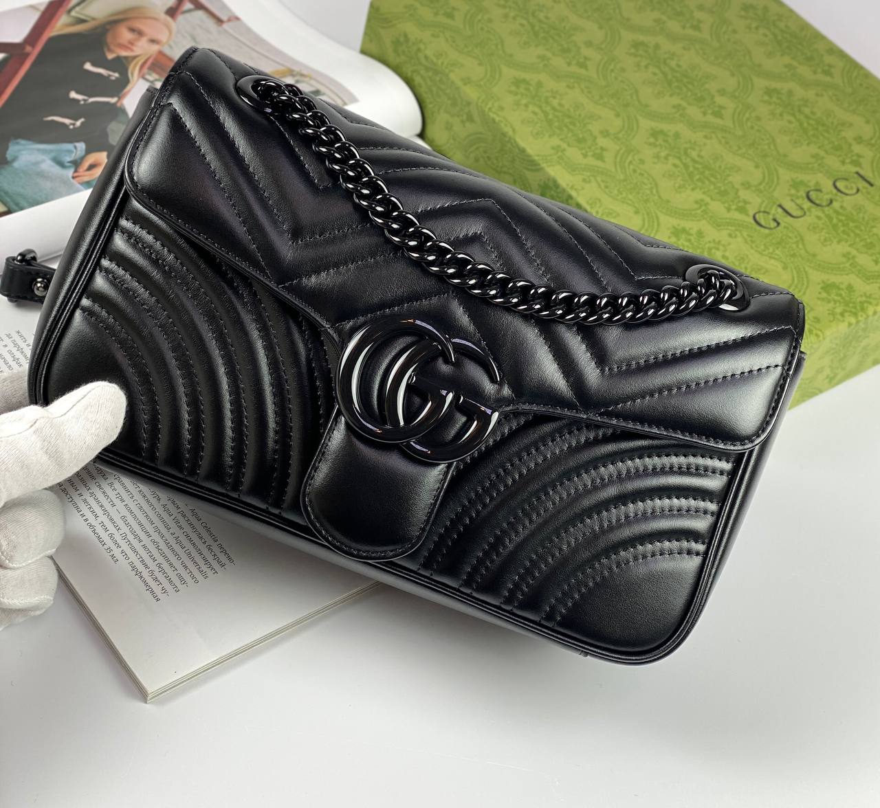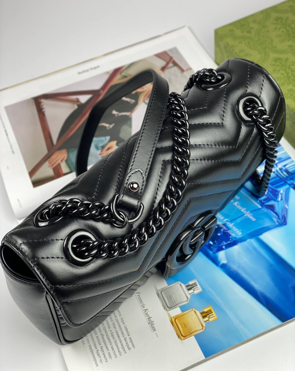 The small GG Marmont bag features a large flap closure with chain strap and Double G hardware. Thanks to the sliding chain, the bag can be multiple ways - on the shoulder or by the handles. A quilted leather accessory with a geometric pattern and monochrome hardware, created exclusively for the Gucci Love Parade collection.