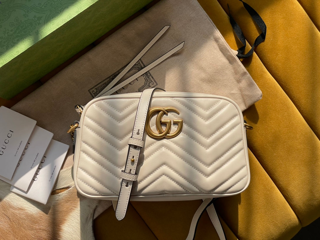 The small GG Marmont chain shoulder bag has a softly structured shape and a zip top closure with the Double G hardware. The chain shoulder strap has a leather shoulder detail. The camera bag is made in matelassé leather with a chevron design and GG on the back.