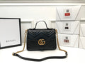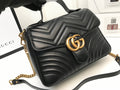 The small GG Marmont top handle bag has a softly structured shape and an oversized flap closure with Double G hardware. Made in matelassé chevron leather with a heart on the back.