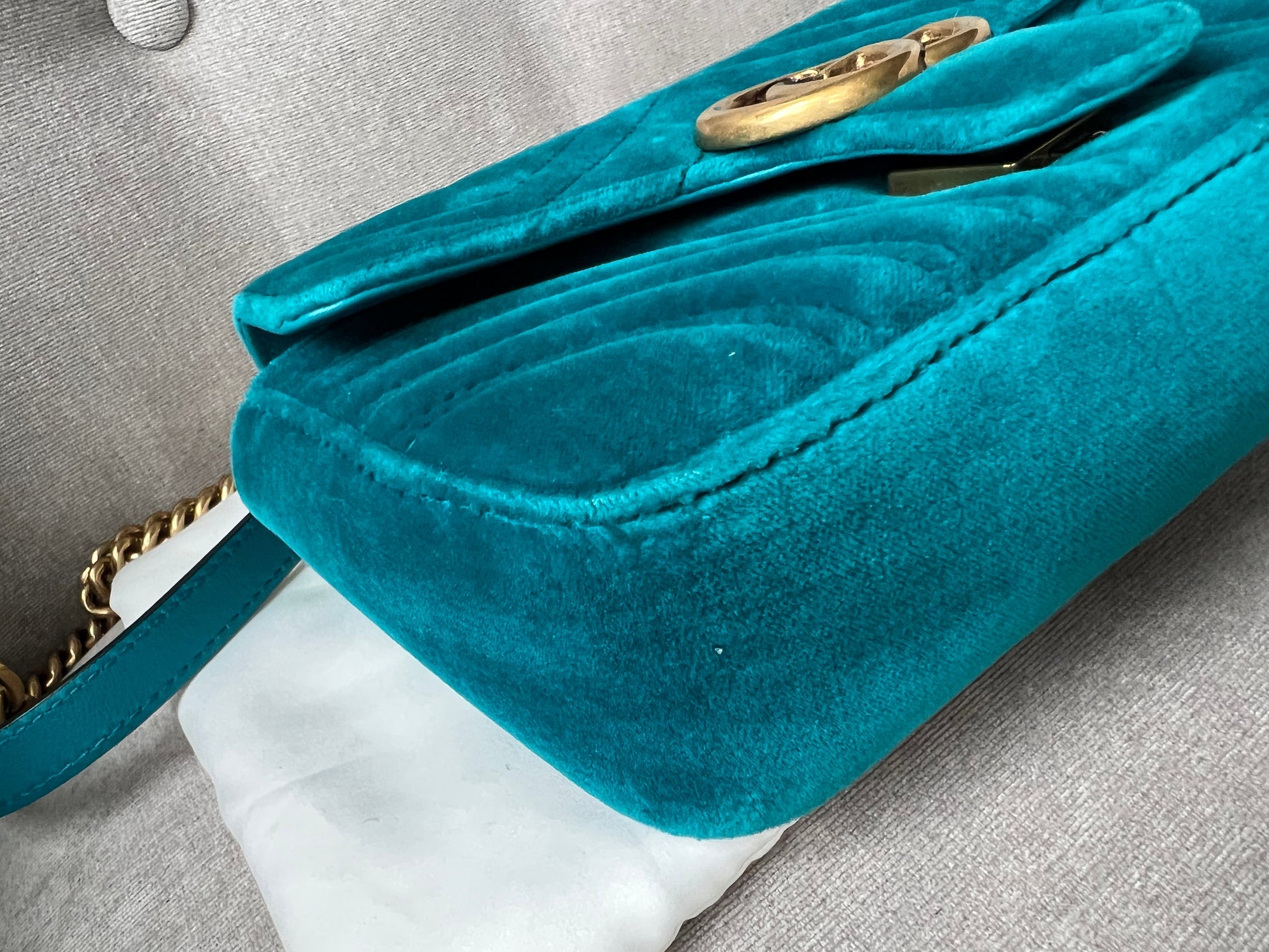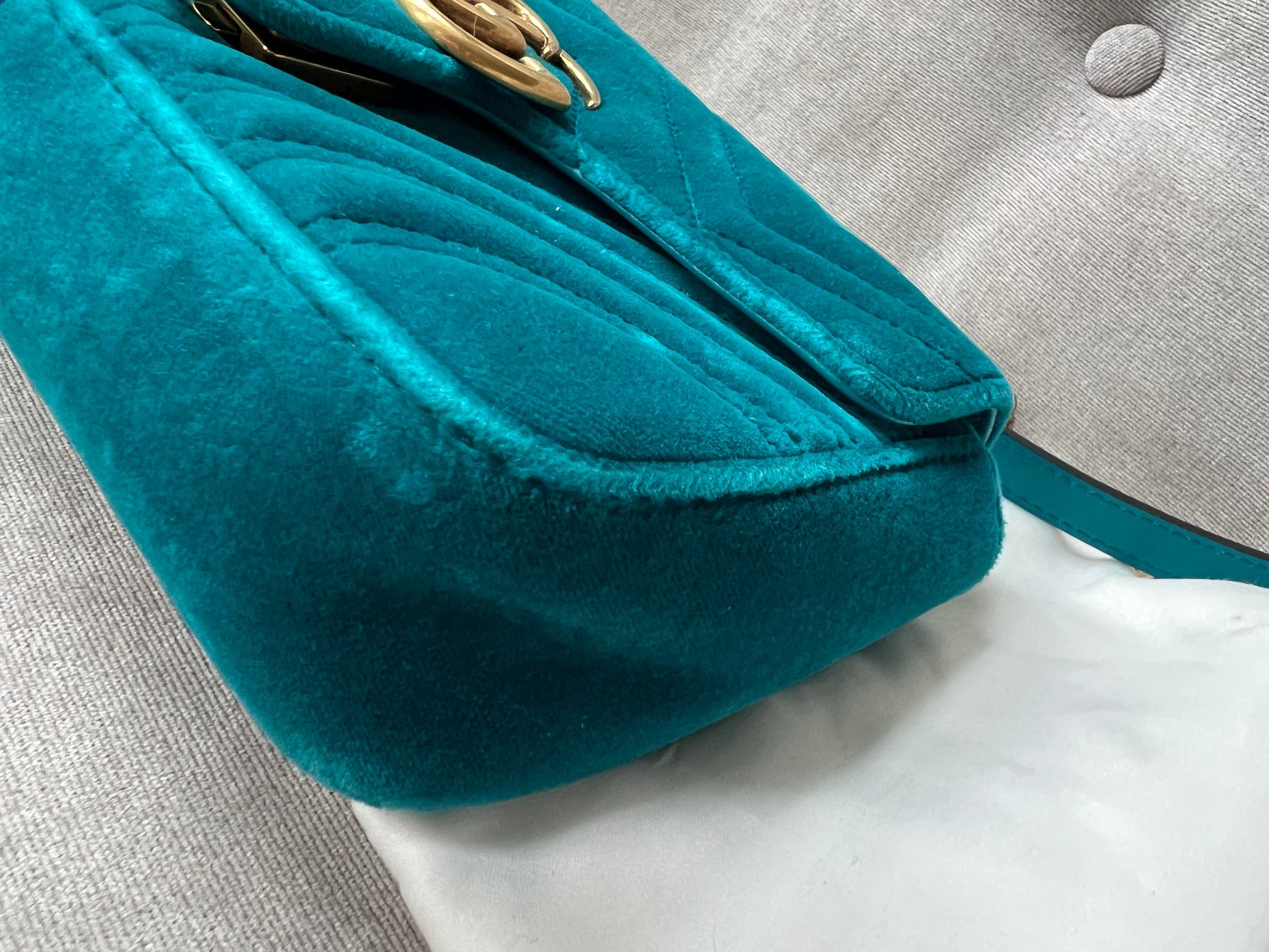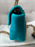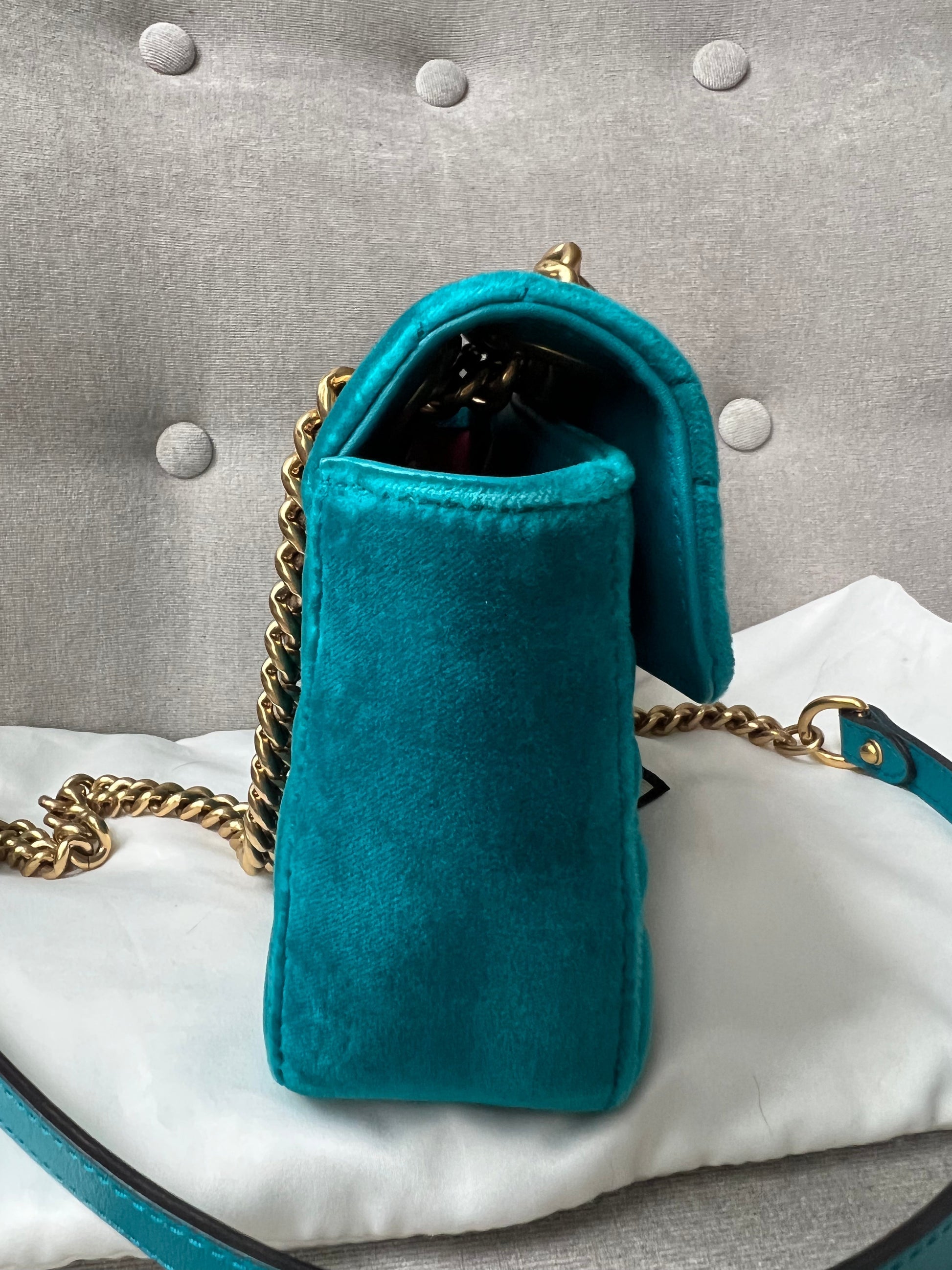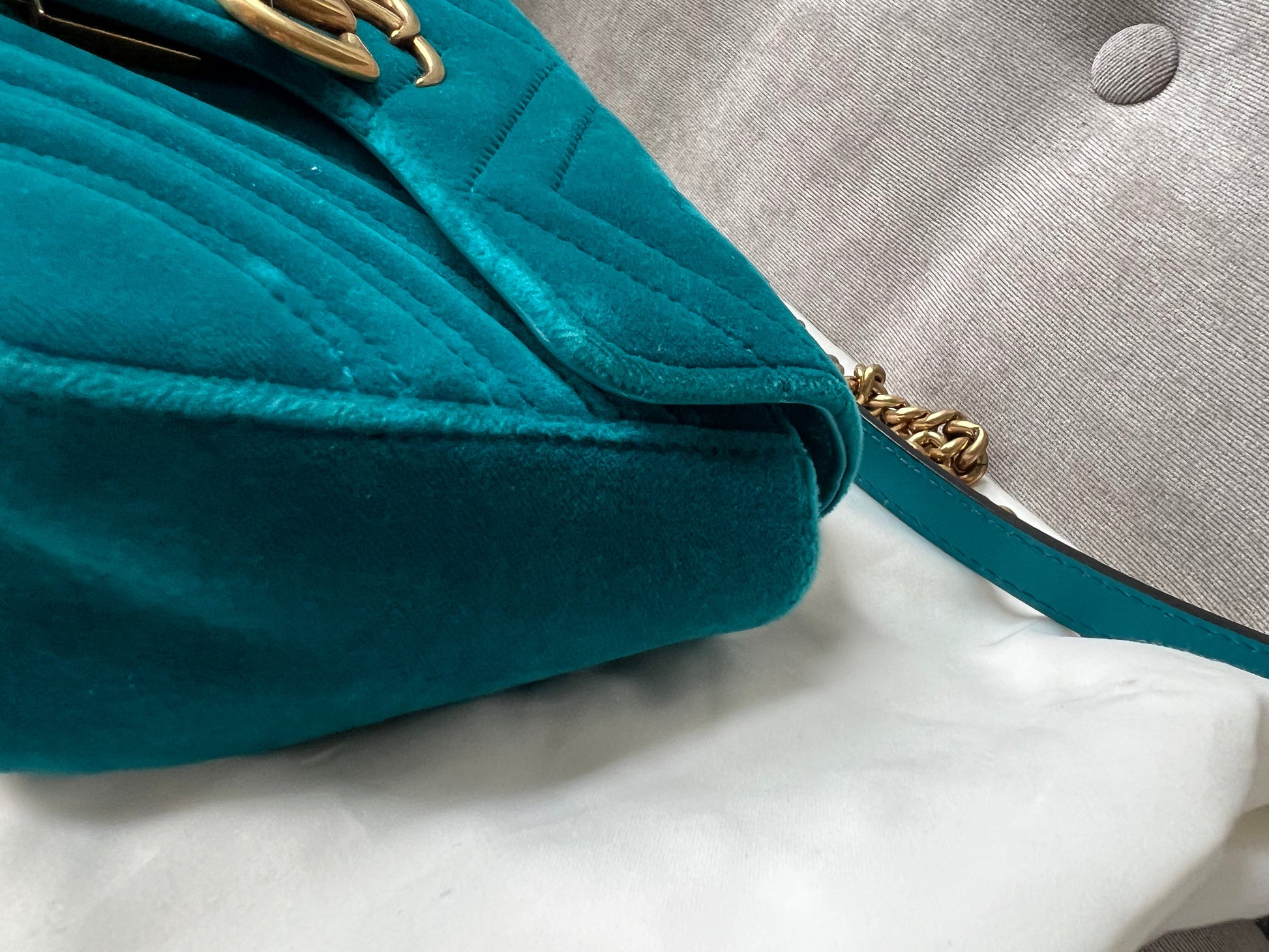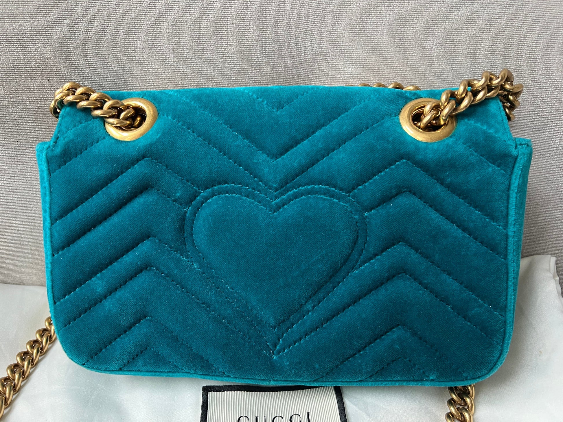 Gucci GG Marmont mini shoulder bag in teal velvet with gold hardware. This small Marmont bag has a softly structured shape and an oversized flap with GG hardware and heart detail on the back. The sliding chain can be multiple ways either doubled up or lengthened. Effortlessly chic and sophisticated, this style can be both with a casual outfit or for evening wear. Suitable for both event or occasion wear and ideal for those who prefer a cross body option.