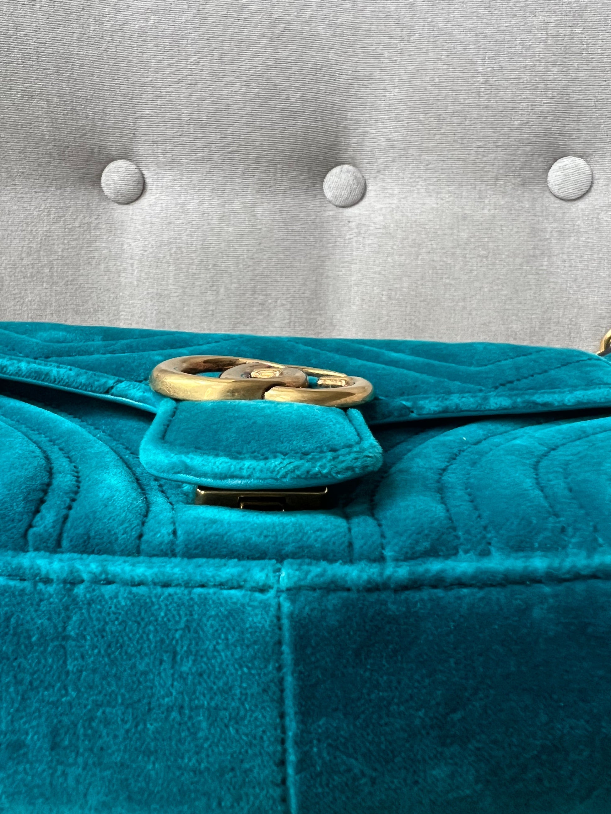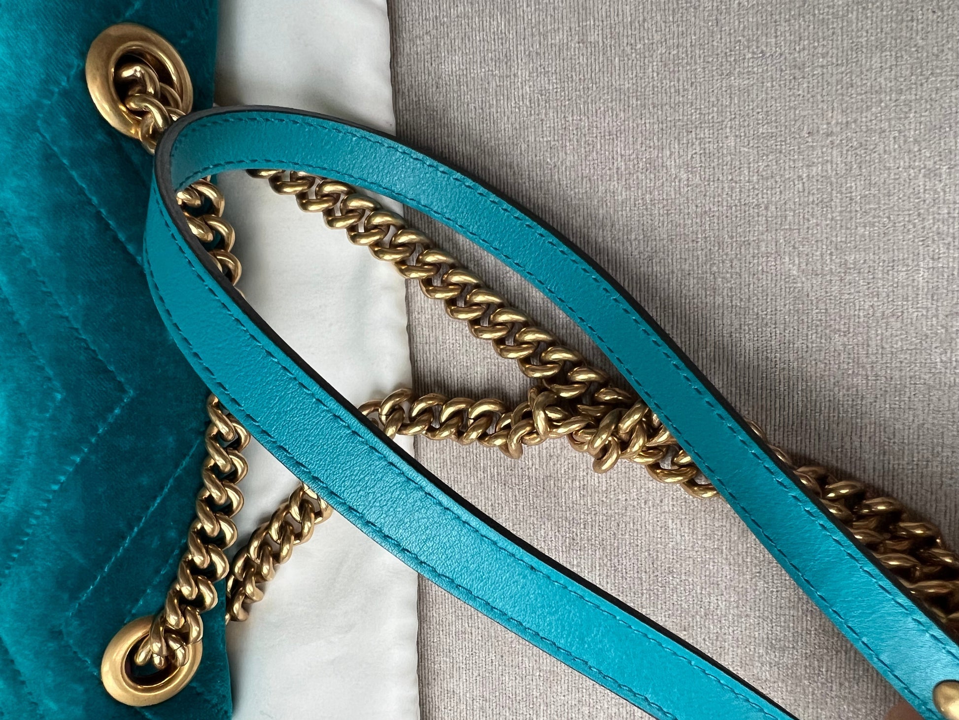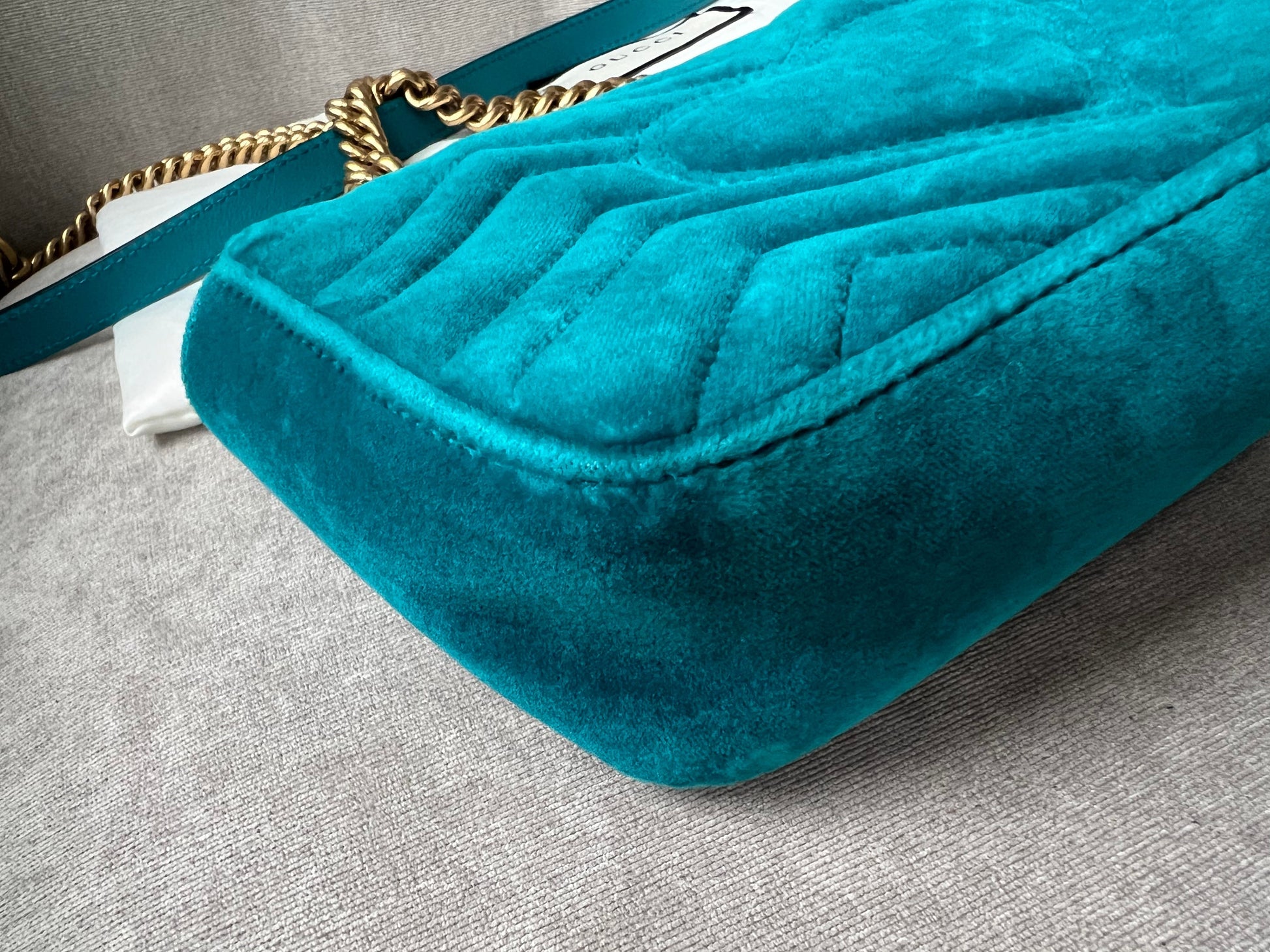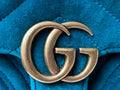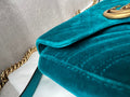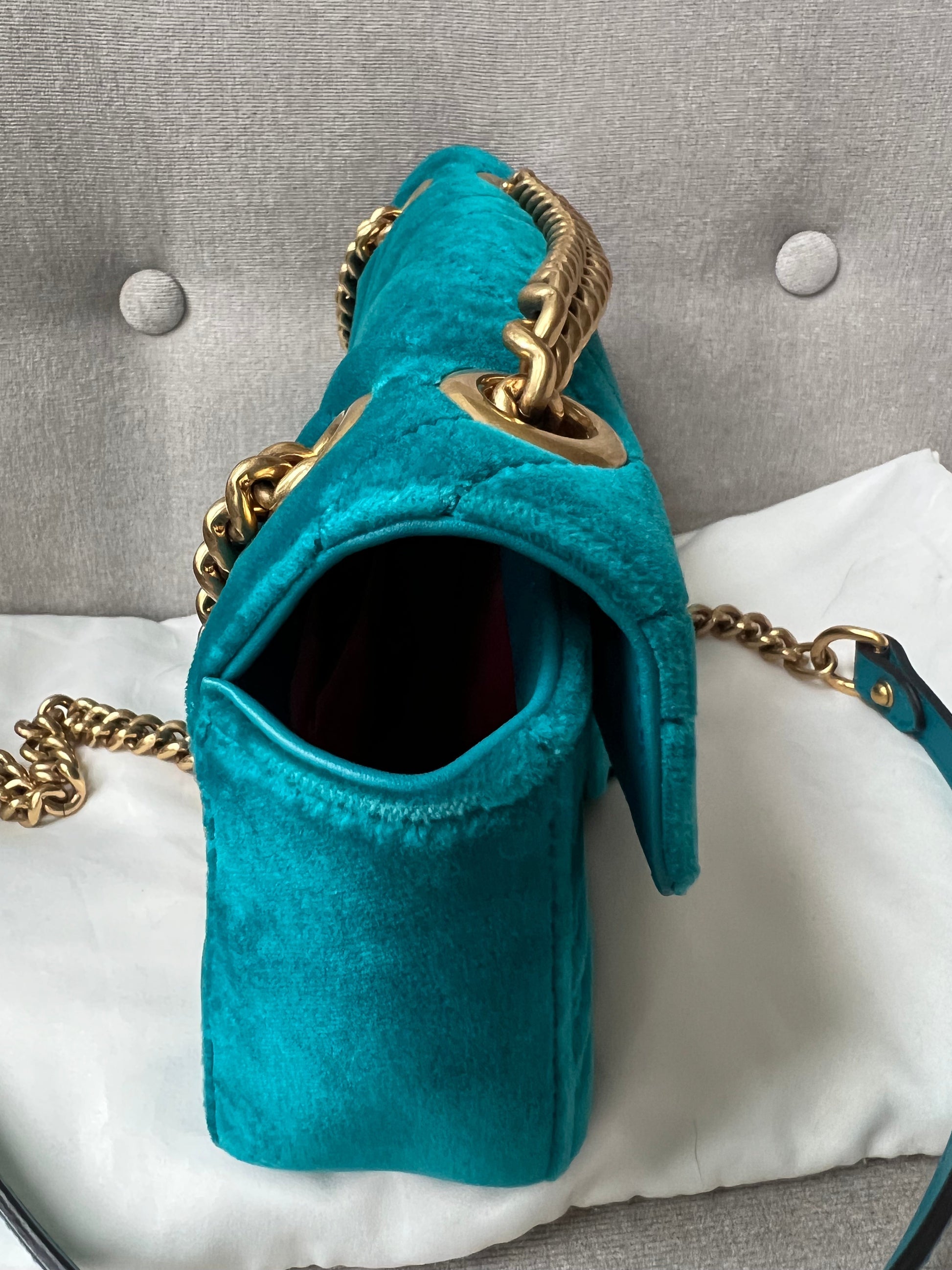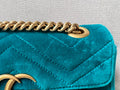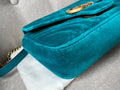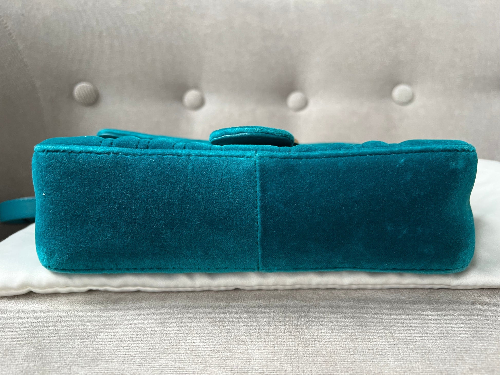 Gucci GG Marmont mini shoulder bag in teal velvet with gold hardware. This small Marmont bag has a softly structured shape and an oversized flap with GG hardware and heart detail on the back. The sliding chain can be multiple ways either doubled up or lengthened. Effortlessly chic and sophisticated, this style can be both with a casual outfit or for evening wear. Suitable for both event or occasion wear and ideal for those who prefer a cross body option.