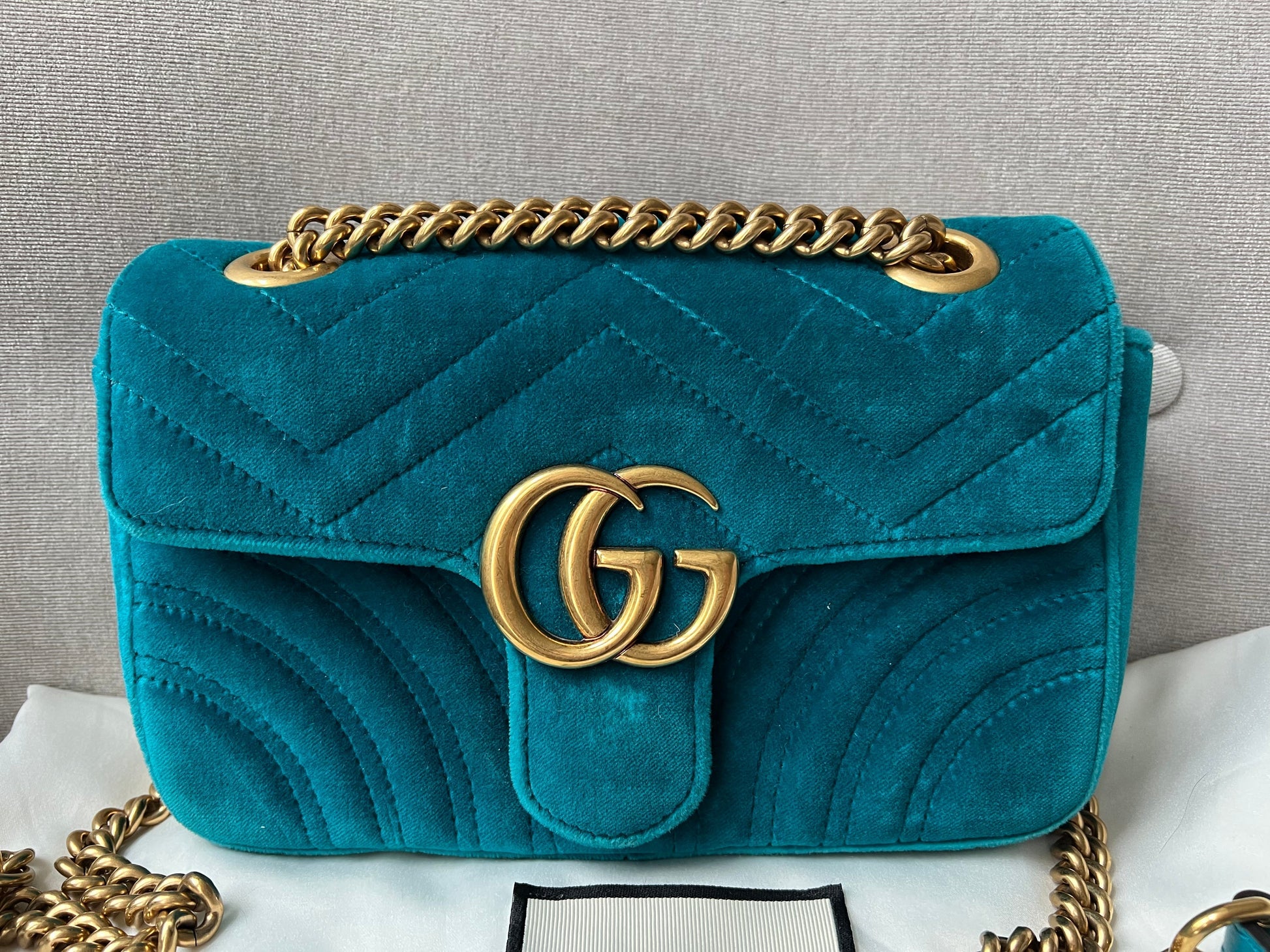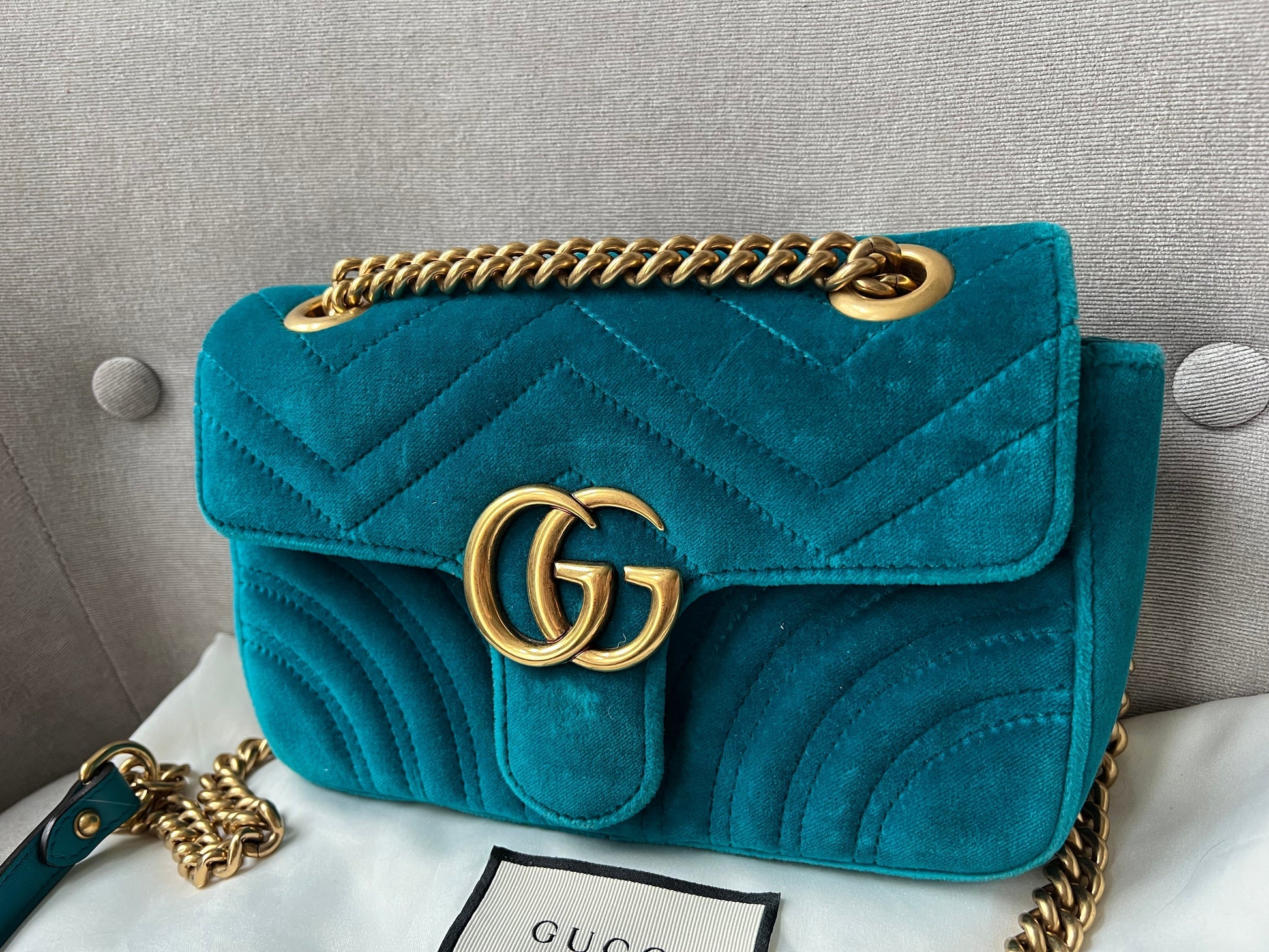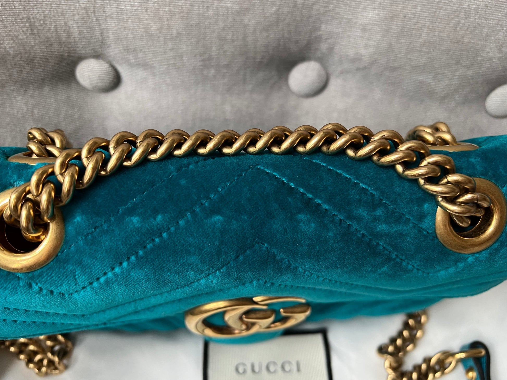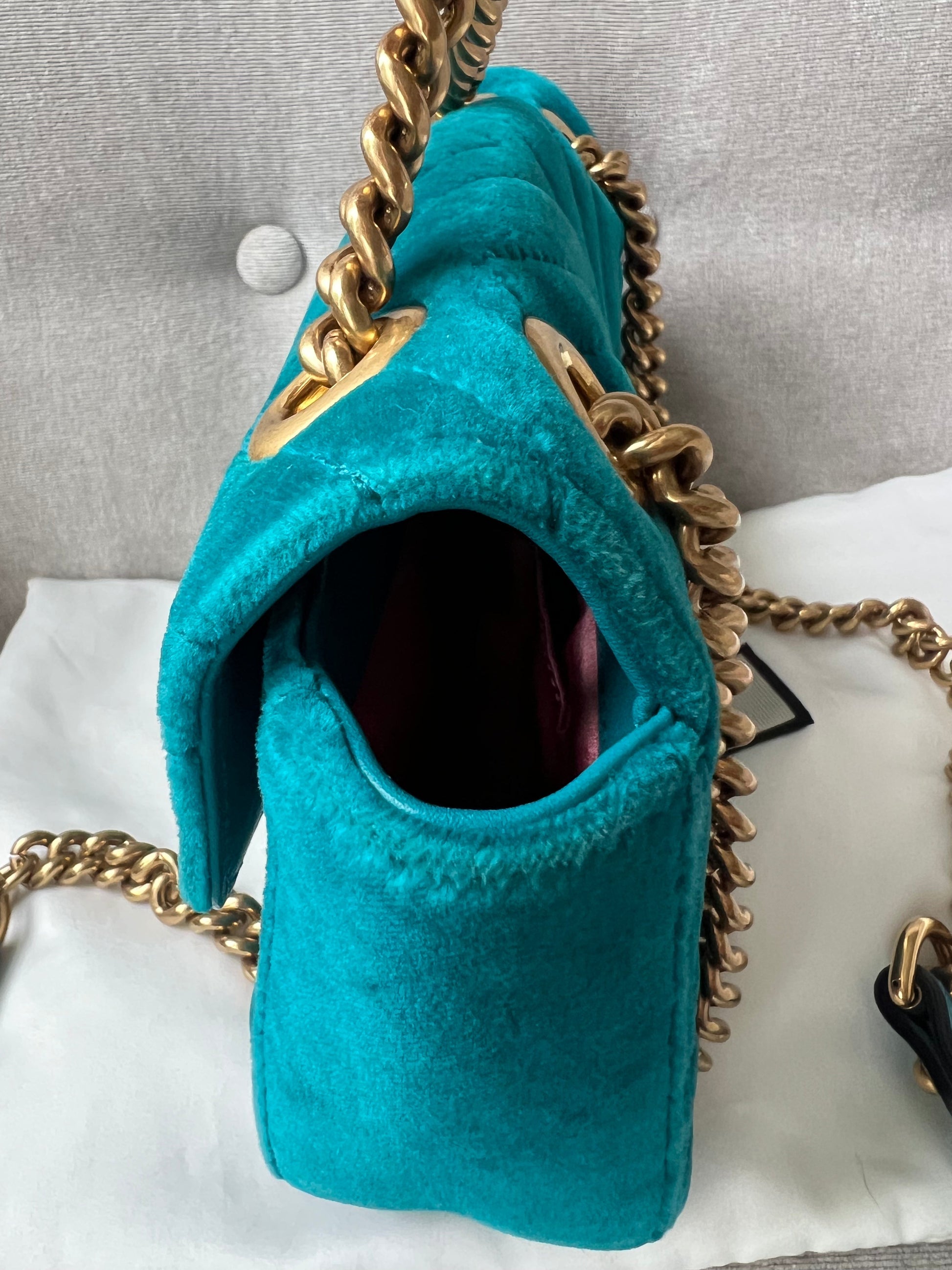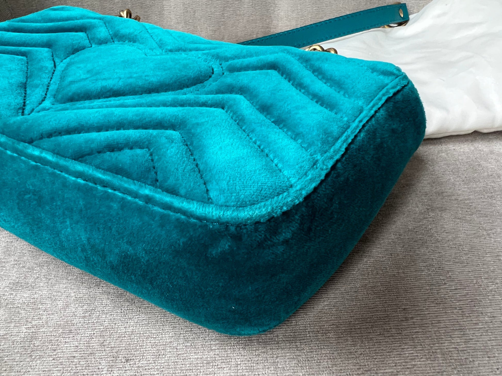 Gucci GG Marmont mini shoulder bag in teal velvet with gold hardware. This small Marmont bag has a softly structured shape and an oversized flap with GG hardware and heart detail on the back. The sliding chain can be multiple ways either doubled up or lengthened. Effortlessly chic and sophisticated, this style can be both with a casual outfit or for evening wear. Suitable for both event or occasion wear and ideal for those who prefer a cross body option.
