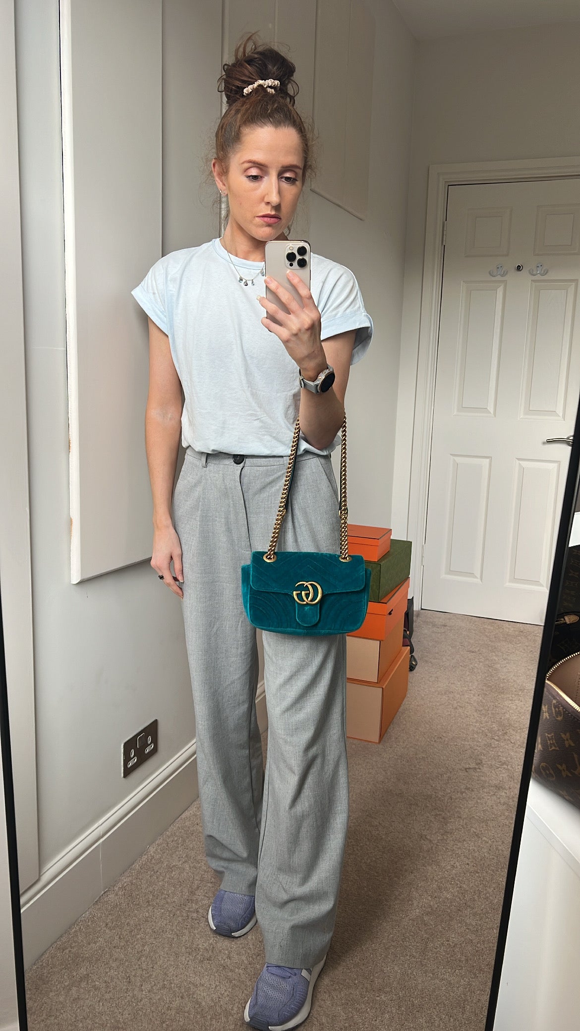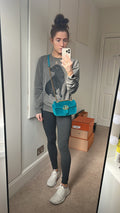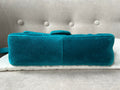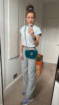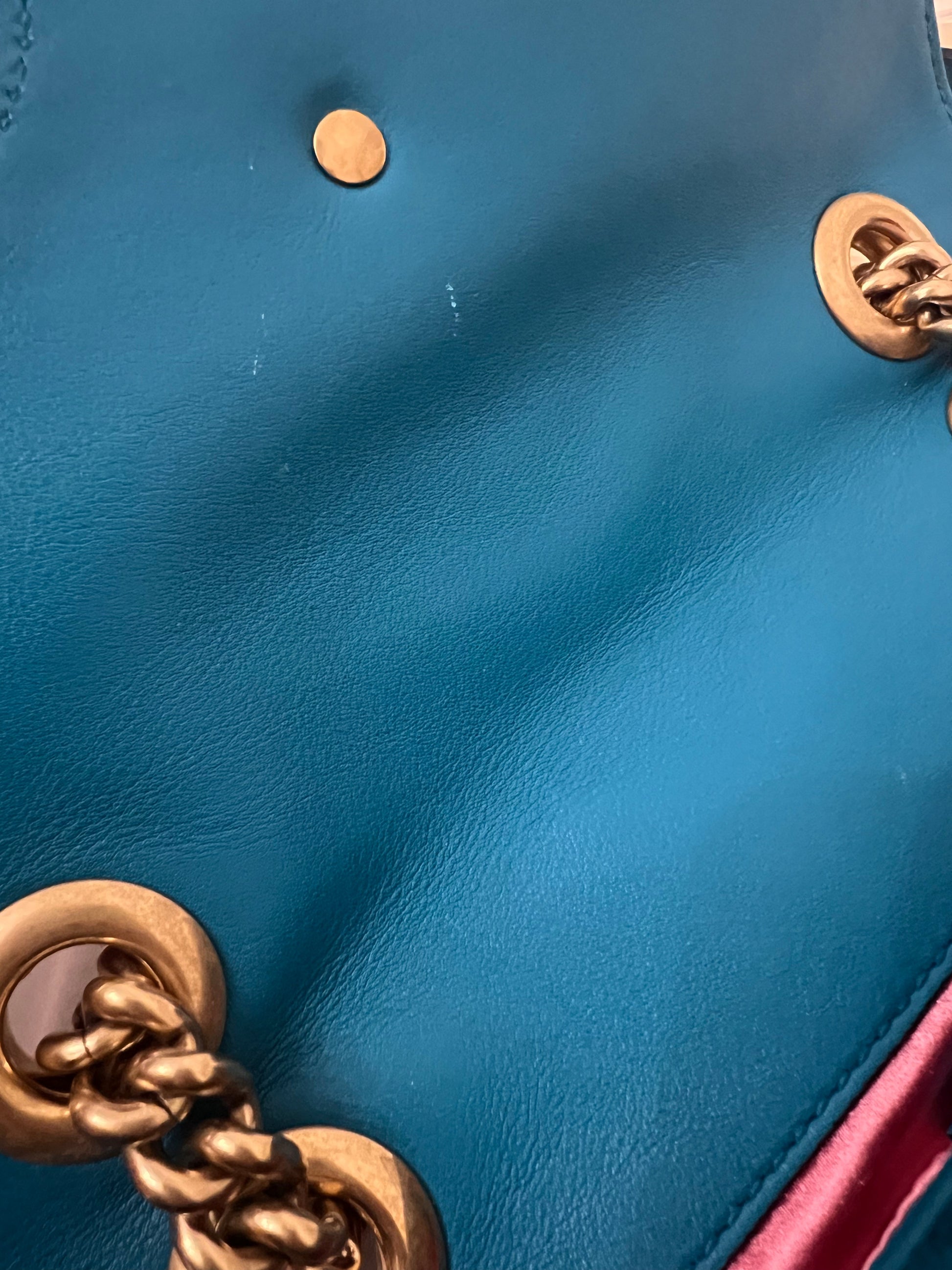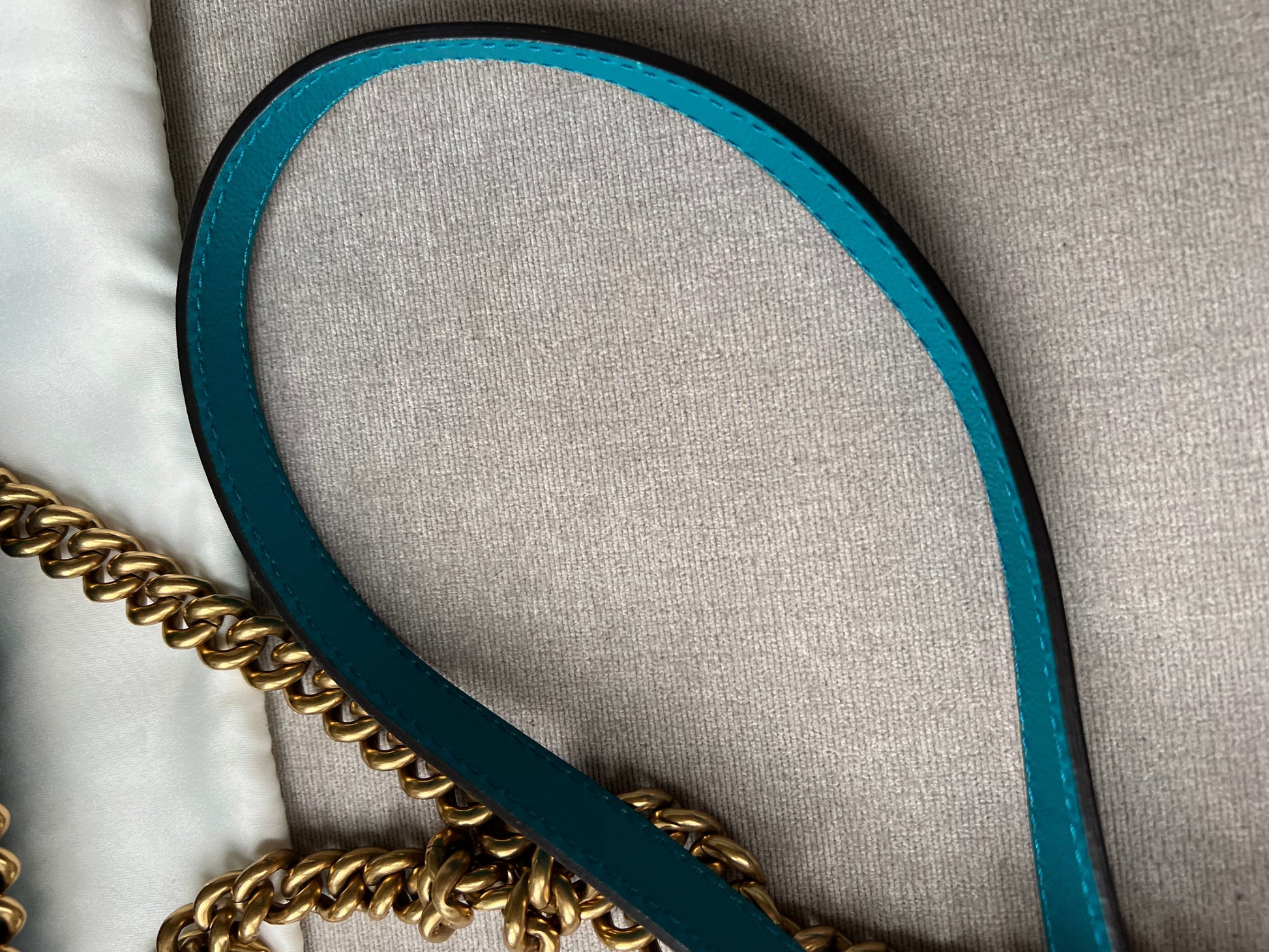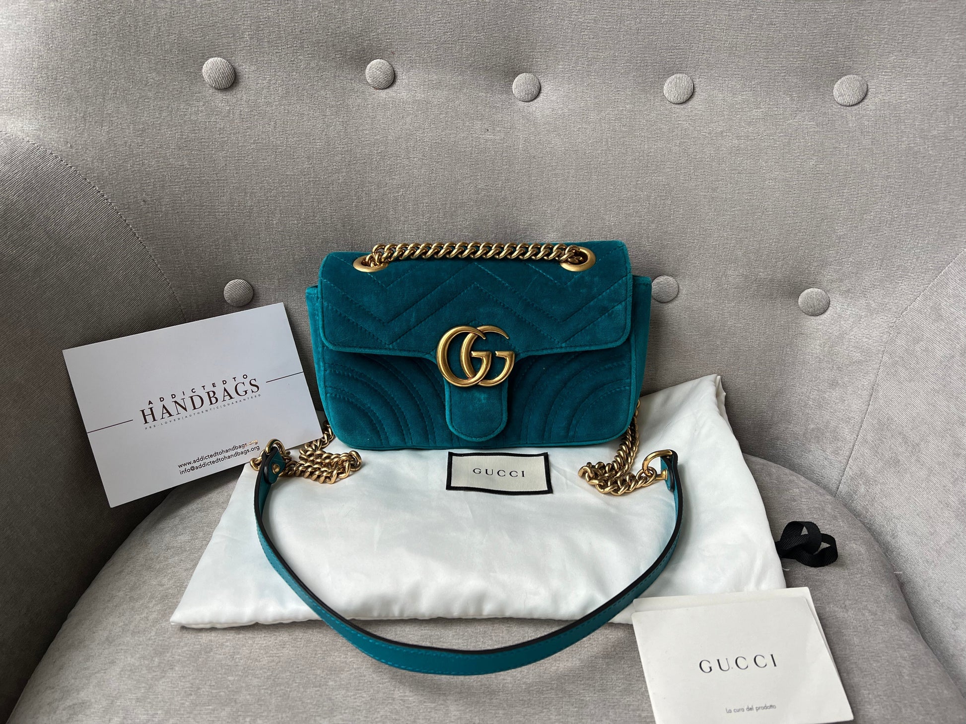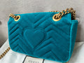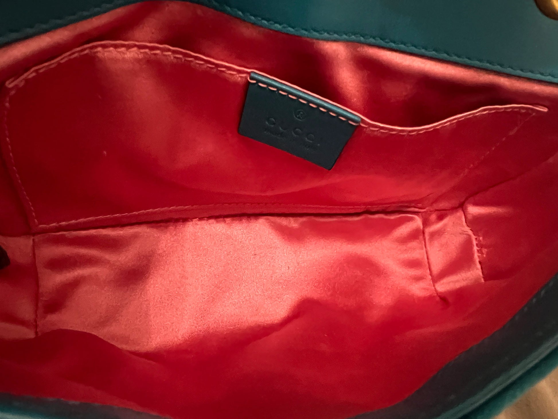 Gucci GG Marmont mini shoulder bag in teal velvet with gold hardware. This small Marmont bag has a softly structured shape and an oversized flap with GG hardware and heart detail on the back. The sliding chain can be multiple ways either doubled up or lengthened. Effortlessly chic and sophisticated, this style can be both with a casual outfit or for evening wear. Suitable for both event or occasion wear and ideal for those who prefer a cross body option.