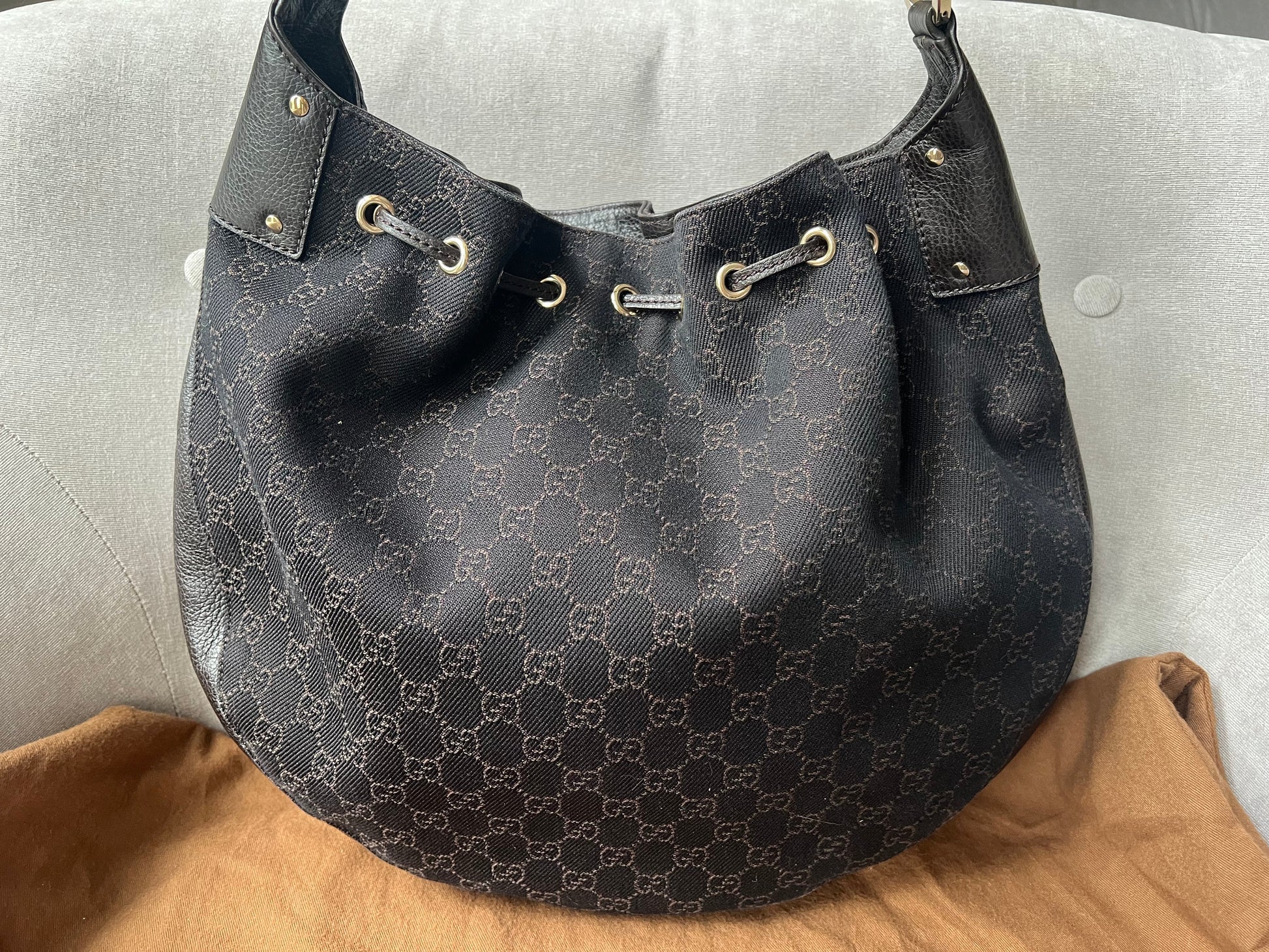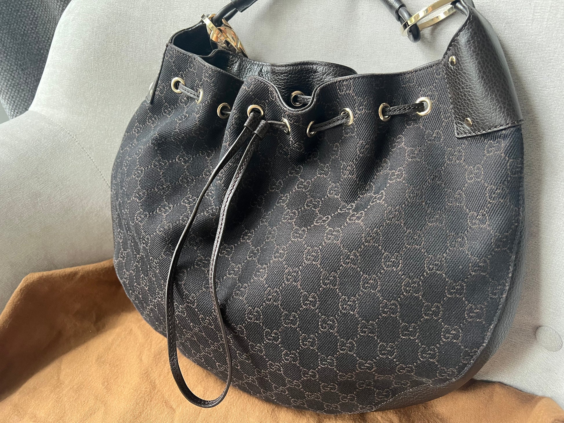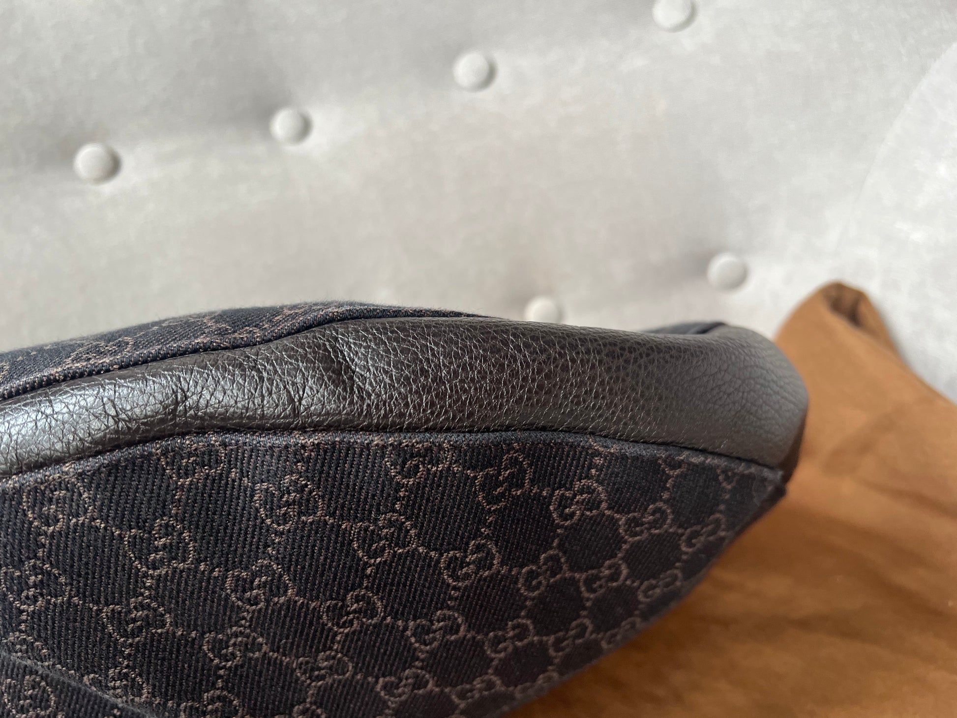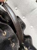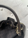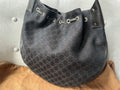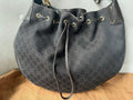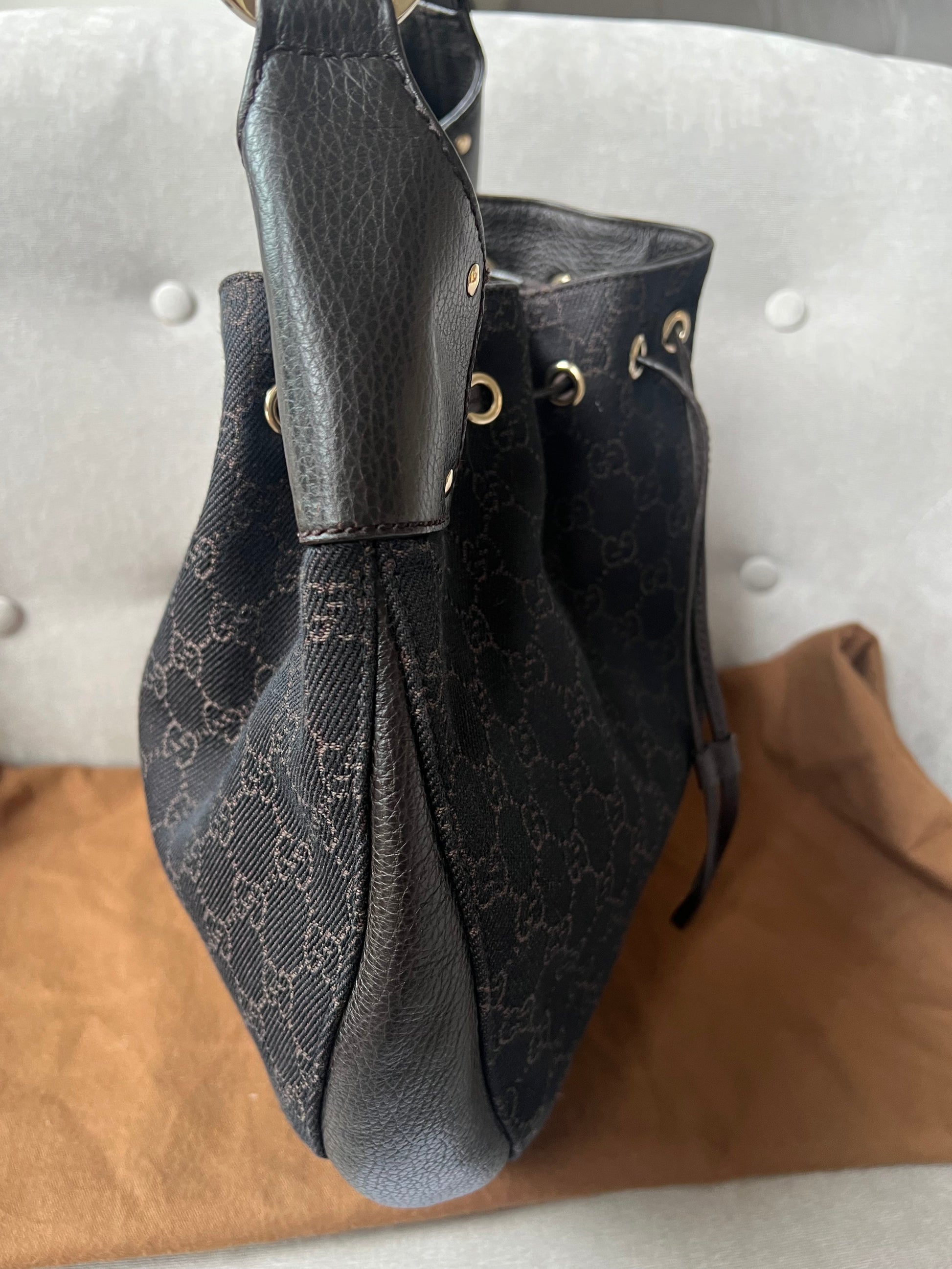 Gucci Vintage GG Tote in dark blue and brown Monogram Canvas with brown leather trim. A pale gold hardware complements the dark fabric. This large, light and practical hobo is an ideal bag for day to day use. A simple, open top with drawstring closure to help secure your belongings. Can be carried by hand, over shoulder or in the crook of the arm.