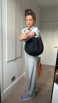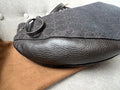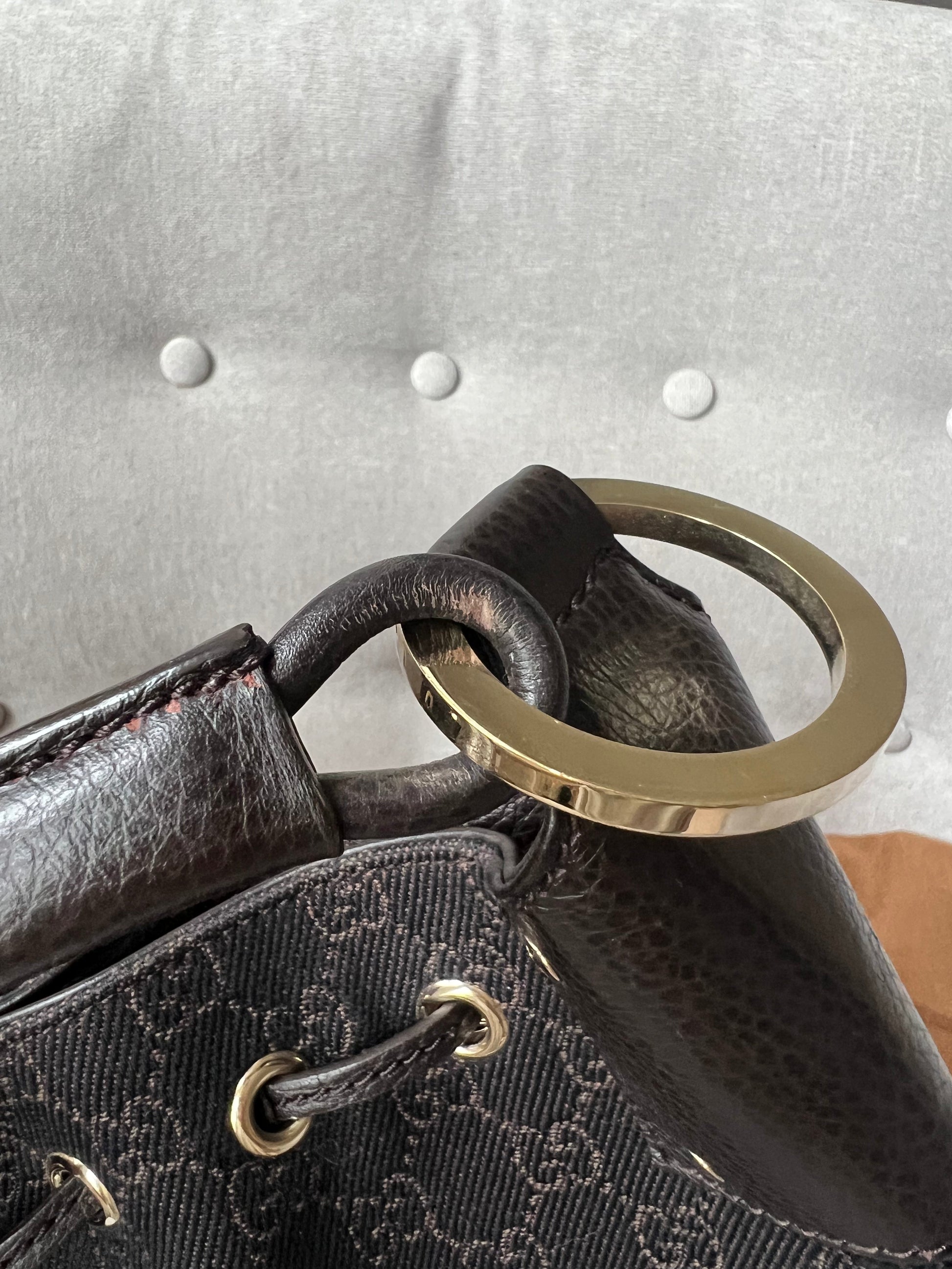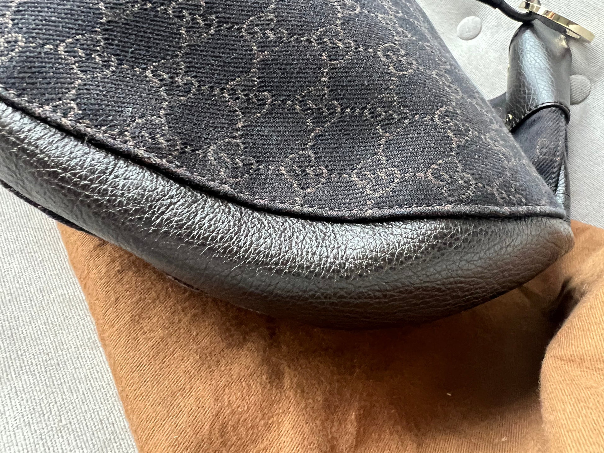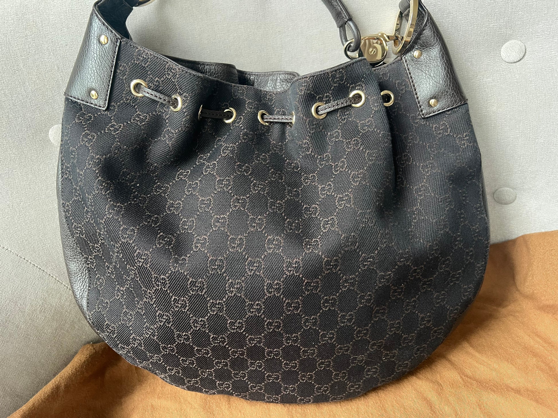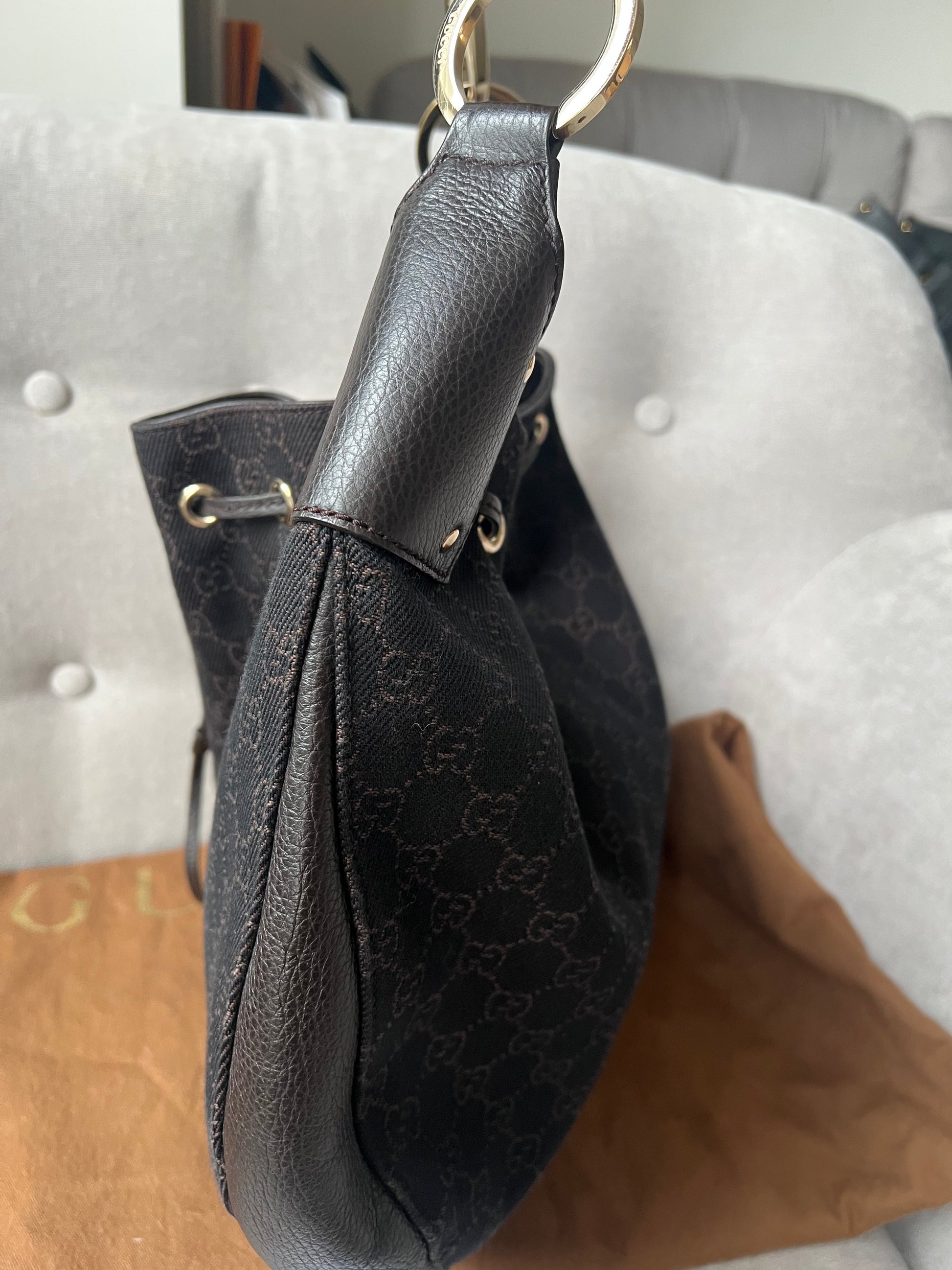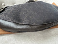 Gucci Vintage GG Tote in dark blue and brown Monogram Canvas with brown leather trim. A pale gold hardware complements the dark fabric. This large, light and practical hobo is an ideal bag for day to day use. A simple, open top with drawstring closure to help secure your belongings. Can be carried by hand, over shoulder or in the crook of the arm.