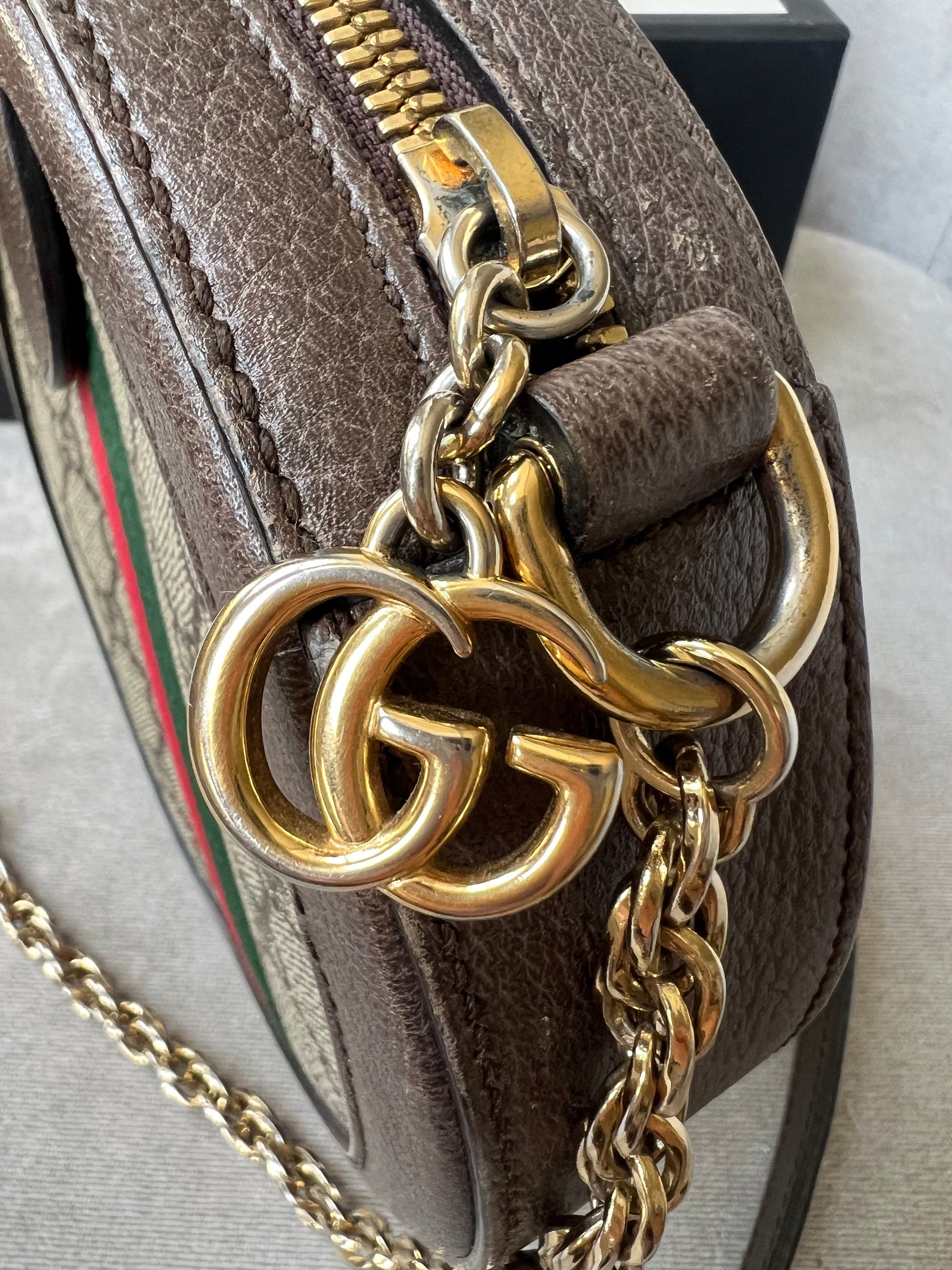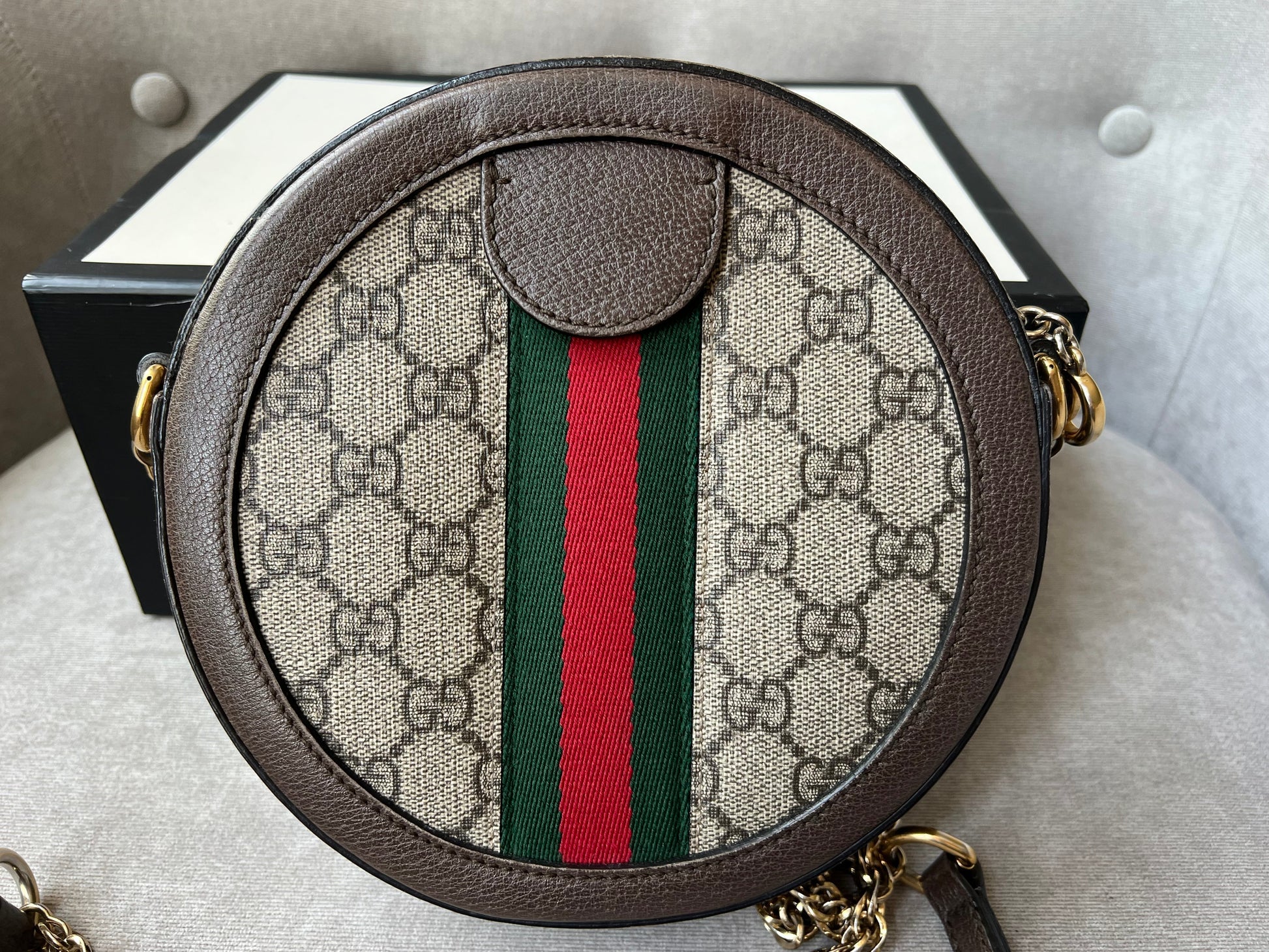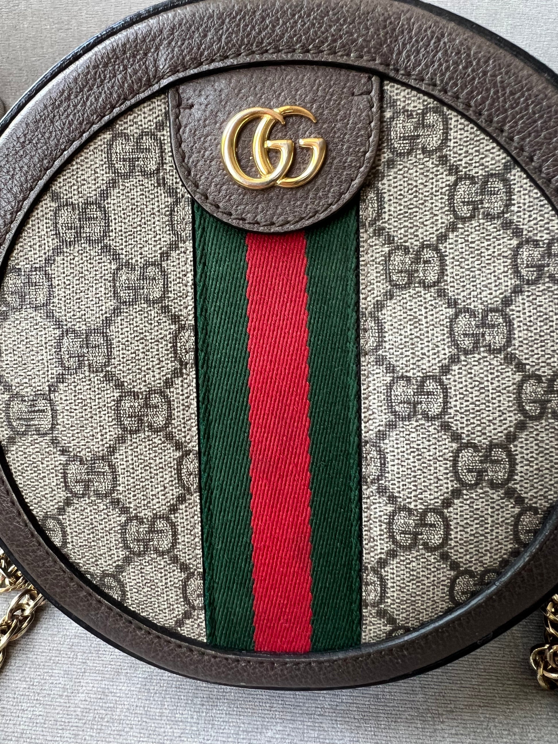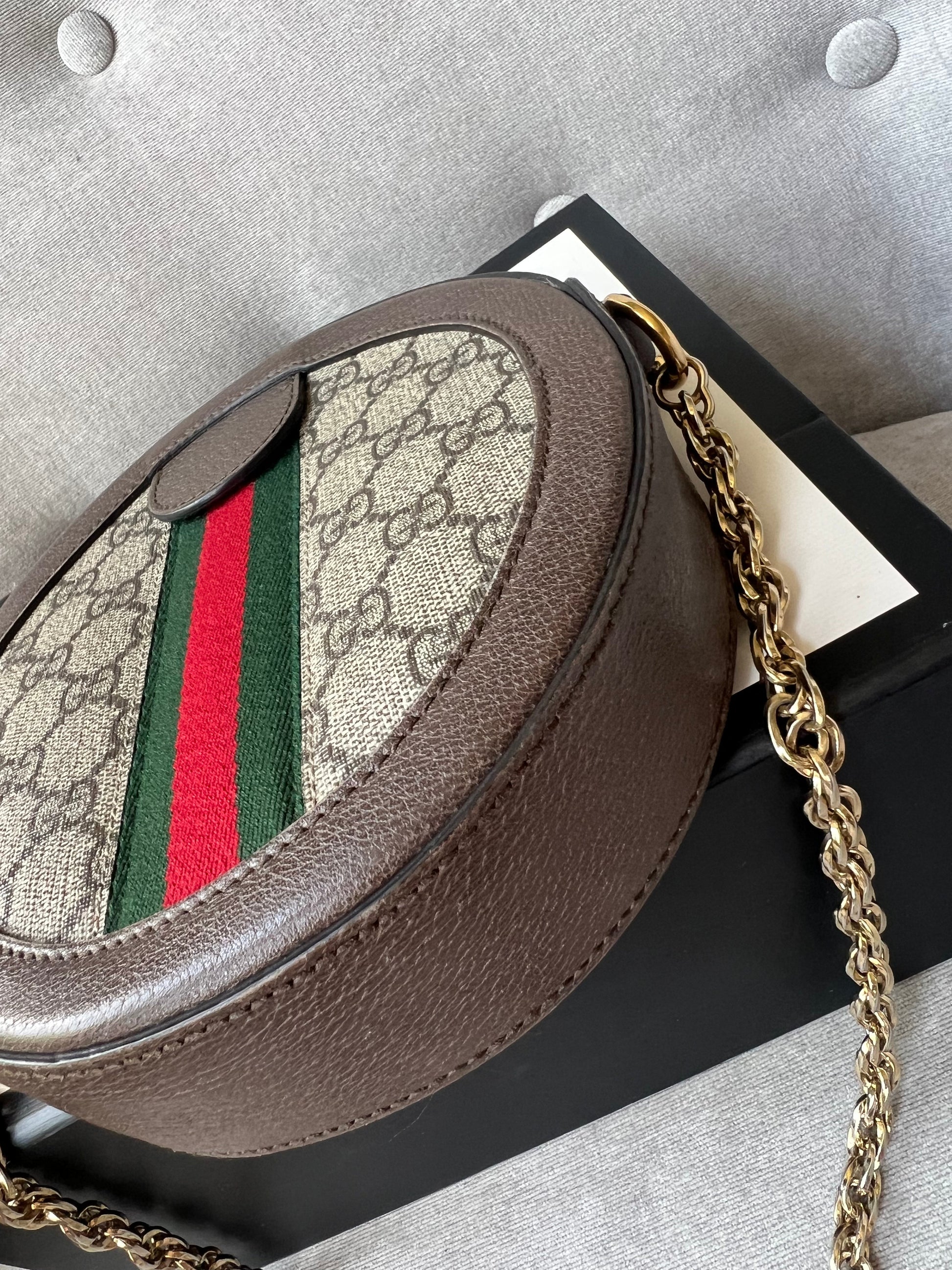 Gucci GG Ophidia Mini round shoulder bag in GG supreme canvas with inlaid green and red web stripe. This small Round chain style bag has a softly structured shape and zip top closure. Effortlessly chic and sophisticated, this style can be both with a casual outfit or for evening wear. Suitable for both day to day or occasion wear and ideal for those who prefer a cross body option.