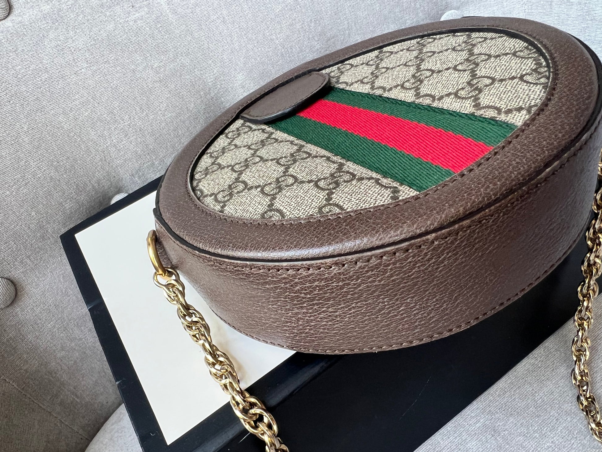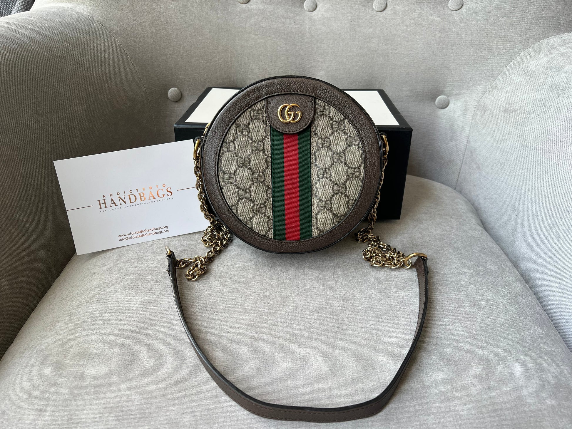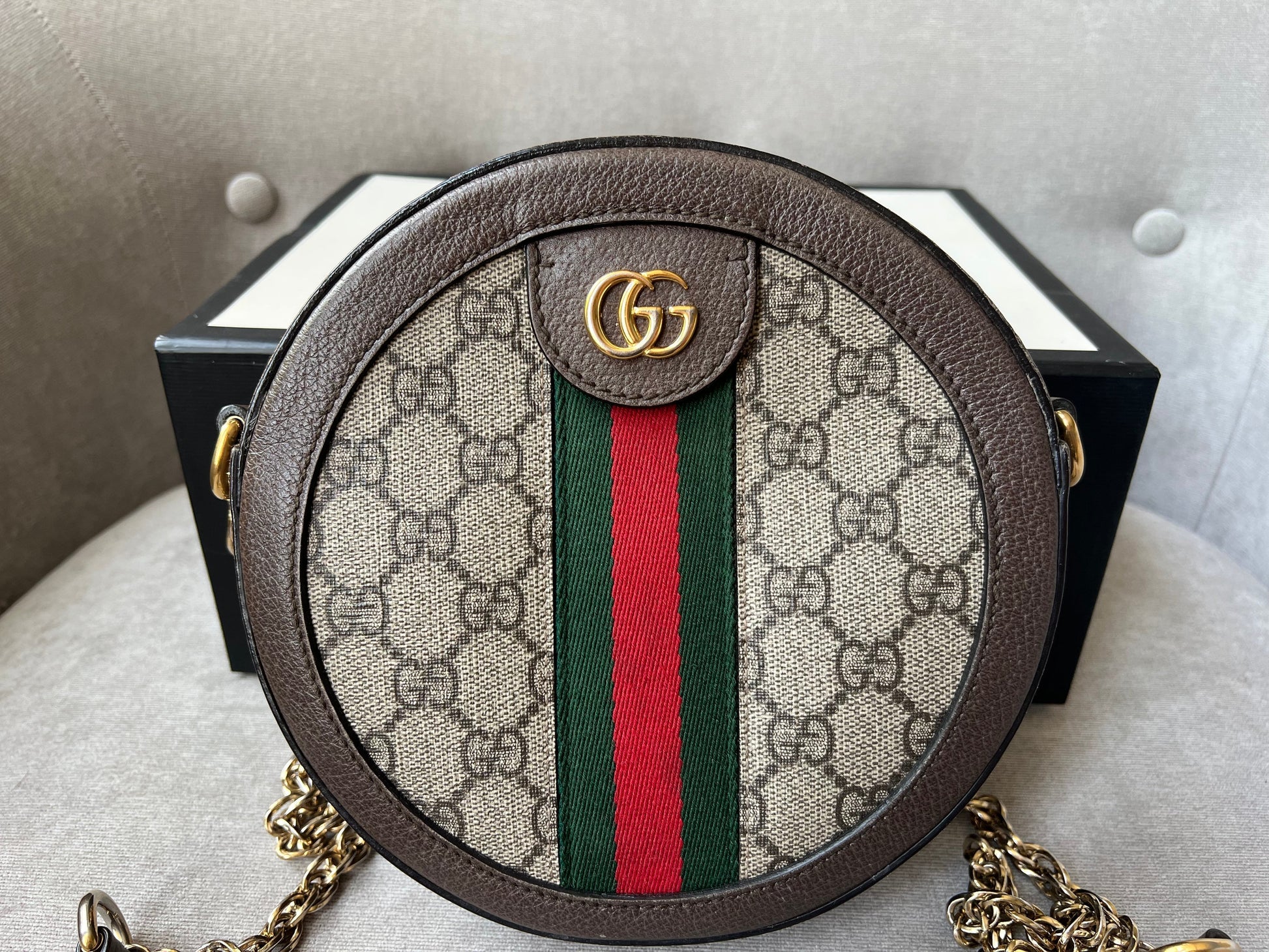 Gucci GG Ophidia Mini round shoulder bag in GG supreme canvas with inlaid green and red web stripe. This small Round chain style bag has a softly structured shape and zip top closure. Effortlessly chic and sophisticated, this style can be both with a casual outfit or for evening wear. Suitable for both day to day or occasion wear and ideal for those who prefer a cross body option.