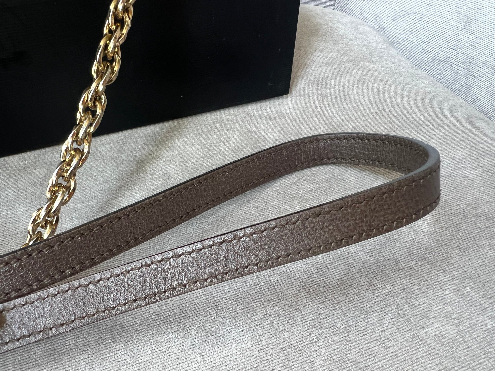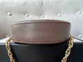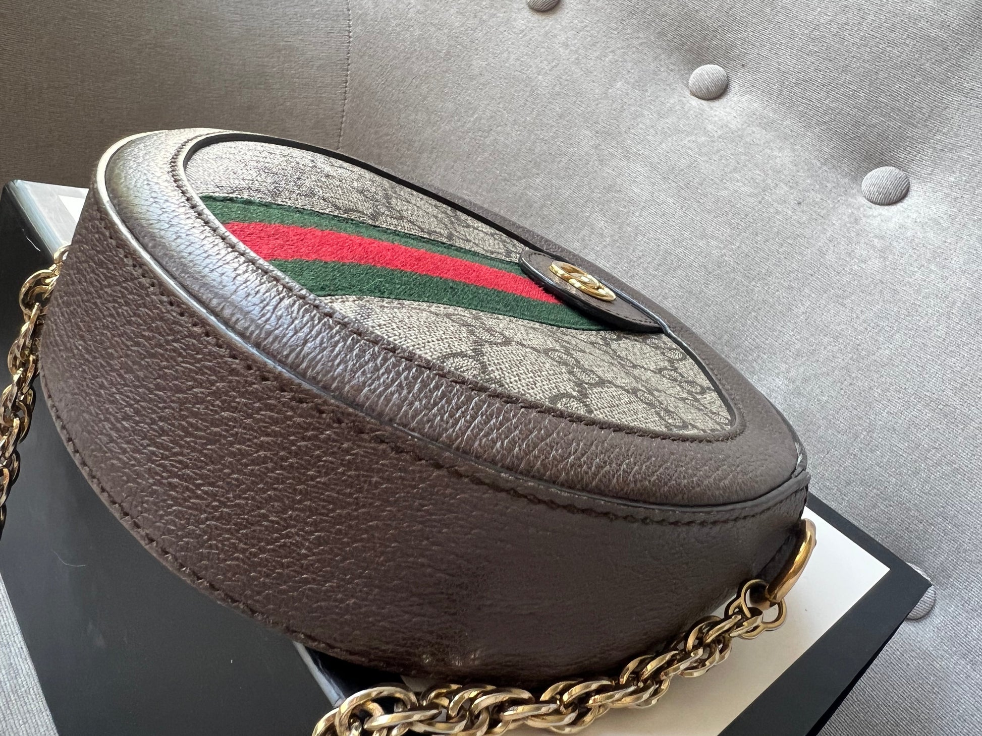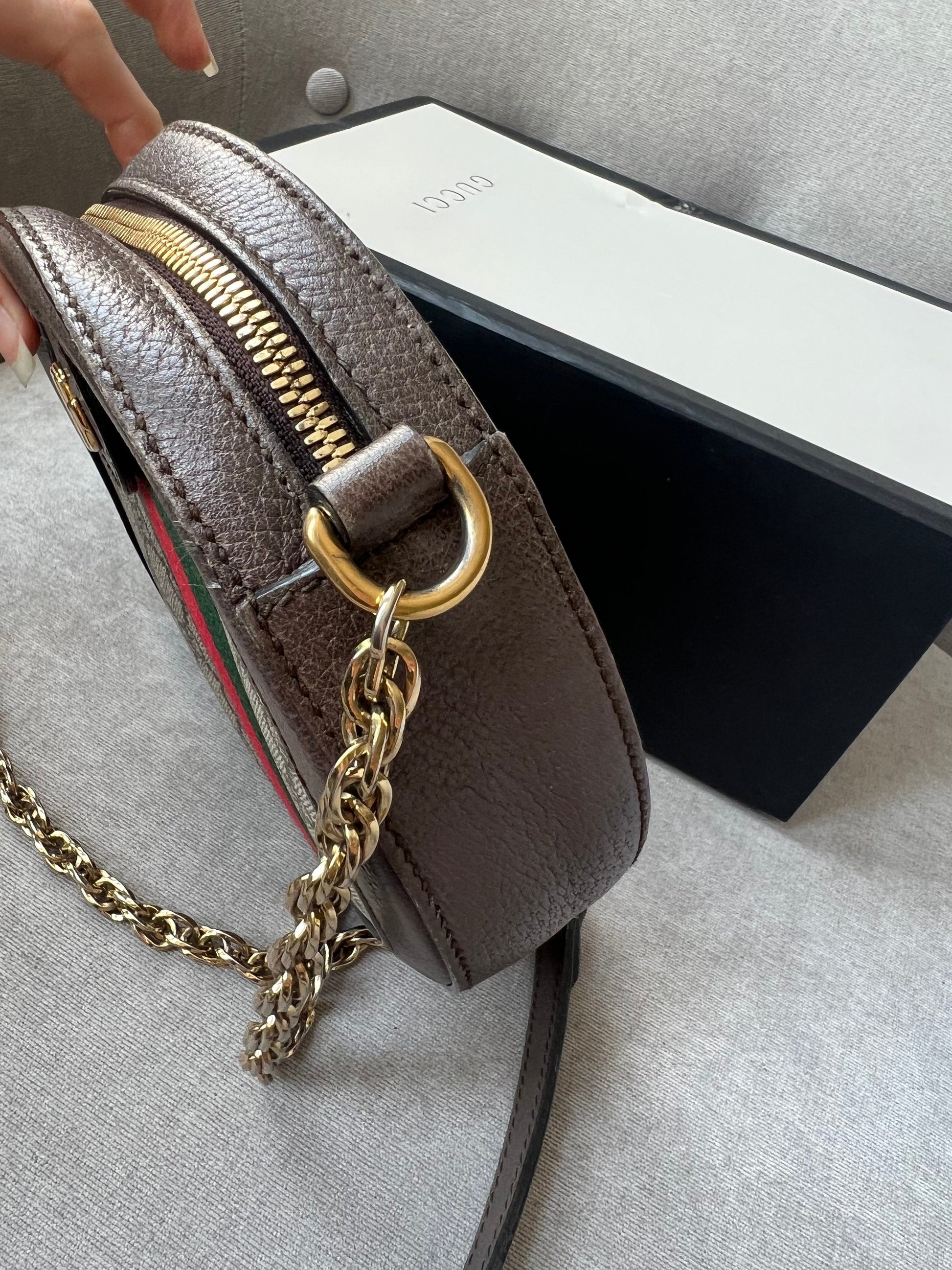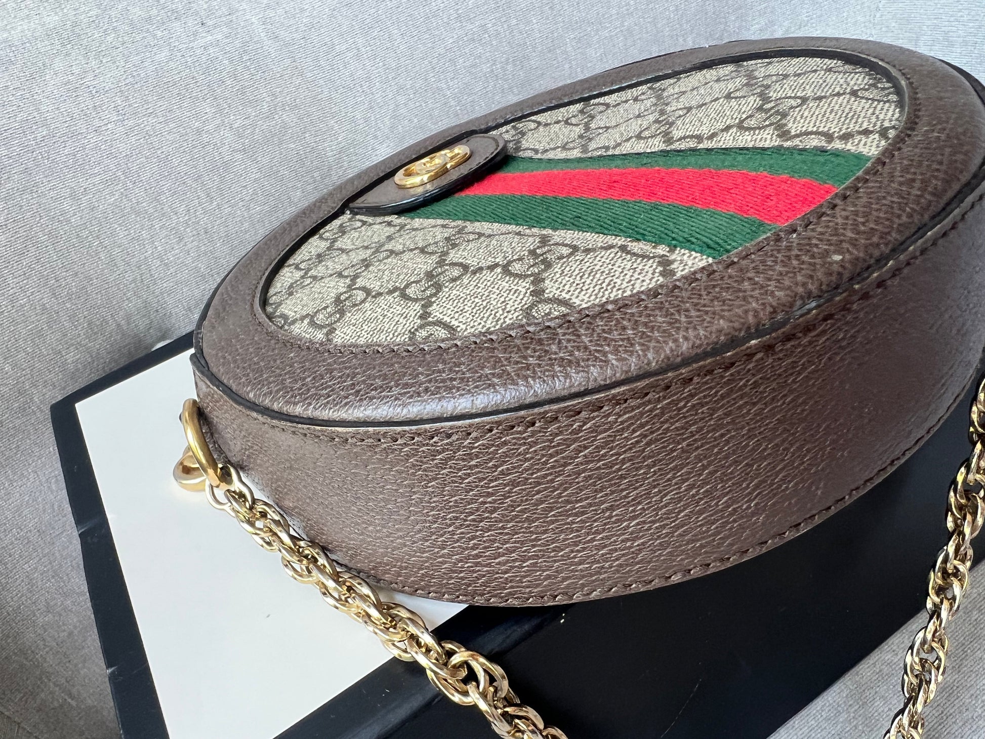 Gucci GG Ophidia Mini round shoulder bag in GG supreme canvas with inlaid green and red web stripe. This small Round chain style bag has a softly structured shape and zip top closure. Effortlessly chic and sophisticated, this style can be both with a casual outfit or for evening wear. Suitable for both day to day or occasion wear and ideal for those who prefer a cross body option.