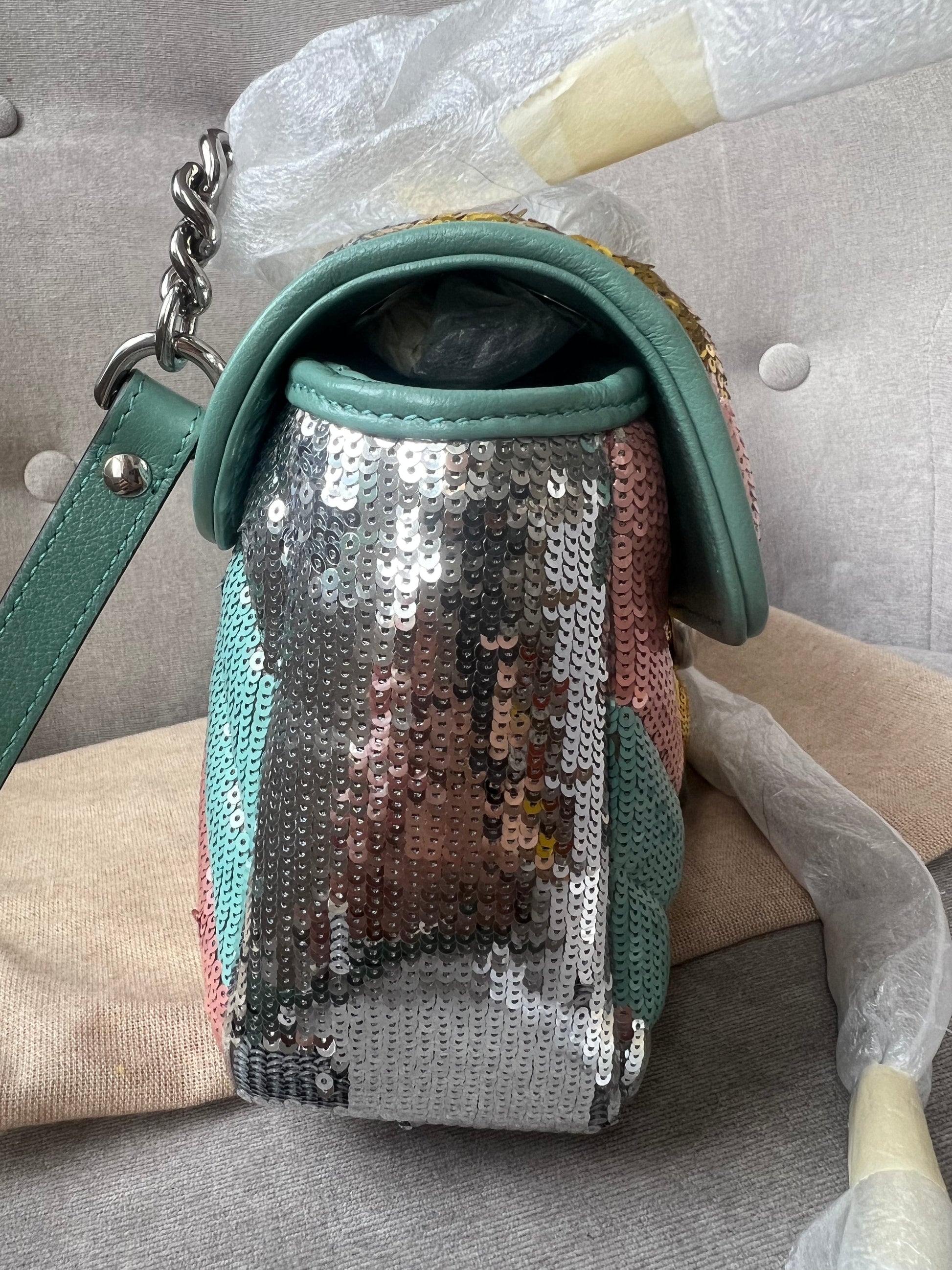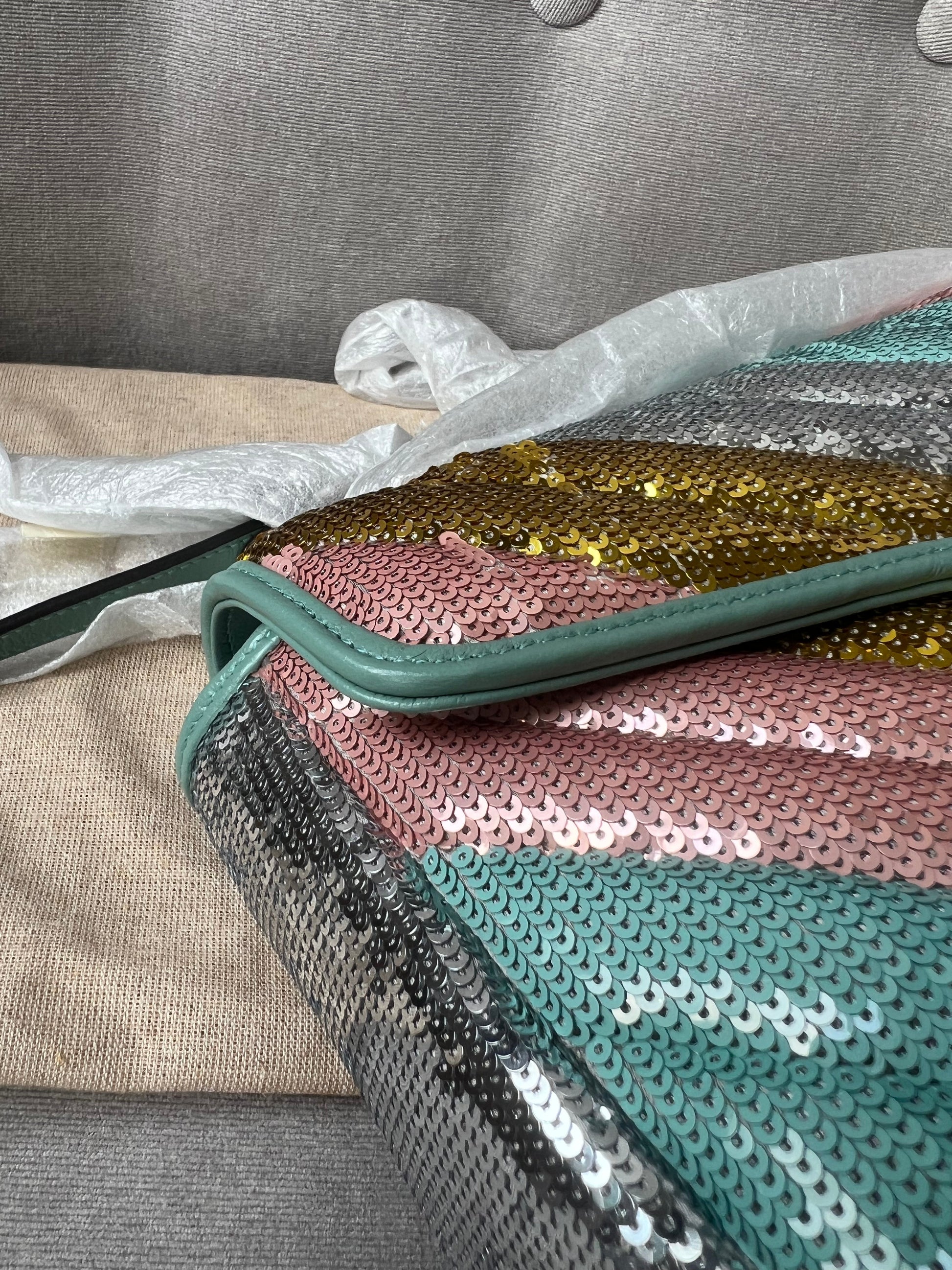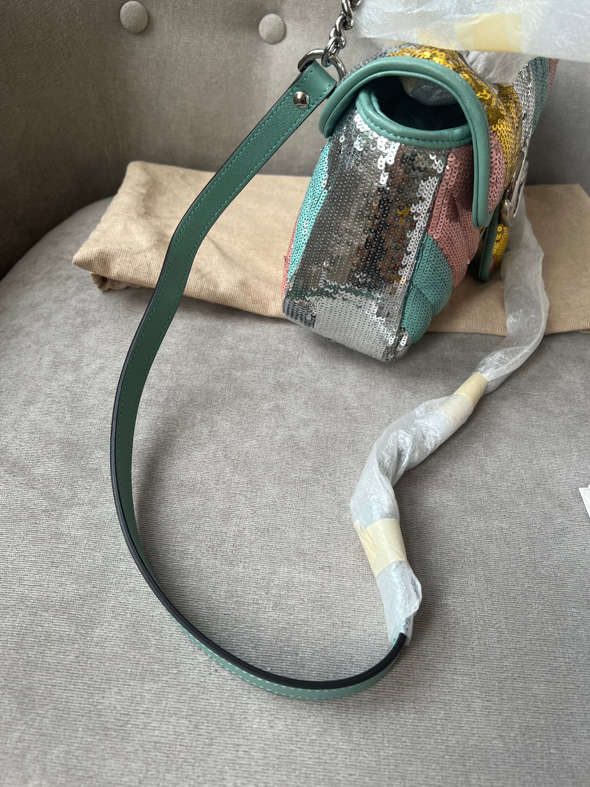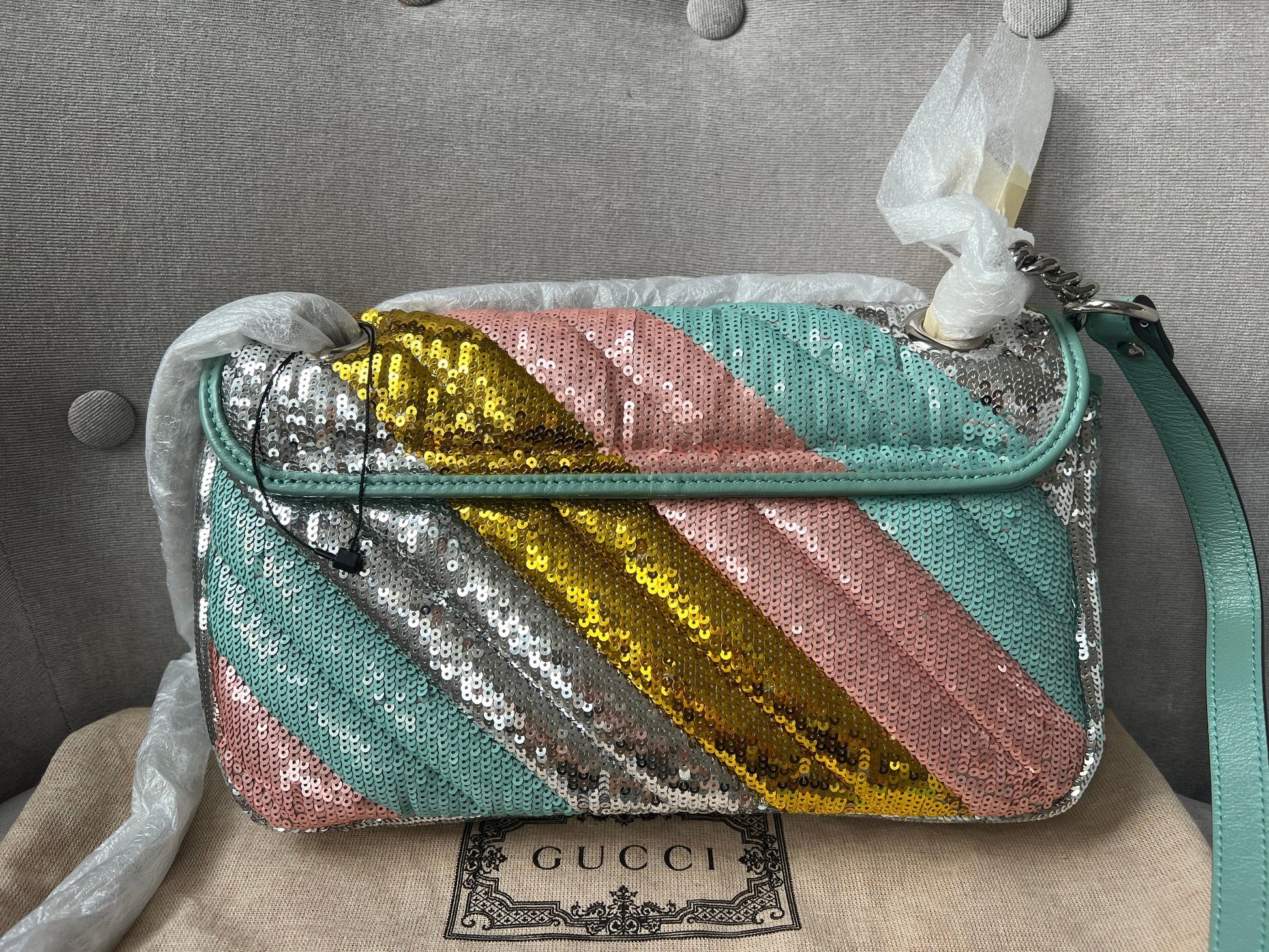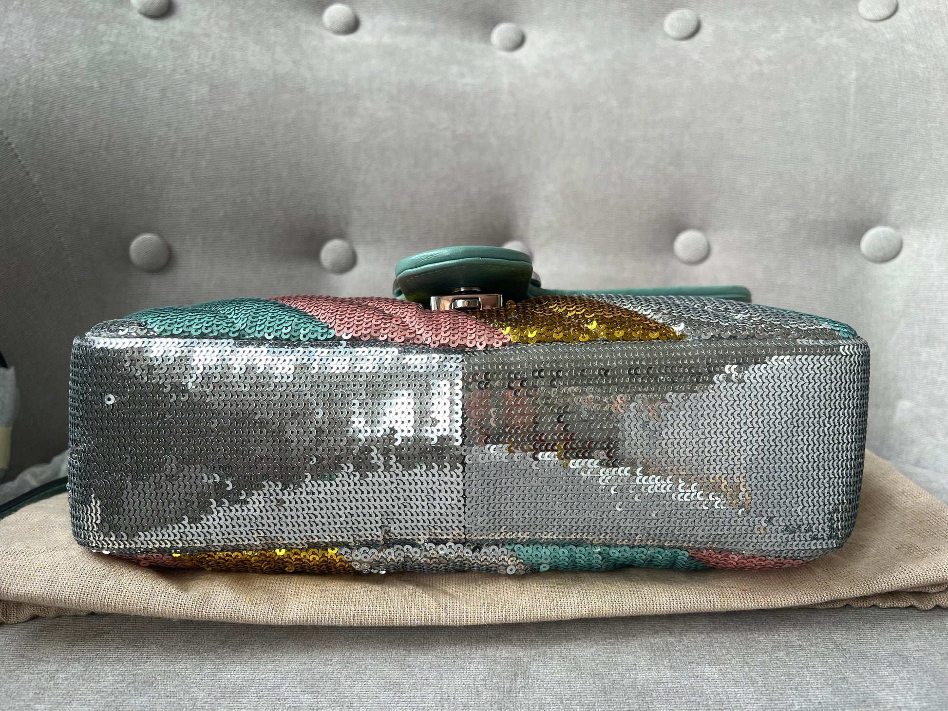 Gucci GG Marmont small shoulder bag in multi colour chevron sequins with gold hardware. This small Marmont bag has a softly structured shape and an oversized flap. The sliding chain can be multiple ways either doubled up or lengthened. Effortlessly chic and sophisticated, this style can be both with a casual outfit or for evening wear. Suitable for both event or occasion wear and ideal for those who prefer a cross body option. This sequin Marmont does not come up often . Perfect for party or event wear as it is a statement piece.