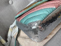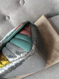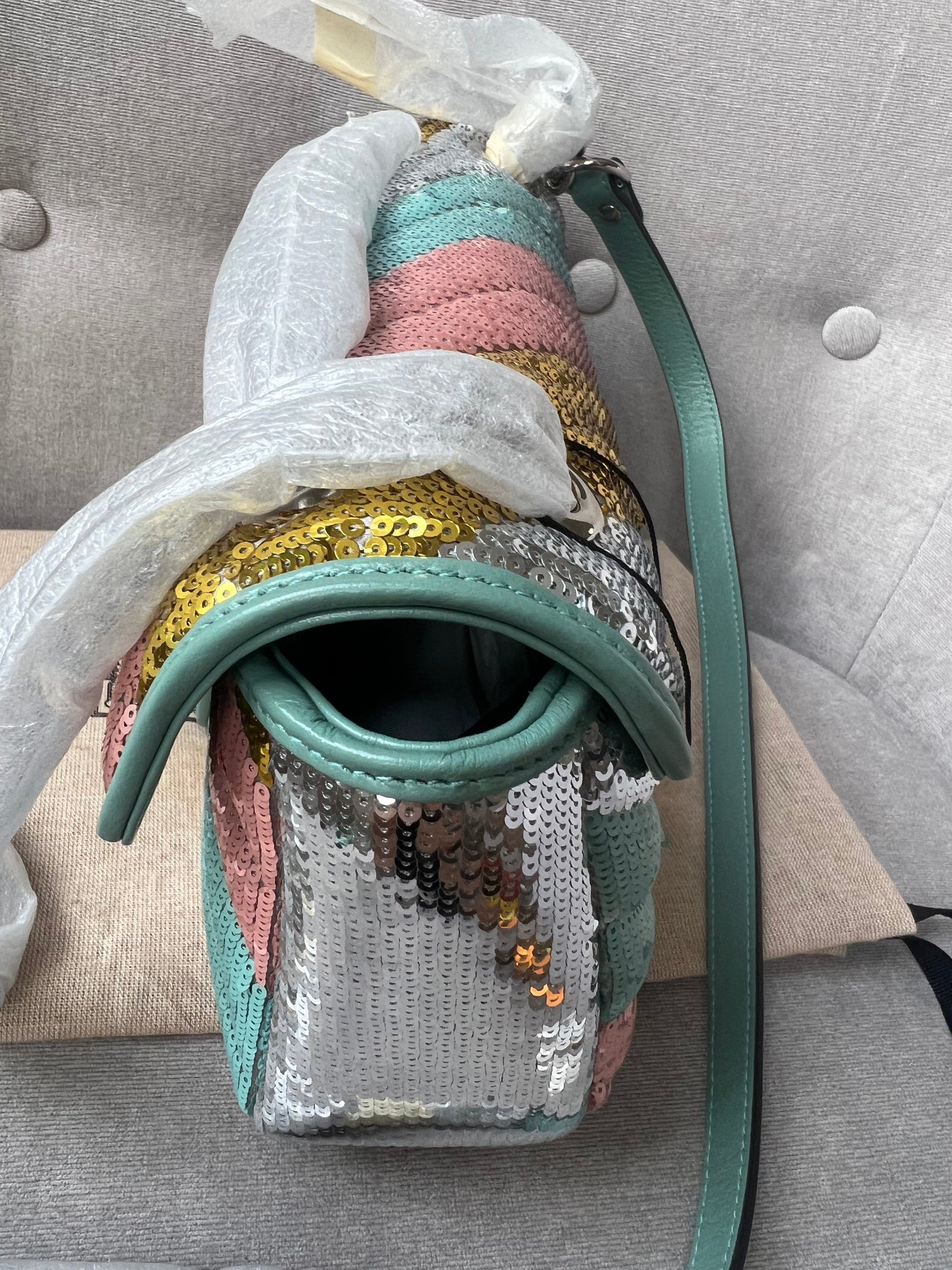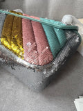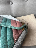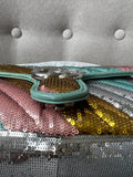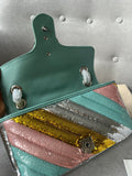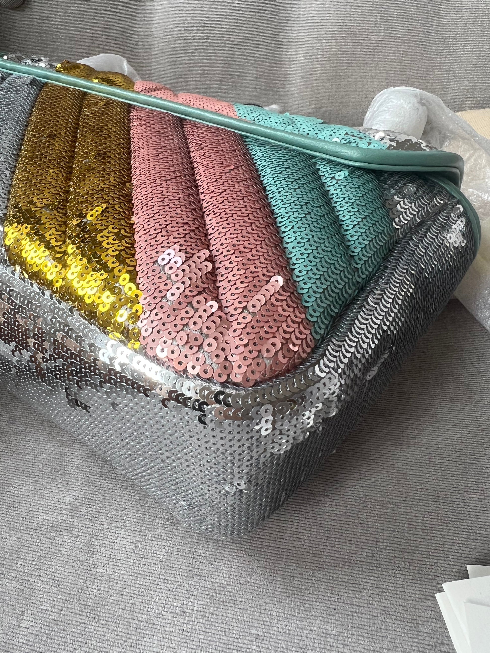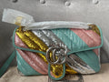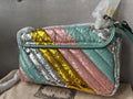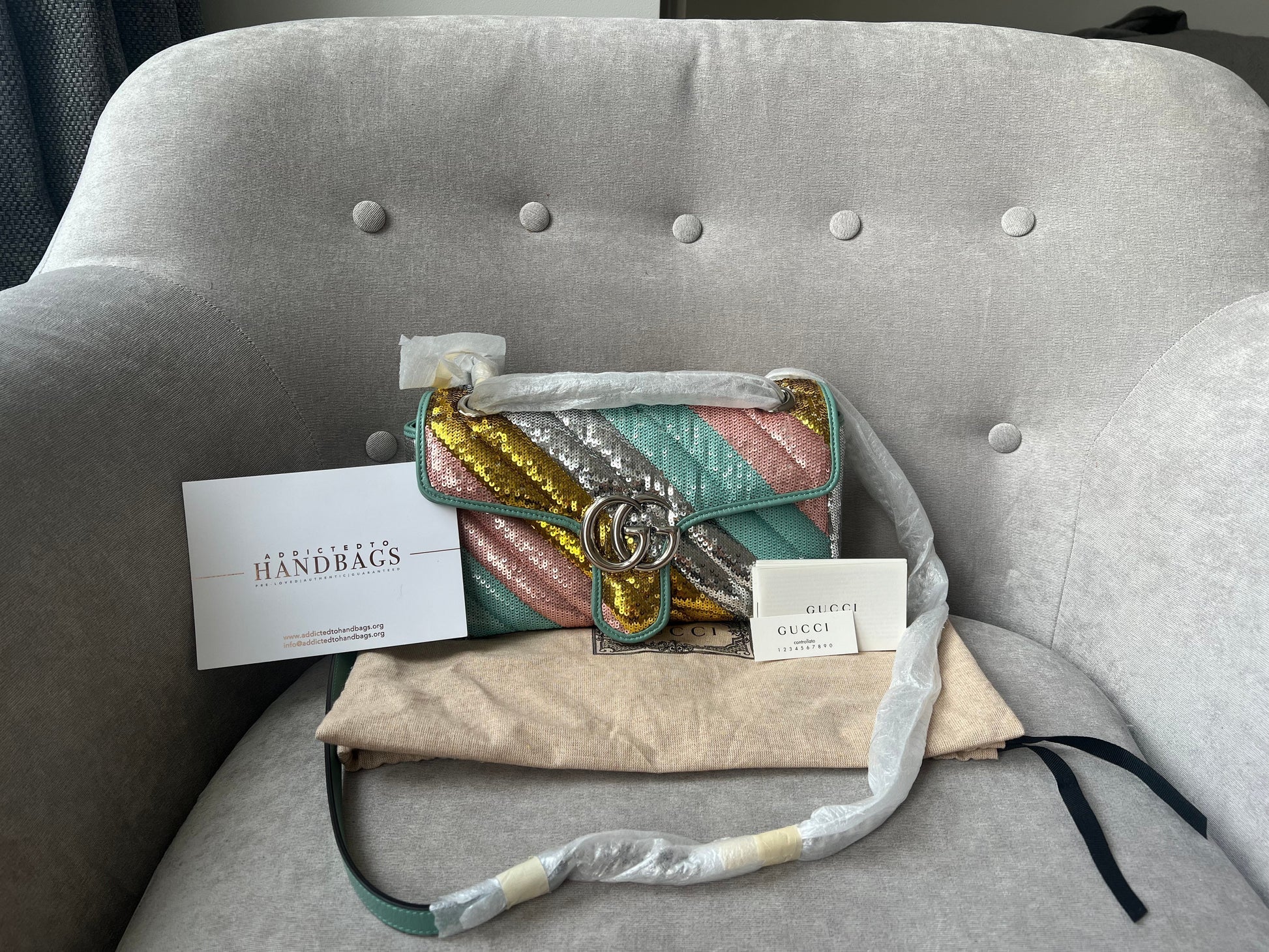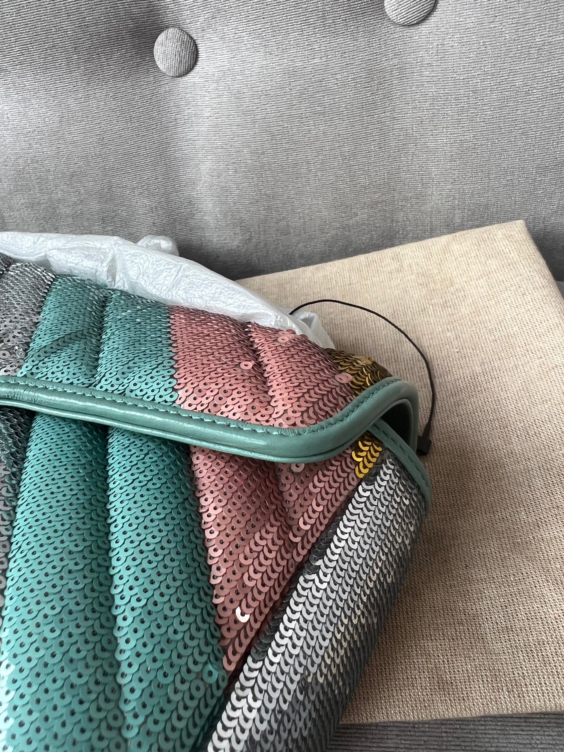 Gucci GG Marmont small shoulder bag in multi colour chevron sequins with gold hardware. This small Marmont bag has a softly structured shape and an oversized flap. The sliding chain can be multiple ways either doubled up or lengthened. Effortlessly chic and sophisticated, this style can be both with a casual outfit or for evening wear. Suitable for both event or occasion wear and ideal for those who prefer a cross body option. This sequin Marmont does not come up often . Perfect for party or event wear as it is a statement piece.