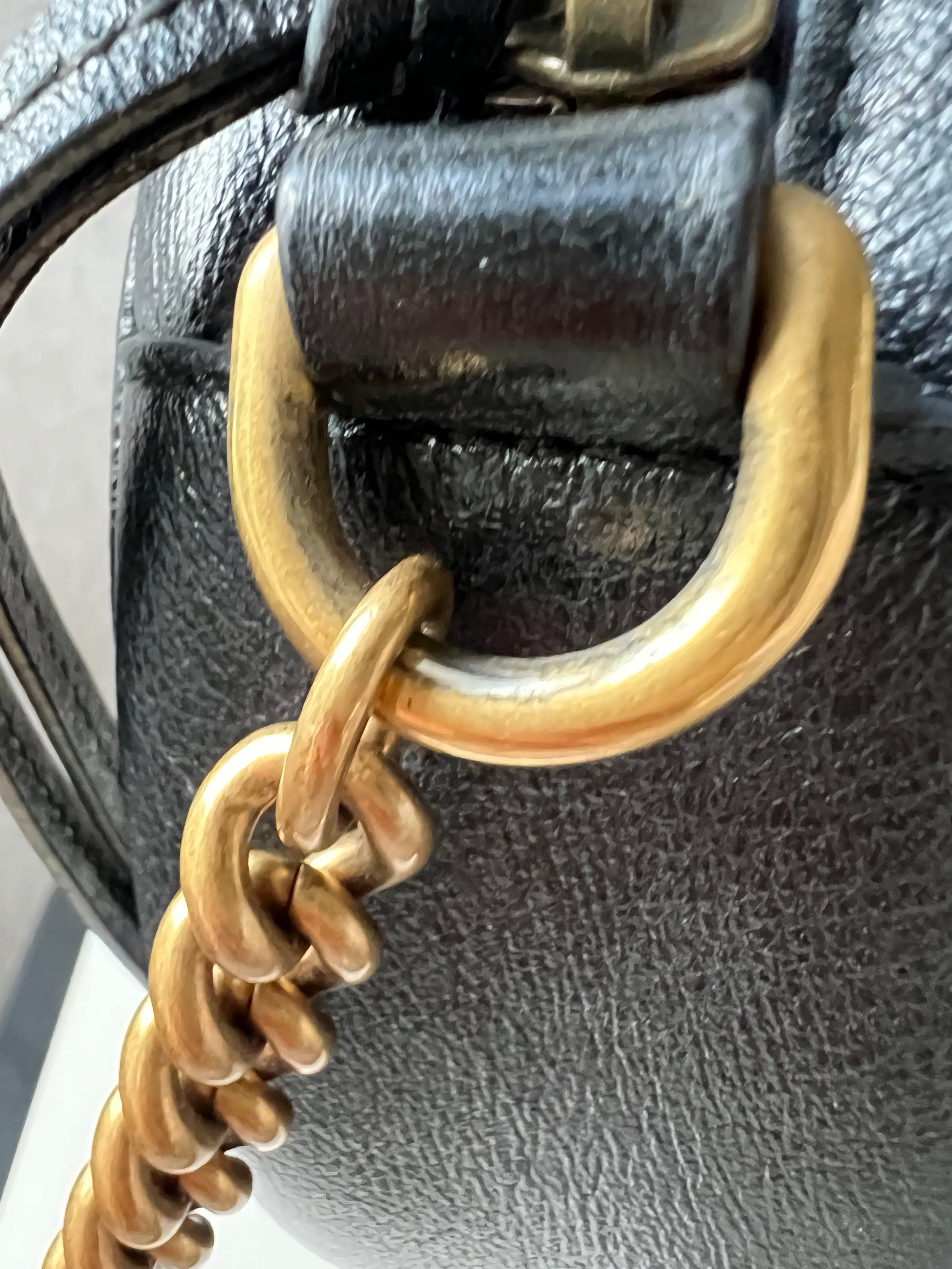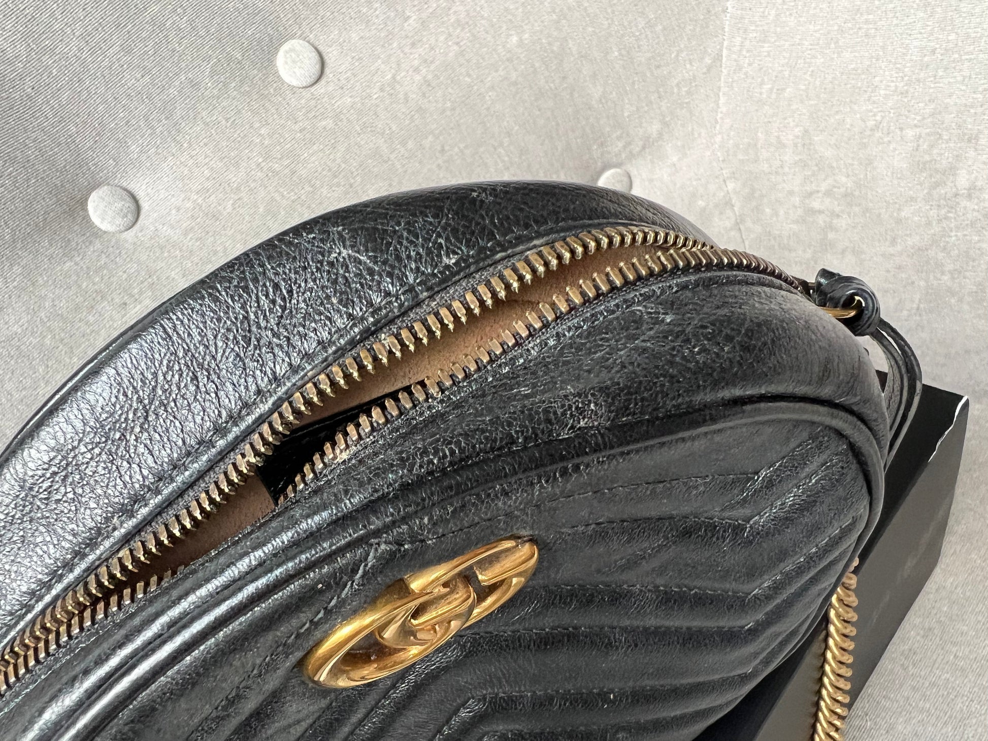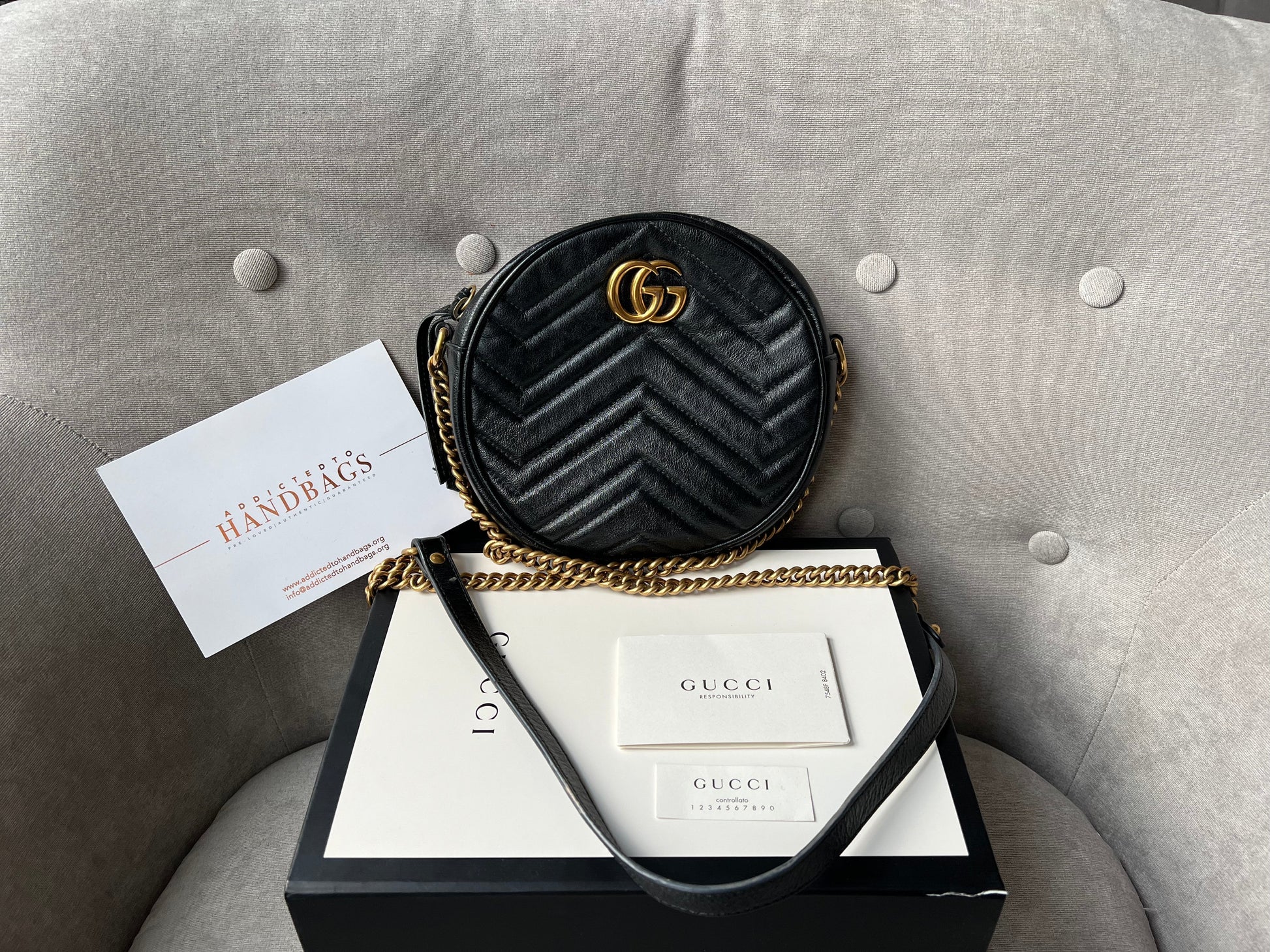 Gucci GG Marmont Mini round shoulder bag in black chevron quilted leather with gold hardware. This small Marmont chain style bag has a softly structured shape and zip top closure. Effortlessly chic and sophisticated, this style can be both with a casual outfit or for evening wear. Suitable for both day to day or occasion wear and ideal for those who prefer a cross body option.