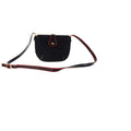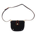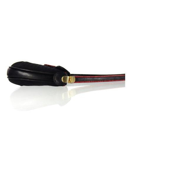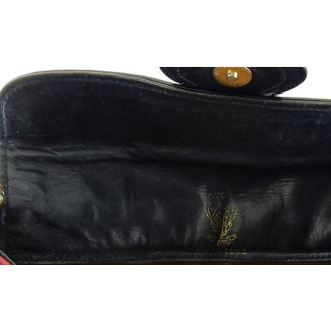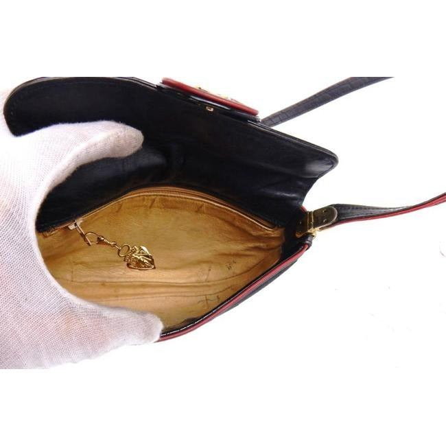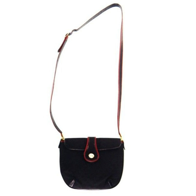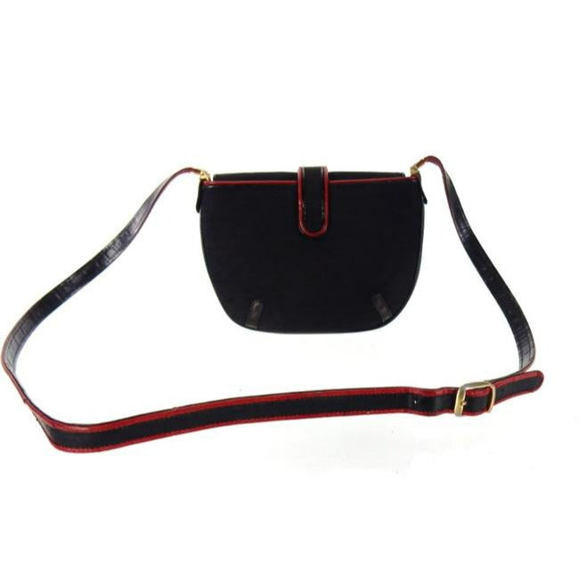 This purse is an unusual version of a cross body with amazing attention to detail! The bag is made of the micro Guccissima print canvas in black and a long, black leather shoulder strap with red leather framing it! There are other areas with the red and black trim accents. It is a classic, rounded shape with an envelope flap top and a strap that snaps as the closure. It has leather framing the purse and as the sides, bottom, strap and piping and top and an exterior pocket on the back.