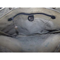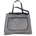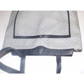 The bag is an unusual style, two handle, tote or satchel style purse by GUCCI. It is made from blue/grey coated canvas with the small Gucci, double 'G' logo in navy and navy leather. It has a double snap top closure with two, leather handles and a front pocket. The interior has peeled to its felt base, but is in excellent overall condition with an interior zip pocket.