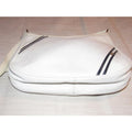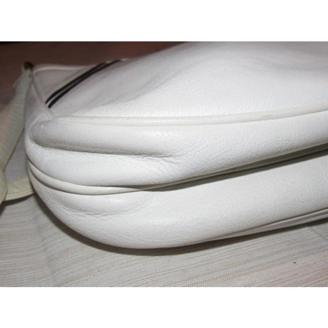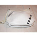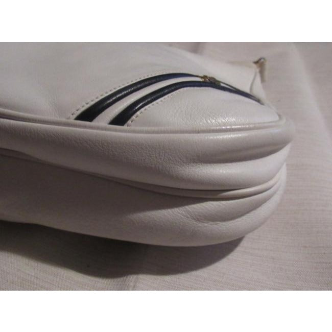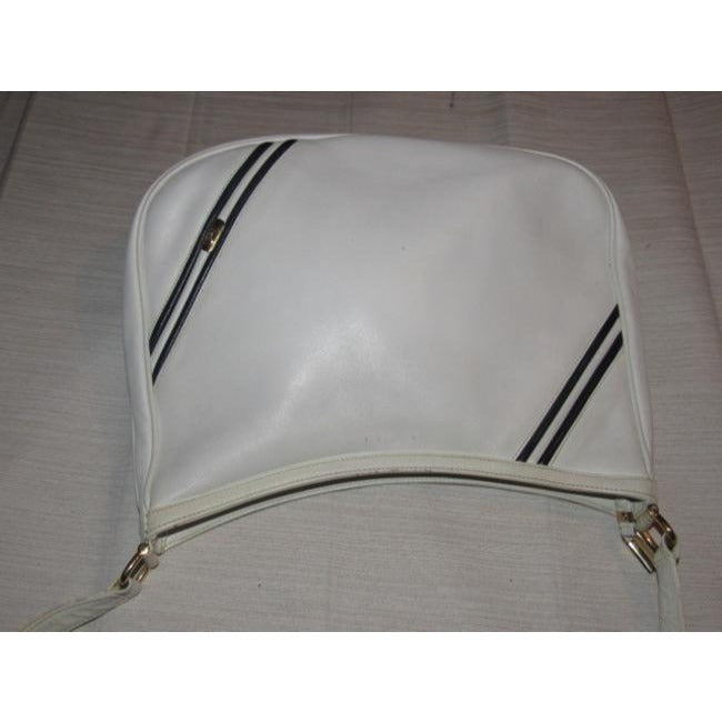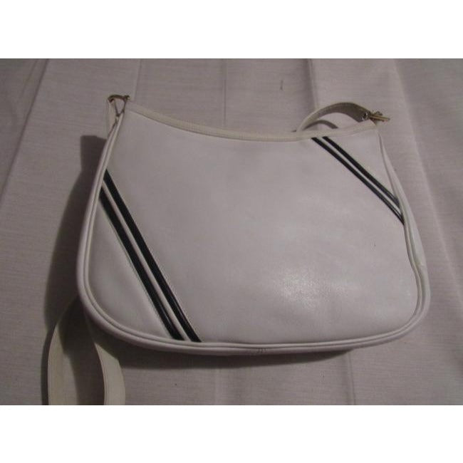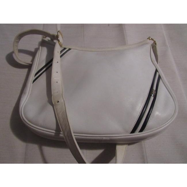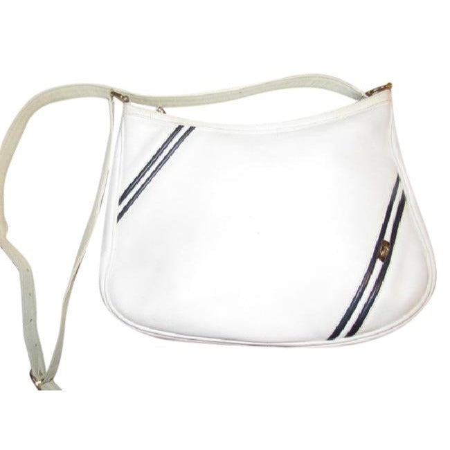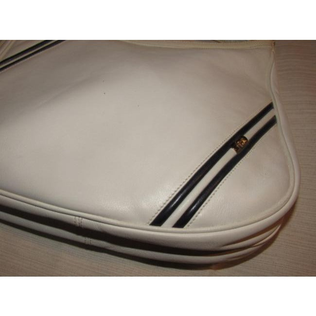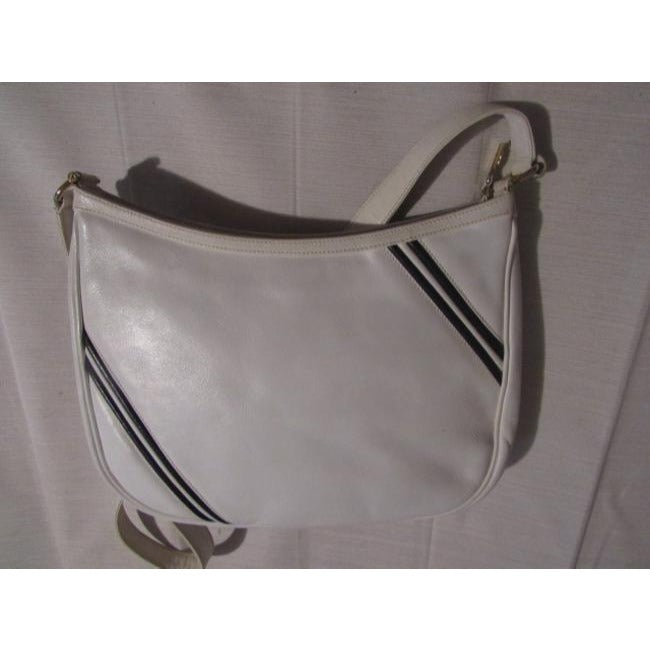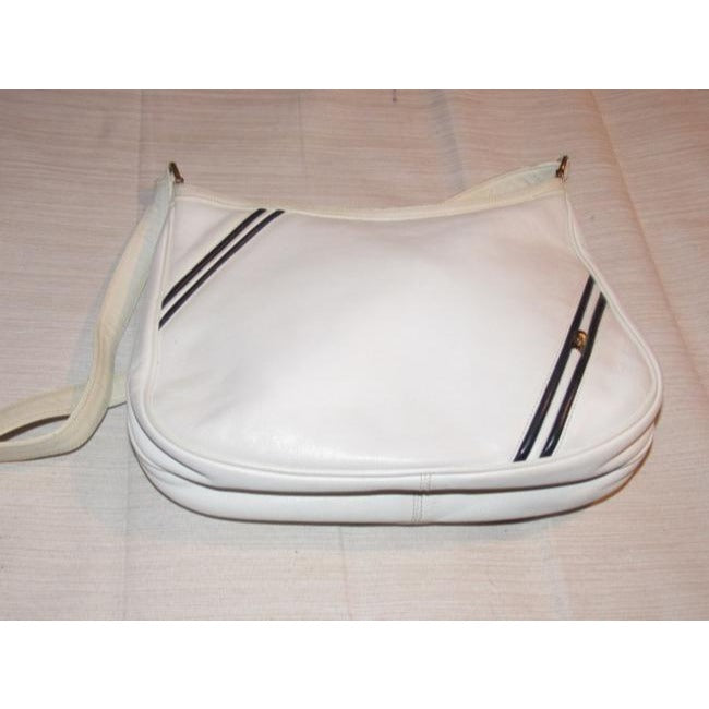 For sale is a vintage, Gucci, white leather with navy accent leather stripes shoulder bag! A quality classic from Gucci that will be the only white/nautical look purse you will need!