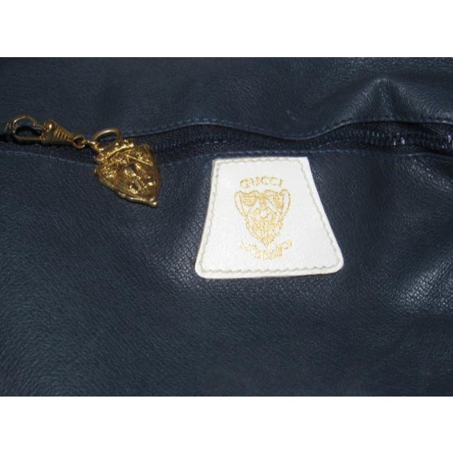 Inside, it has a navy blue leather lining and a leather, triangular, gold embossed Gucci crest and pre-dates serial #s. It is from, I think, the late 1970's and by Gucci. It has all of the details an authentic Gucci should, like the YKK zipper, the 'R' in a copyright style circle, bamboo shaped, gold tone fobs, & the Gucci/Italy/GG stamp on the hardware, so buy with confidence! It has been authenticated by a third party expert so buy with confidence!