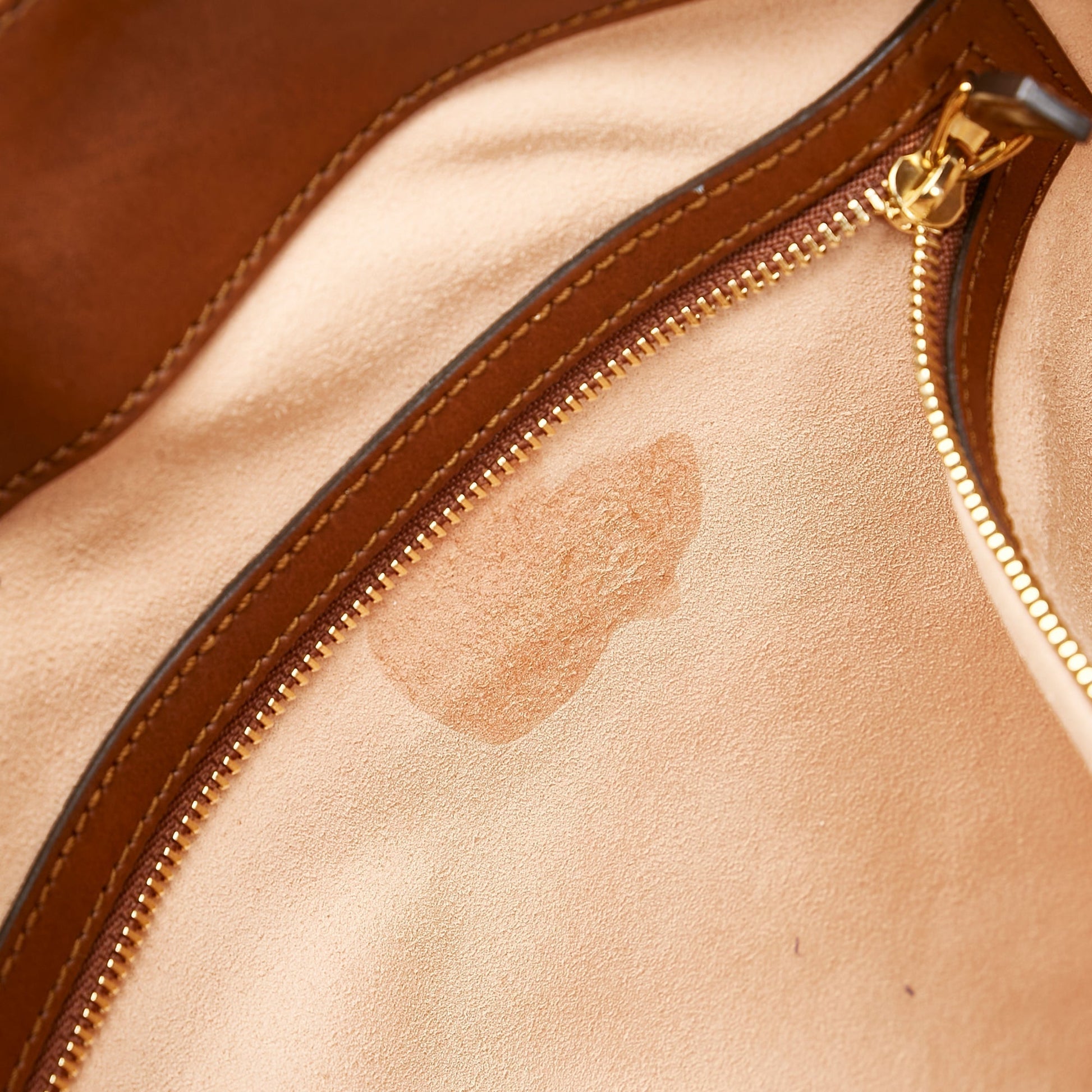 This satchel features a coated canvas body, flat leather handles, a detachable flat leather strap, an open top with a magnetic closure, and interior zip and slip pockets.