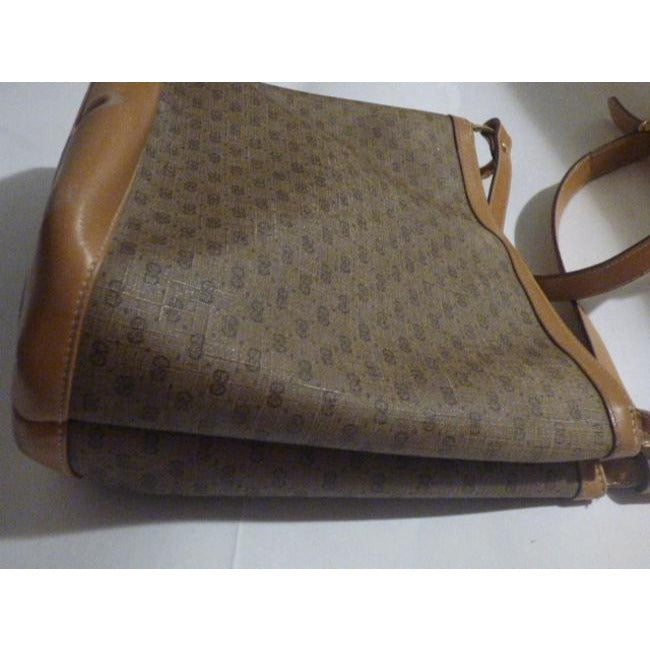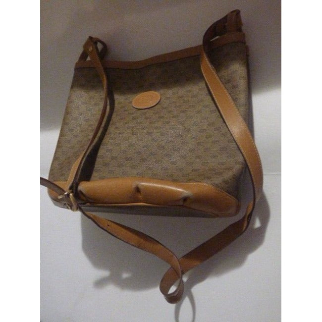 The bag is the perfect roomy bag by Gucci that is in a great color combination! The exterior is a brown small G logo coated canvas and leather with gold hardware. The purse snaps along the top to close. The purse is a large size and can hold quite a bit because of the compartments and wide bottom!!