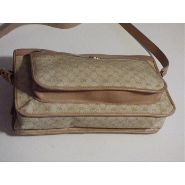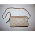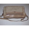 This purse is designed in such a smart, organized fashion! The bag is a larger, shoulder style purse. It is rectangular with an exterior zip pocket. The purse is made of coated canvas & leather with the small, double 'G' design in tan or a light brown against the lighter ivory colored purse. The strap has side buckle settings that can be adjusted. The strap, trim, sides around the zip top, and other accents are leather and in great condition!