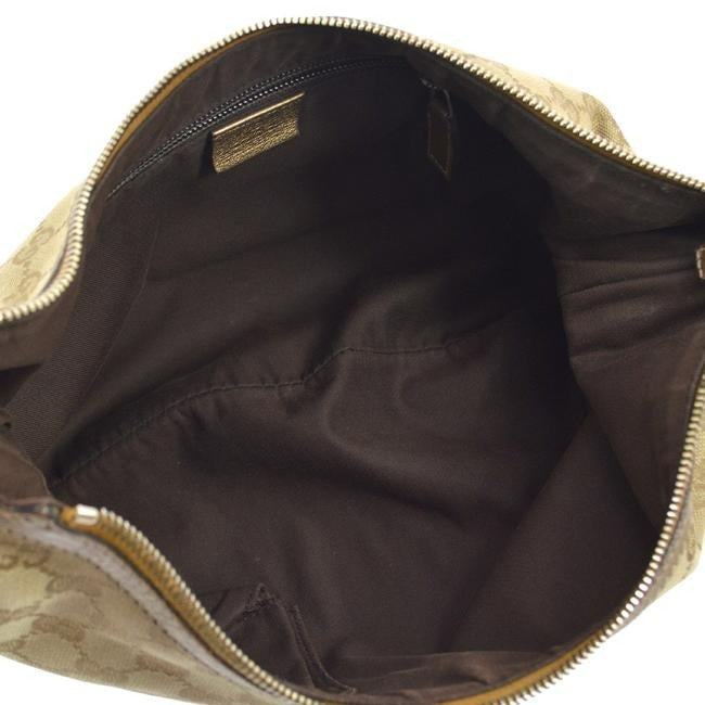 The bag is a large, hobo style purse with a strap that allows it to be worn as a shoulder or cross body purse. The purse has the large, 'G' logo design in a light brown canvas and gold leather and the hardware is chrome. It has a wide, pink and gold or tan canvas strap, giving it a more sporty look. It has a brown fabric lining and one interior compartments with an interior pocket