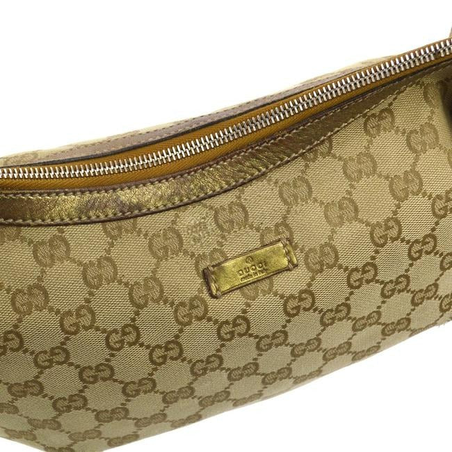 For sale is a Gucci, light brown large G logo print canvas & gold leather, extra large, hobo style, shoulder or cross body purse with a pink & gold/tan wide strap and gold leather accents! It is a classic style that would be great used as a purse for everyday or as your go to metallic accent bag!