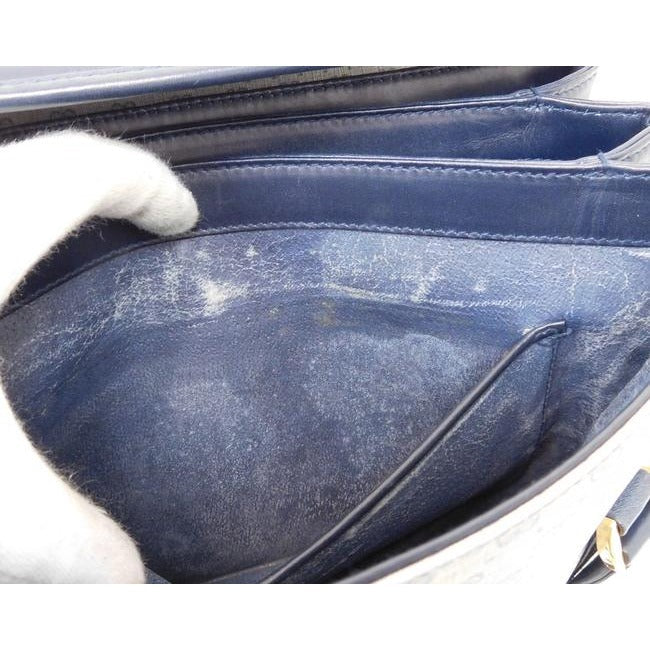 The bag is a large satchel with envelope top, shoulder, satchel style purse with two longer straps. There is an exterior pocket on the back. This purse is designed in such a smart style! The purse is made of navy blue micro Guccissima print coated canvas and navy leather.