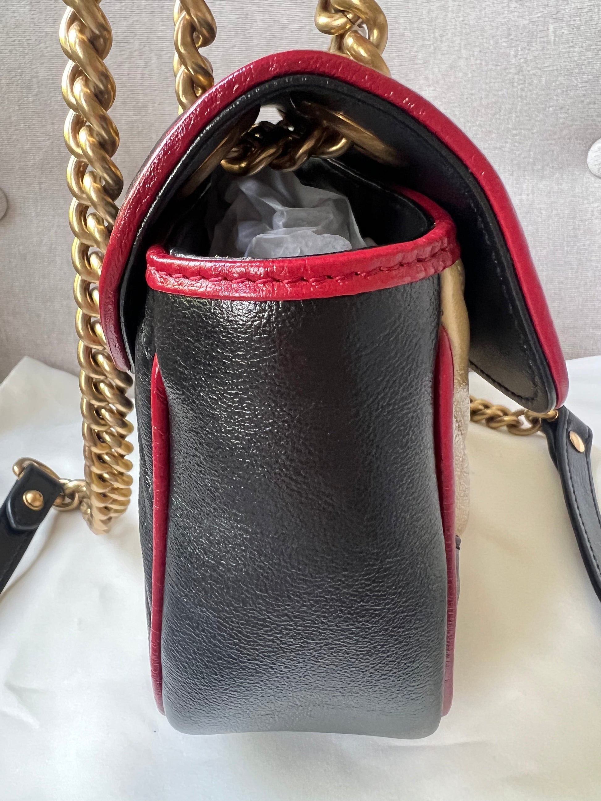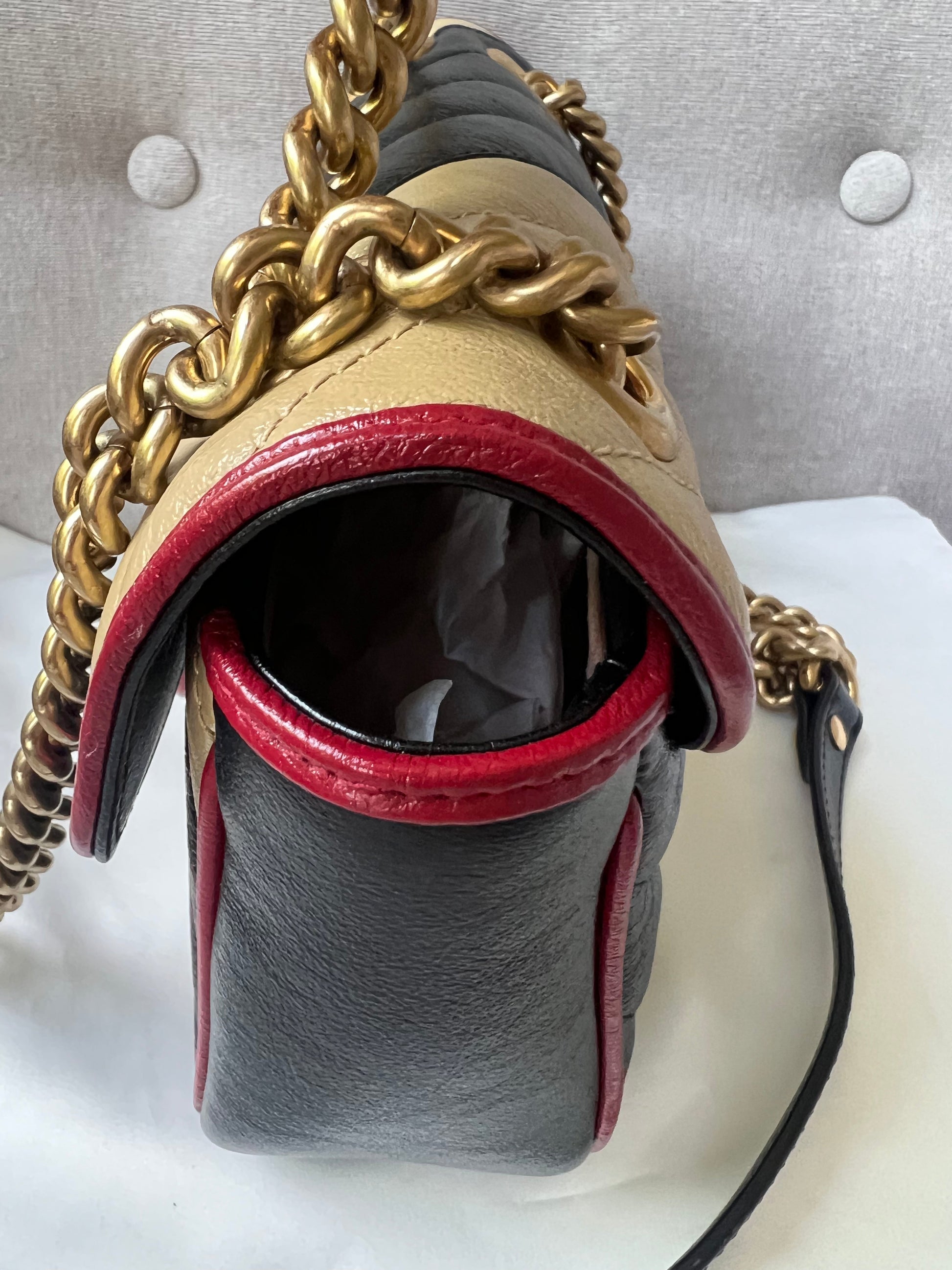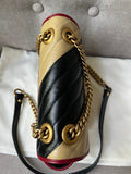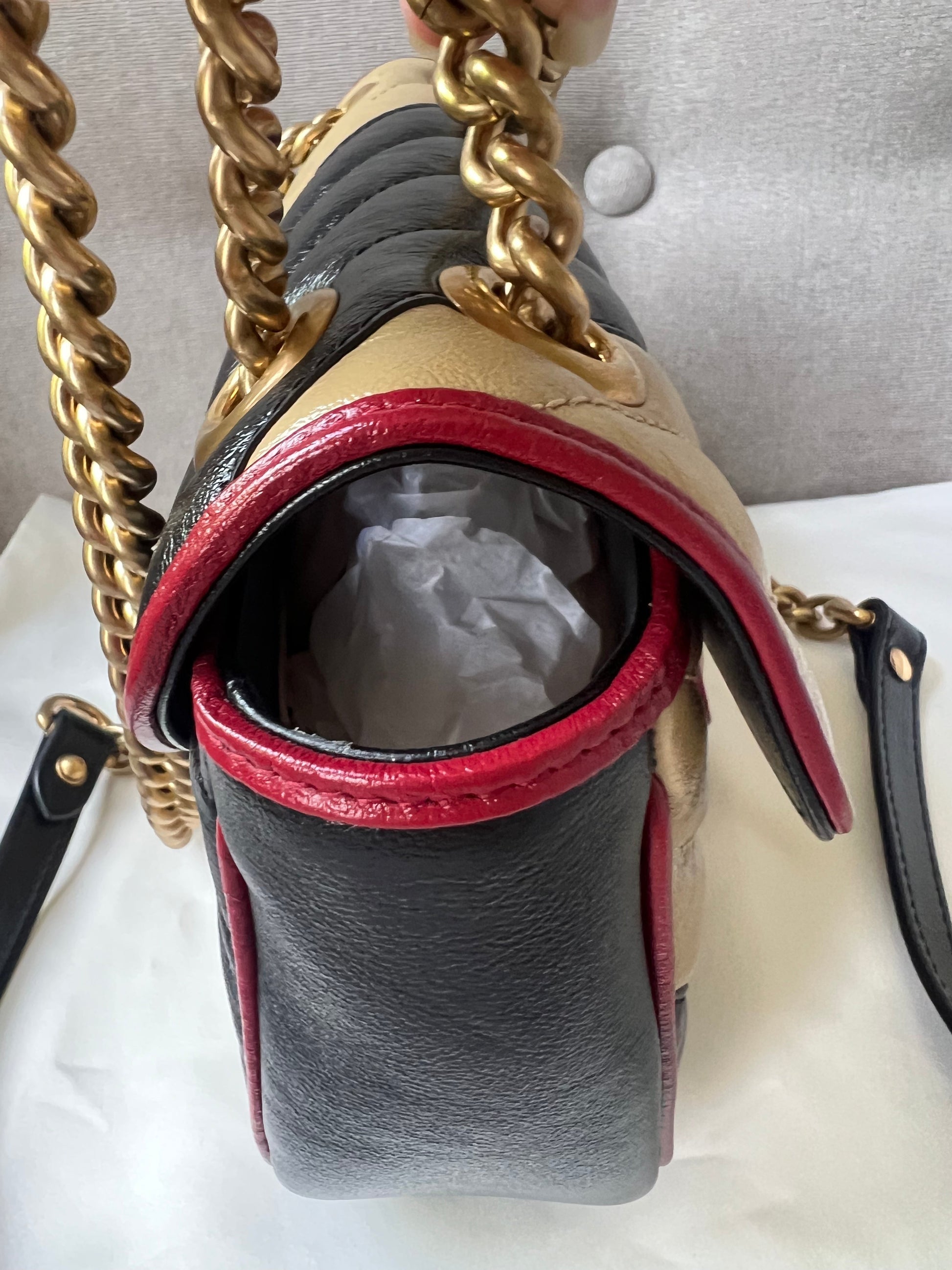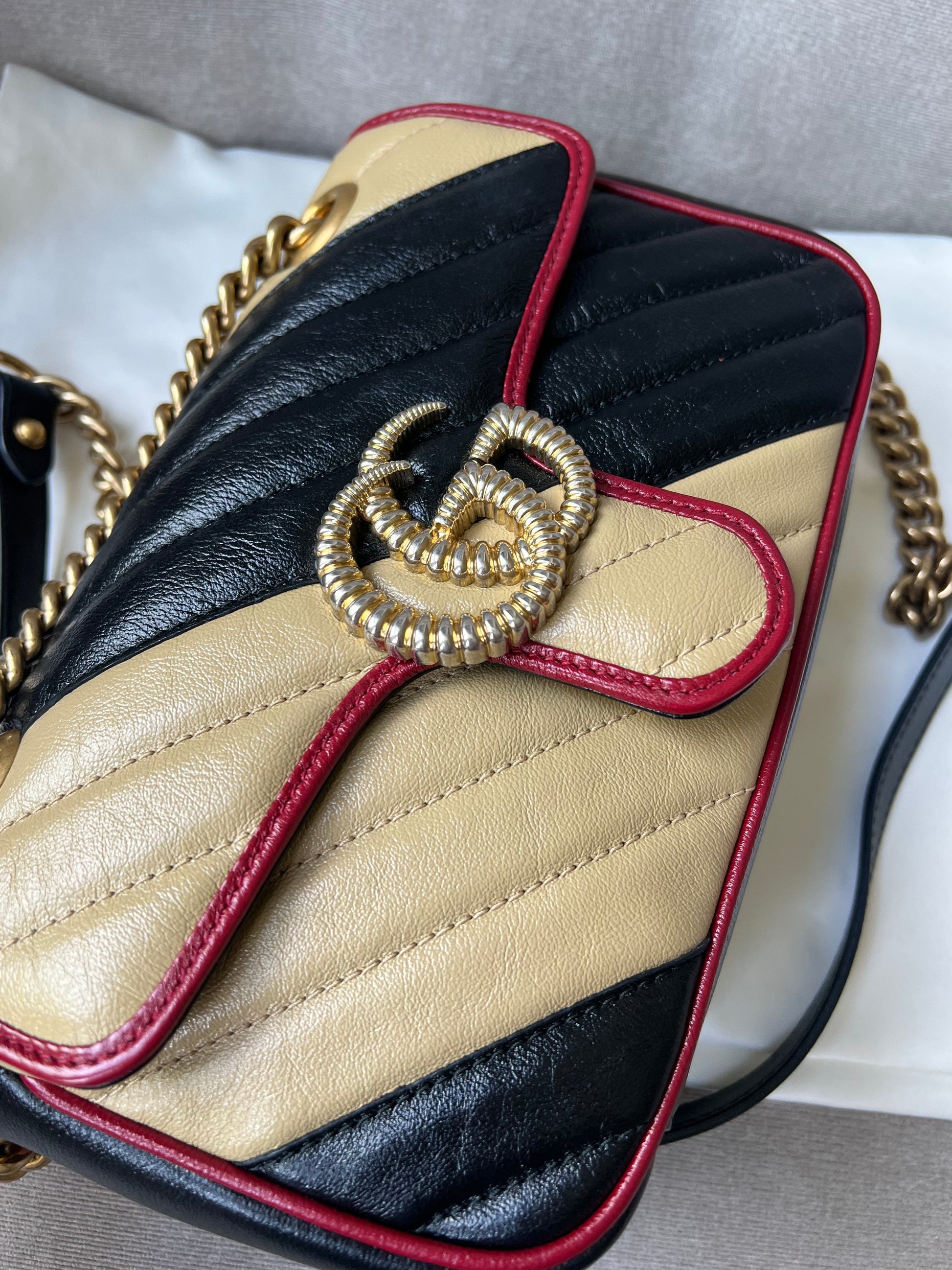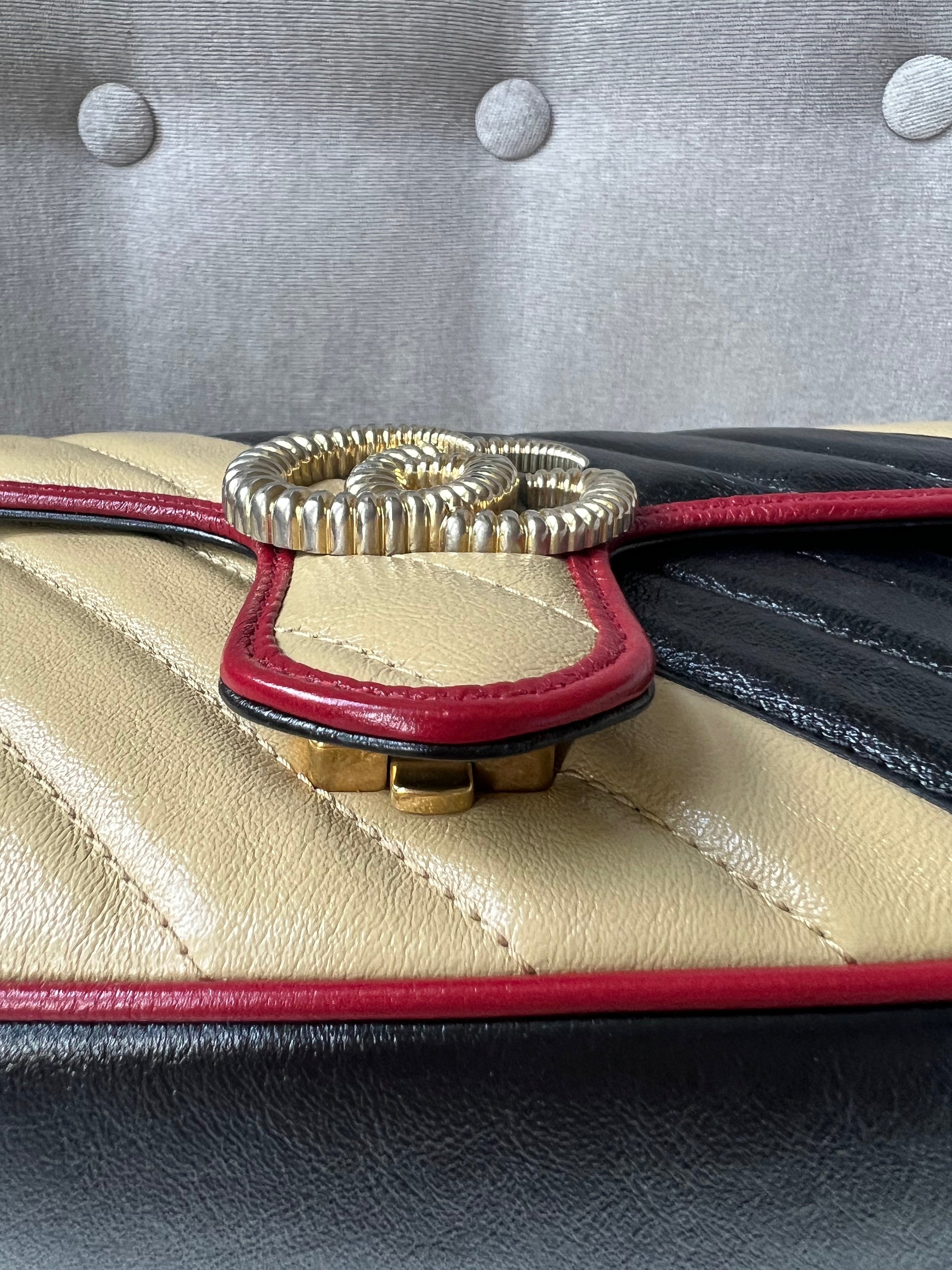 Gucci GG Torchon Marmont mini shoulder bag in tricolour glazed matelasse chevron leather with gold hardware. This mini Marmont bag has a softly structured shape and an oversized flap with textured GG hardware and heart detail on the back. Black / Beige / Red in colour. The sliding chain can be multiple ways either doubled up or lengthened. Effortlessly chic and sophisticated, this style can be both with a casual outfit or for evening wear. Suitable for both day to day or occasion wear and ideal for those who prefer a cross body option. From the 2019 fall collection.