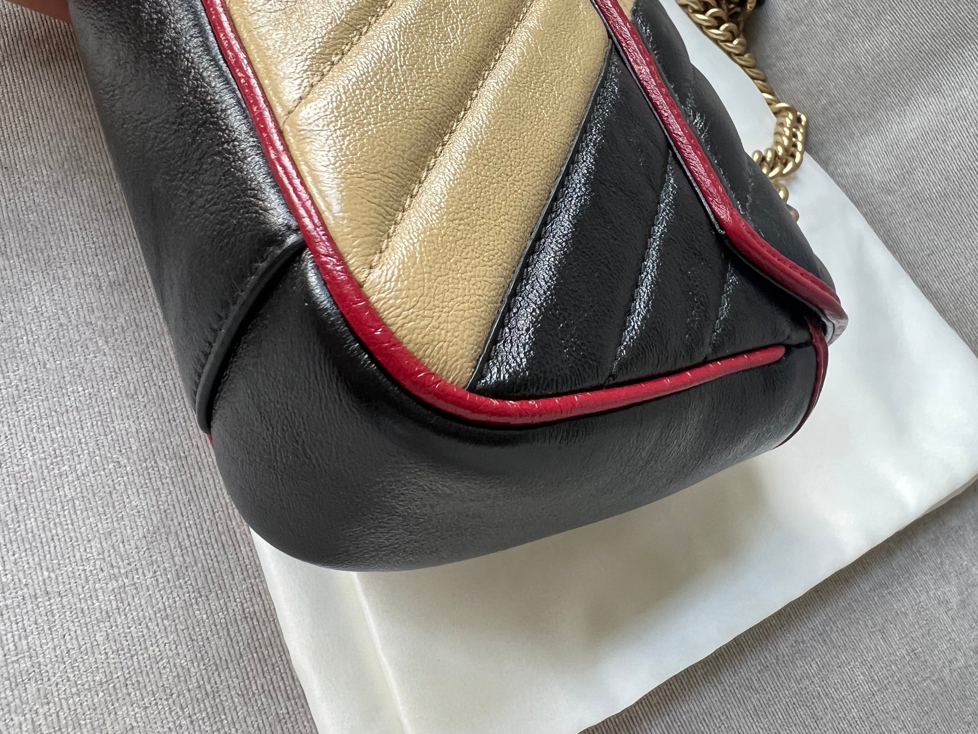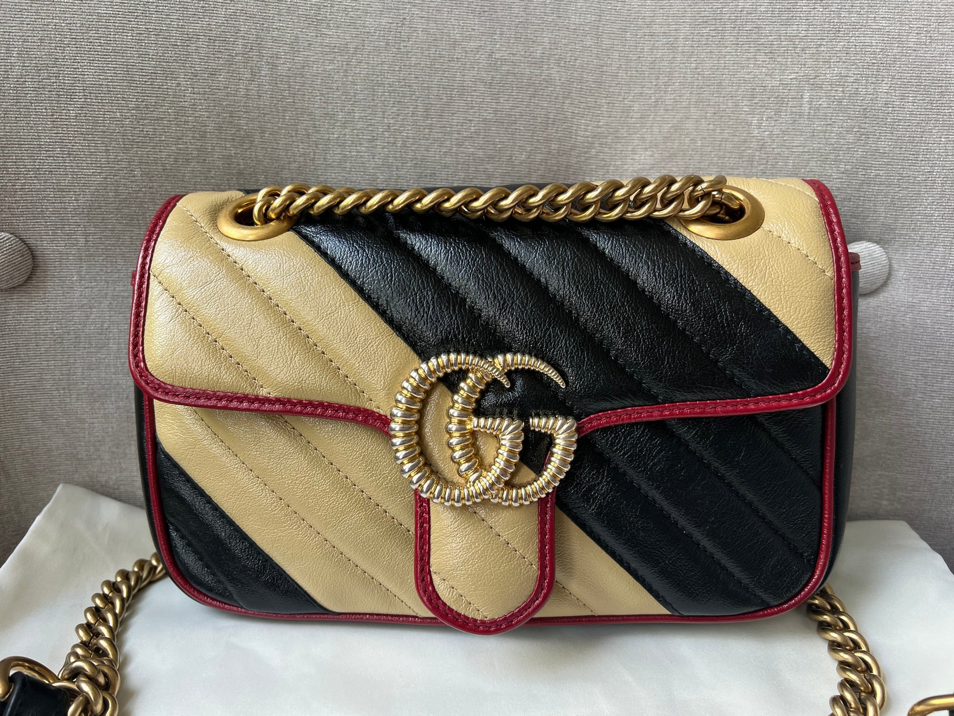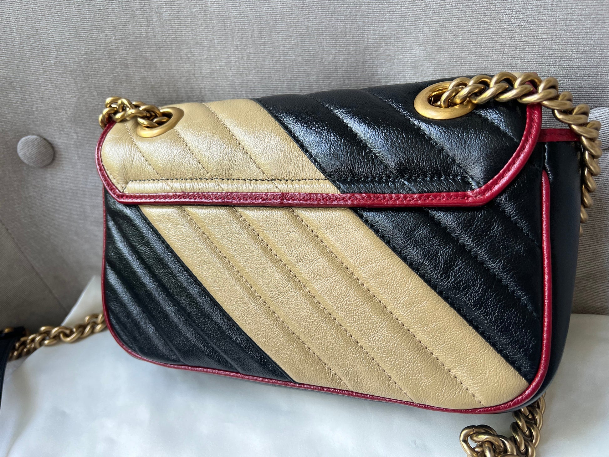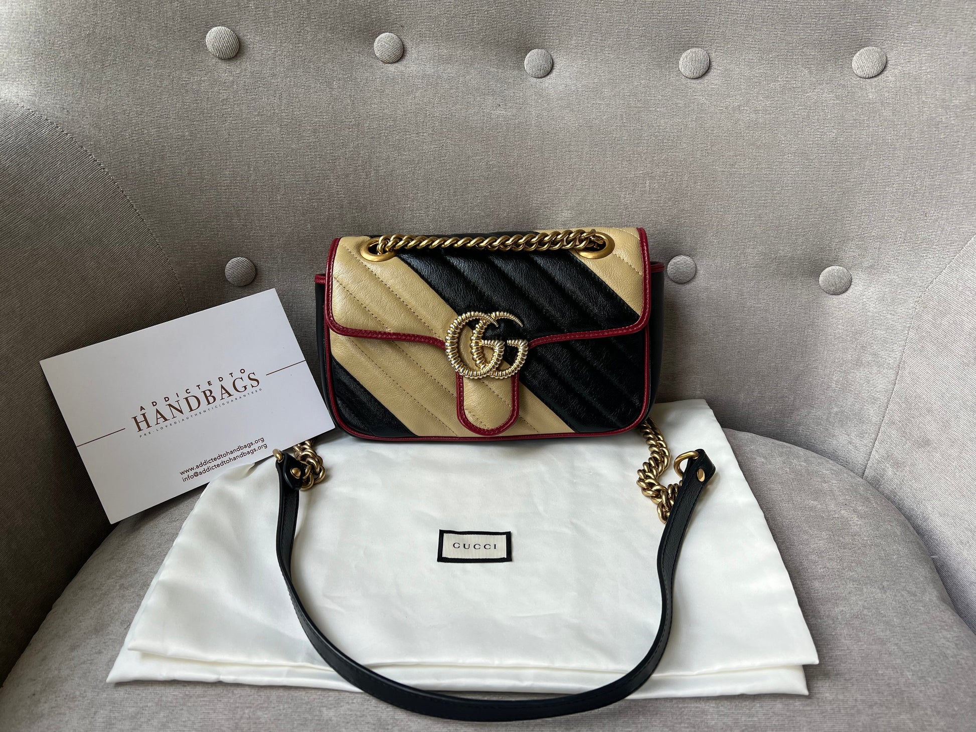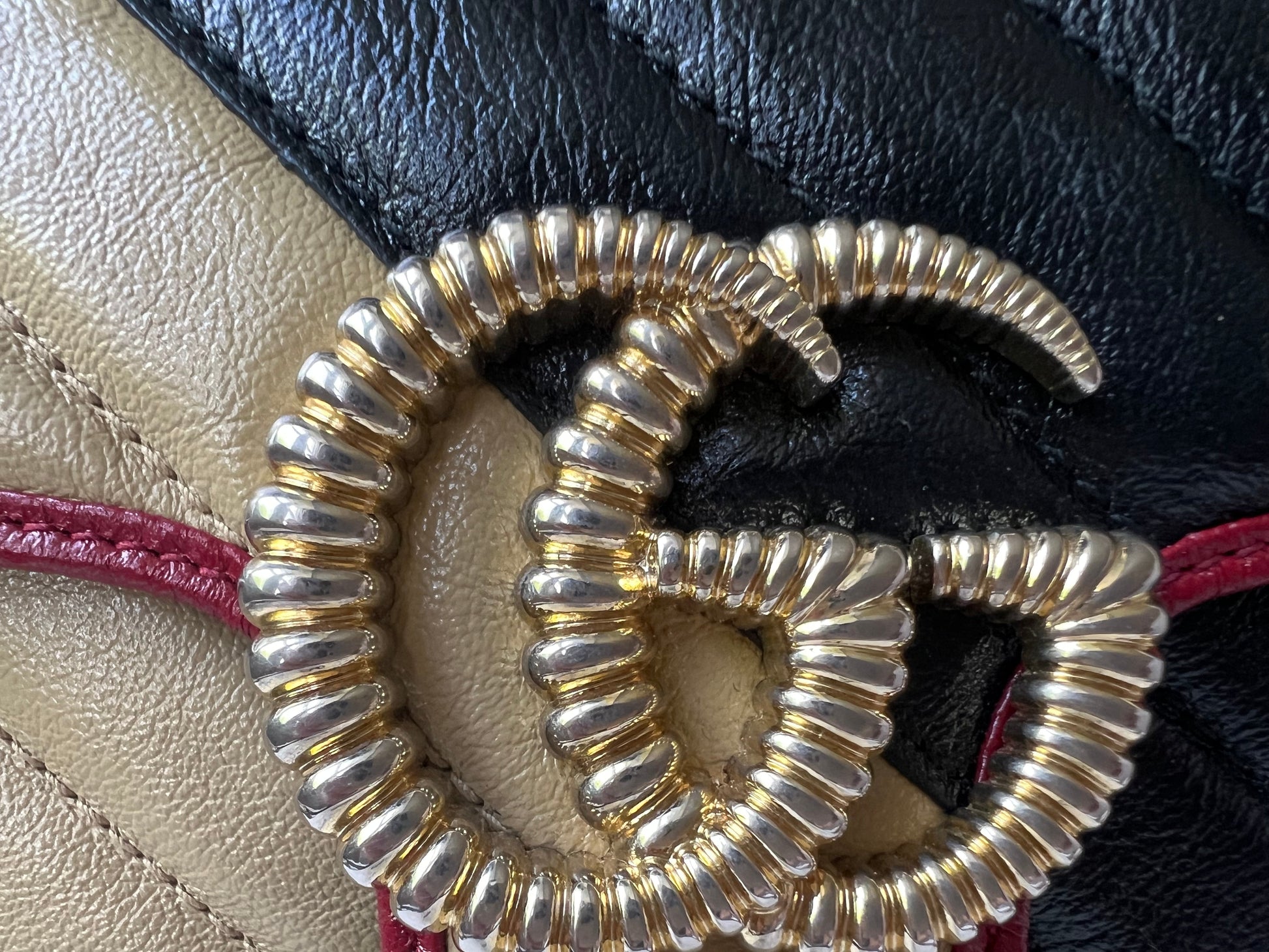 Gucci GG Torchon Marmont mini shoulder bag in tricolour glazed matelasse chevron leather with gold hardware. This mini Marmont bag has a softly structured shape and an oversized flap with textured GG hardware and heart detail on the back. Black / Beige / Red in colour. The sliding chain can be multiple ways either doubled up or lengthened. Effortlessly chic and sophisticated, this style can be both with a casual outfit or for evening wear. Suitable for both day to day or occasion wear and ideal for those who prefer a cross body option. From the 2019 fall collection.