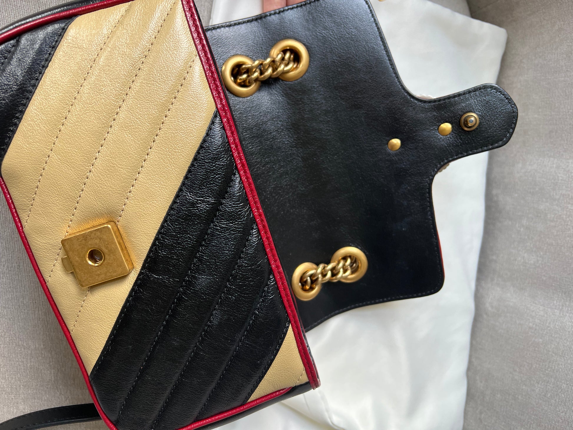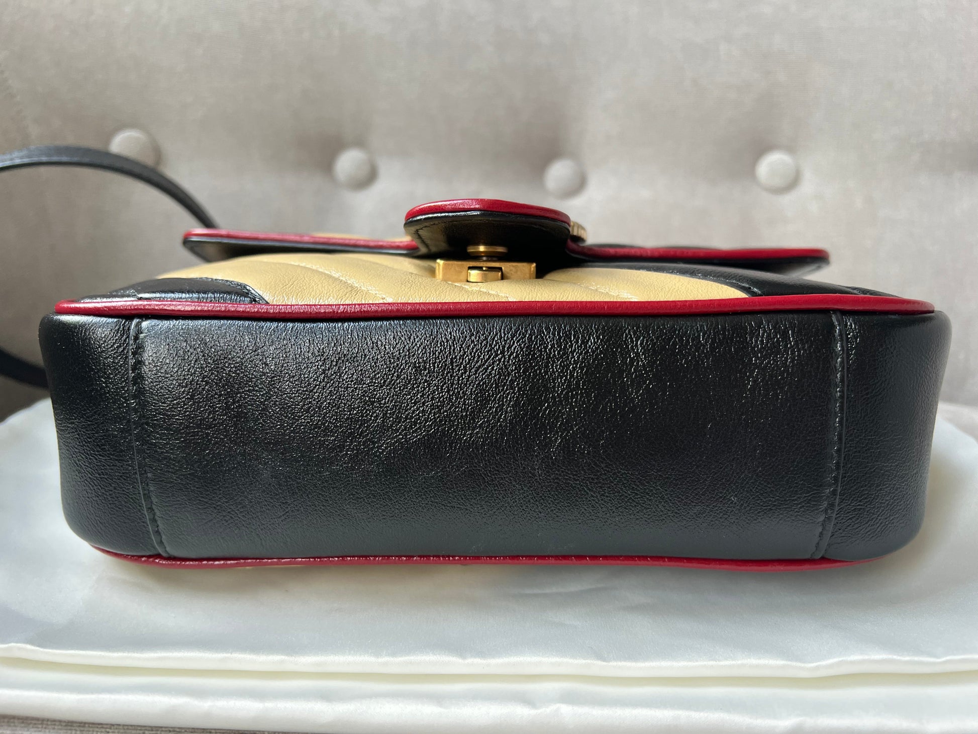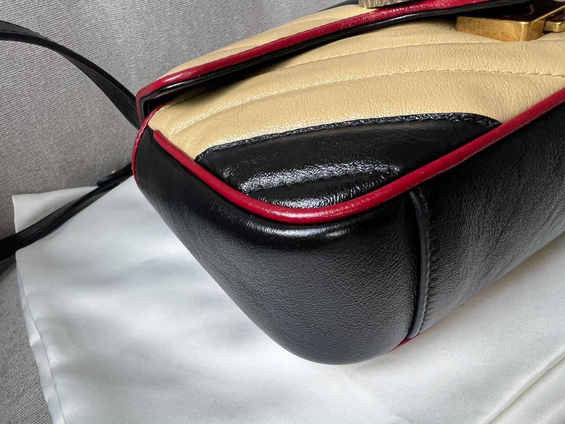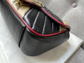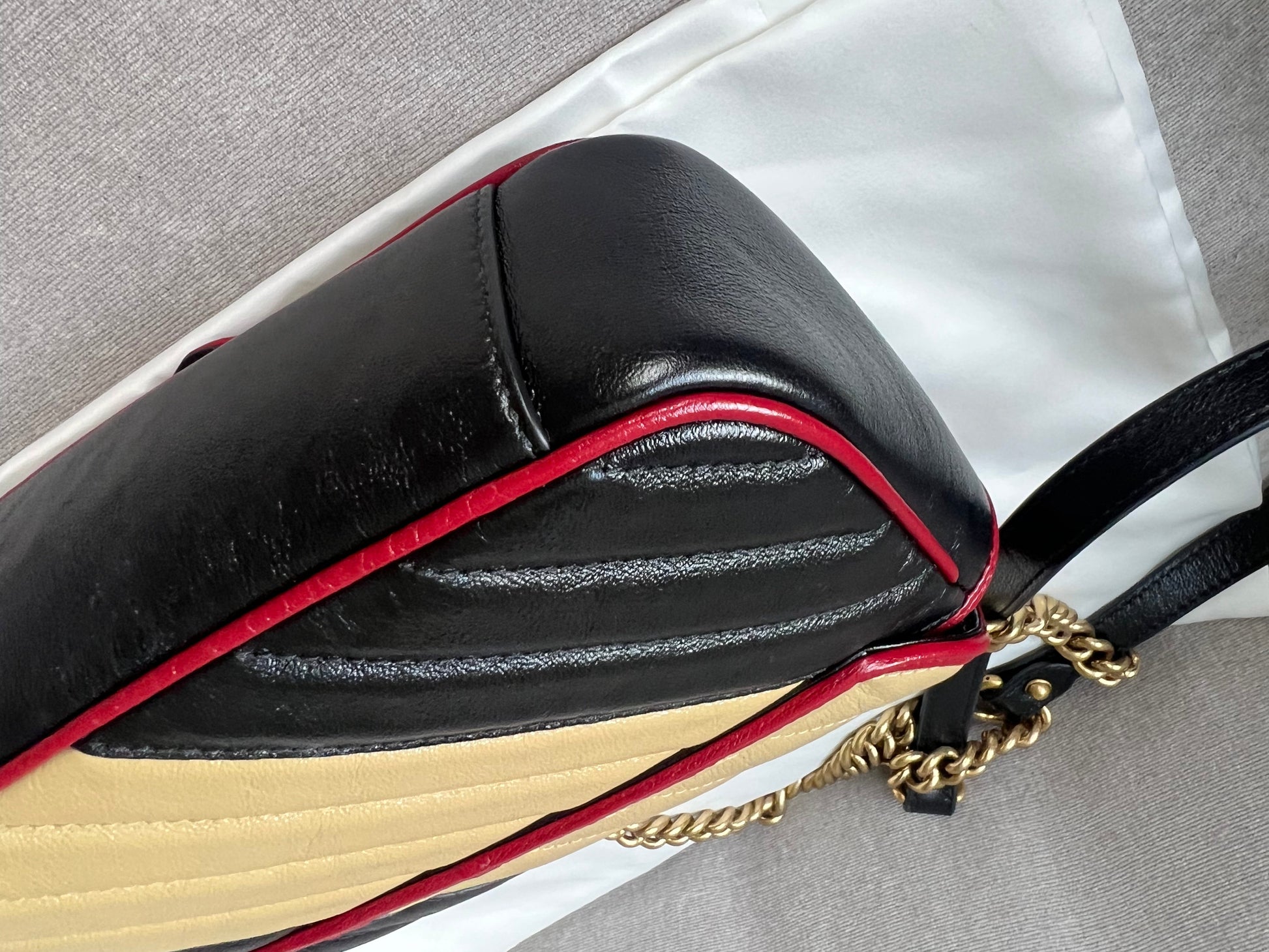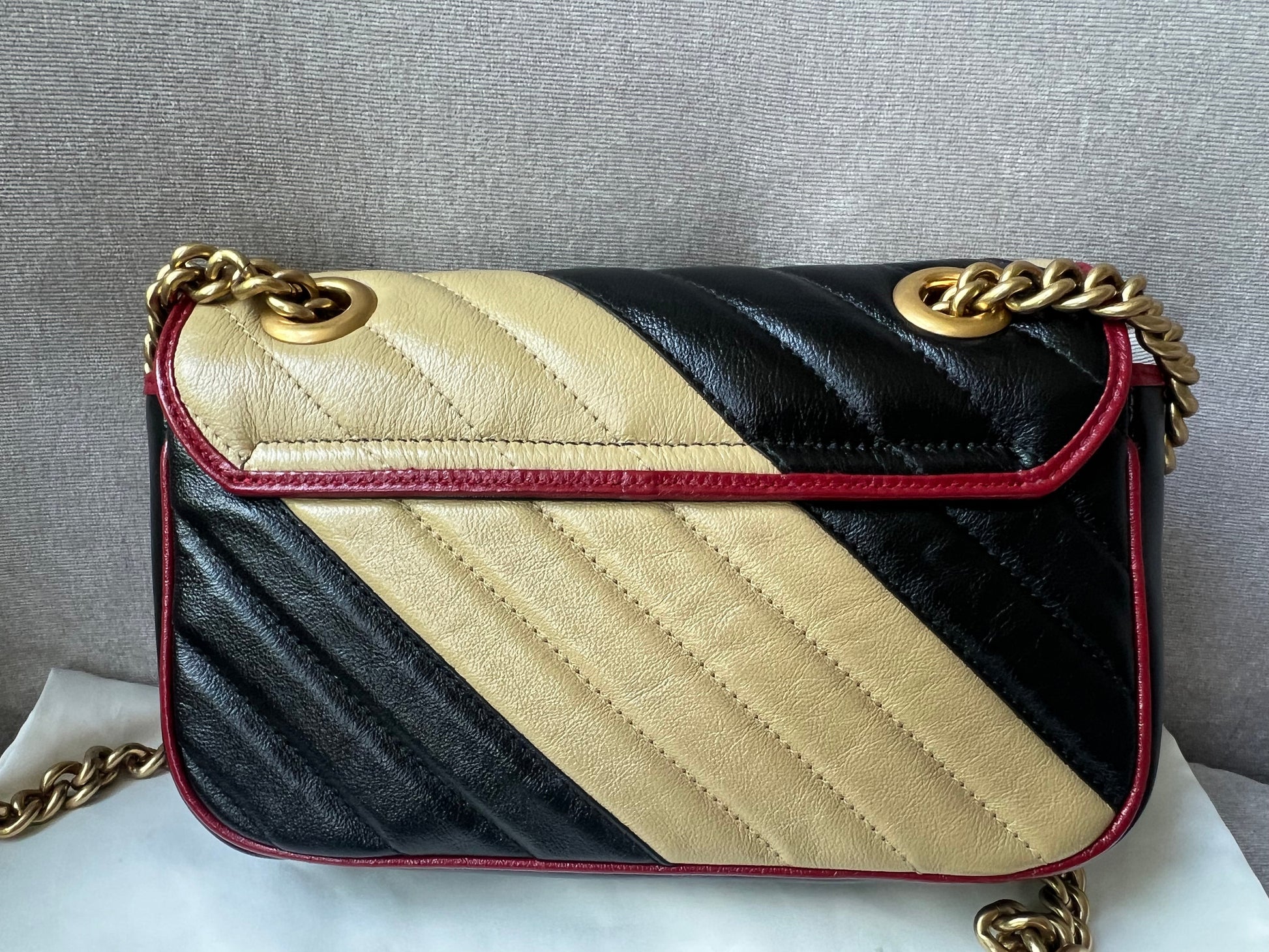 Gucci GG Torchon Marmont mini shoulder bag in tricolour glazed matelasse chevron leather with gold hardware. This mini Marmont bag has a softly structured shape and an oversized flap with textured GG hardware and heart detail on the back. Black / Beige / Red in colour. The sliding chain can be multiple ways either doubled up or lengthened. Effortlessly chic and sophisticated, this style can be both with a casual outfit or for evening wear. Suitable for both day to day or occasion wear and ideal for those who prefer a cross body option. From the 2019 fall collection.