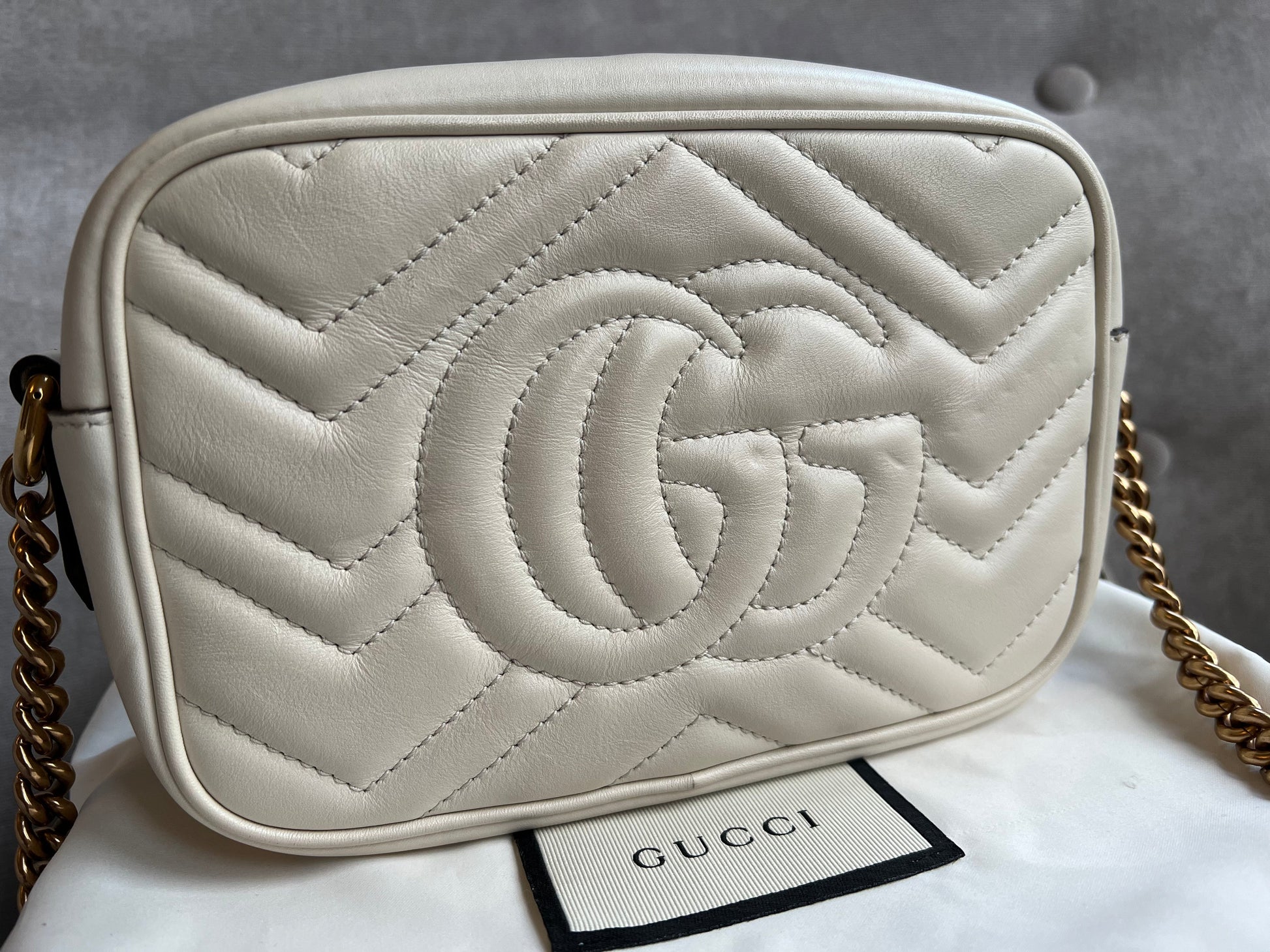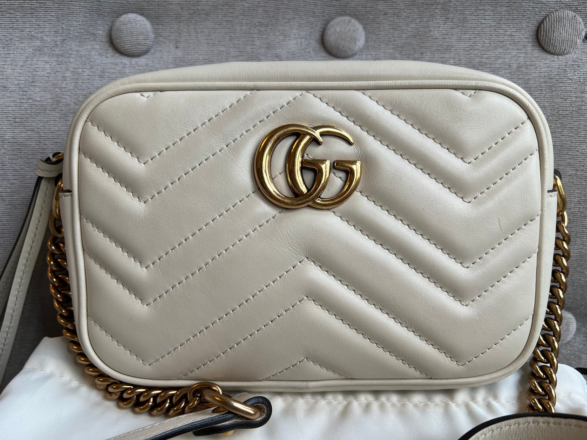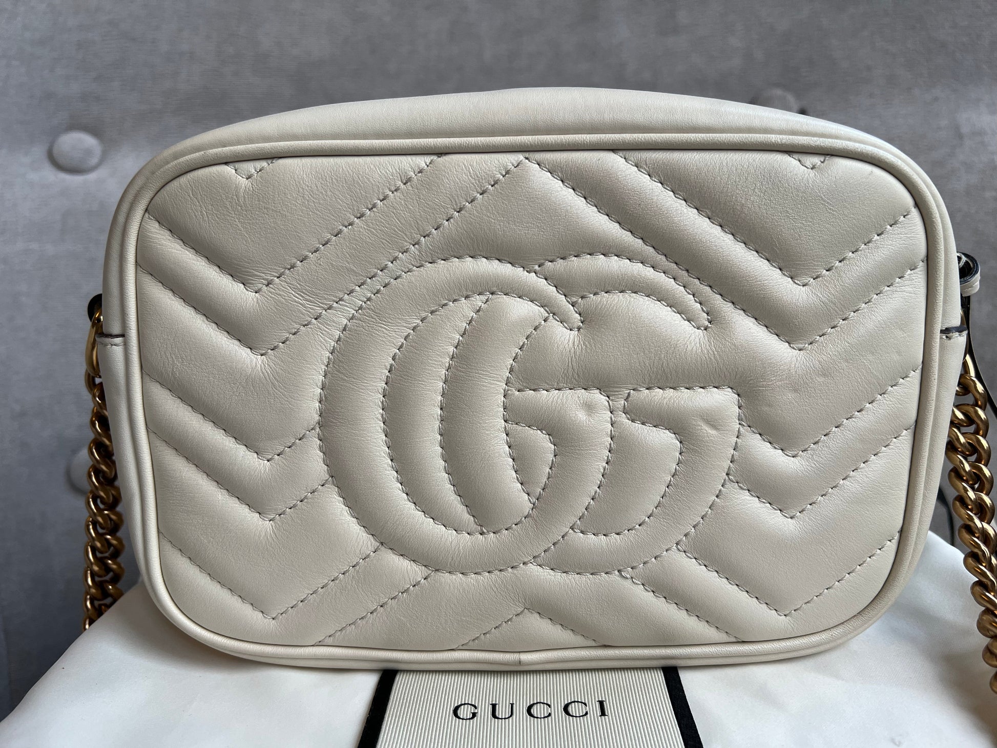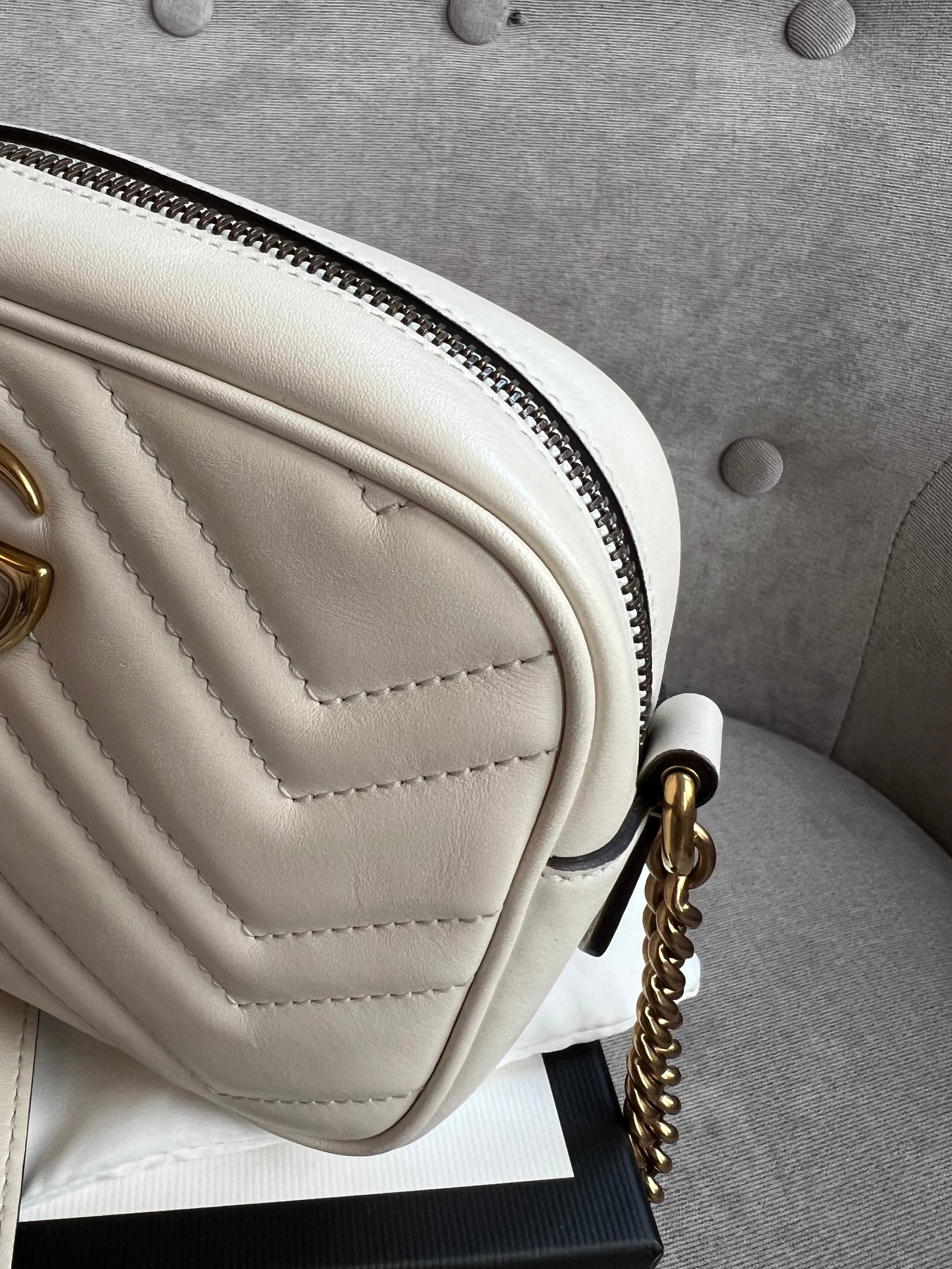 Gucci GG Marmont mini shoulder bag in white chevron matelassé leather with gold hardware. The shade is more of a pale cream / off white shade. This mini Marmont chain camera style bag has a softly structured shape, zip top closure and GG detail on the back. Effortlessly chic and sophisticated, this style can be both with a casual outfit or for evening wear. Suitable for both day to day or occasion wear and ideal for those who prefer a cross body option.