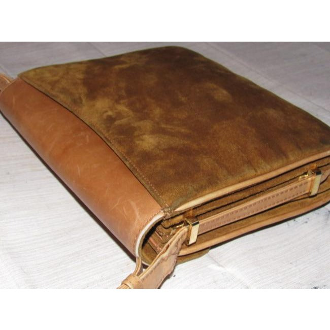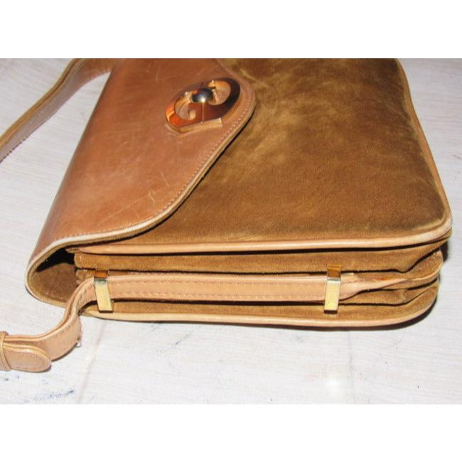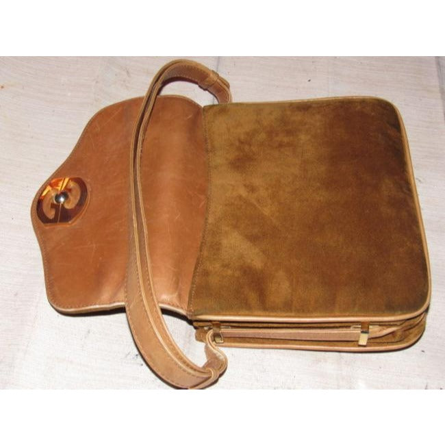 For sale is a vintage, GUCCI, 1960's to 1970's, camel leather and suede with gold tone hardware, envelope snap top, two setting strap, shoulder purse with chunky GG logo accent at the snap, multiple compartments and pockets, and an expendable accordion bottom.
