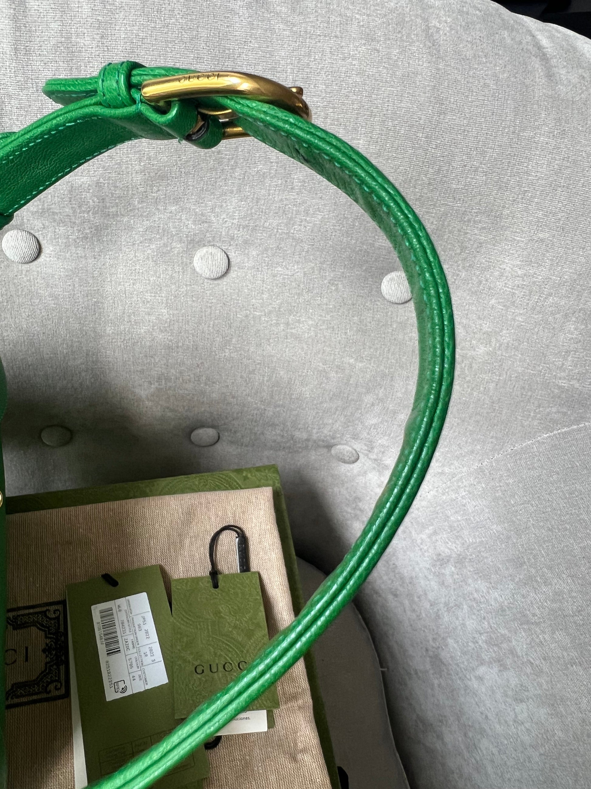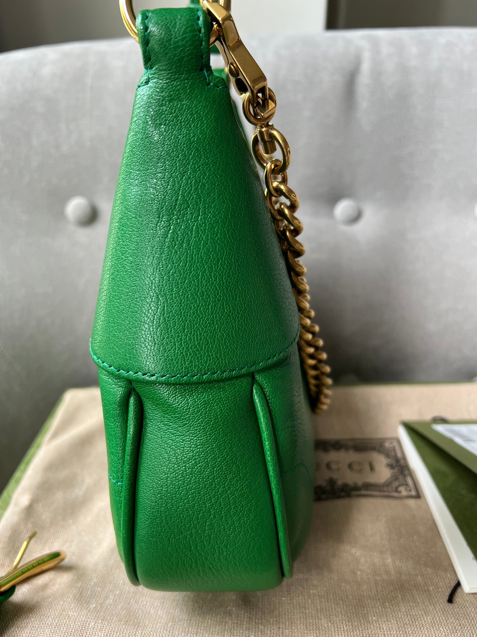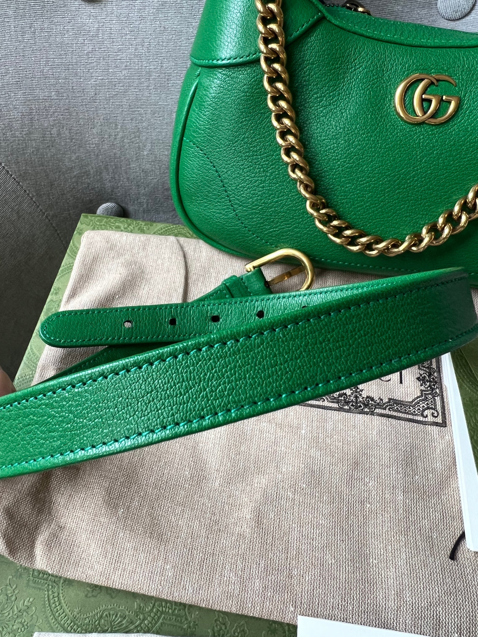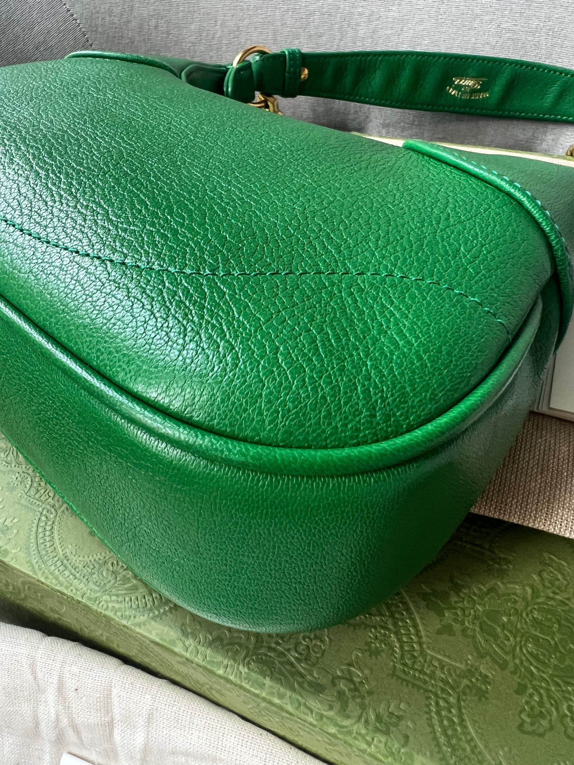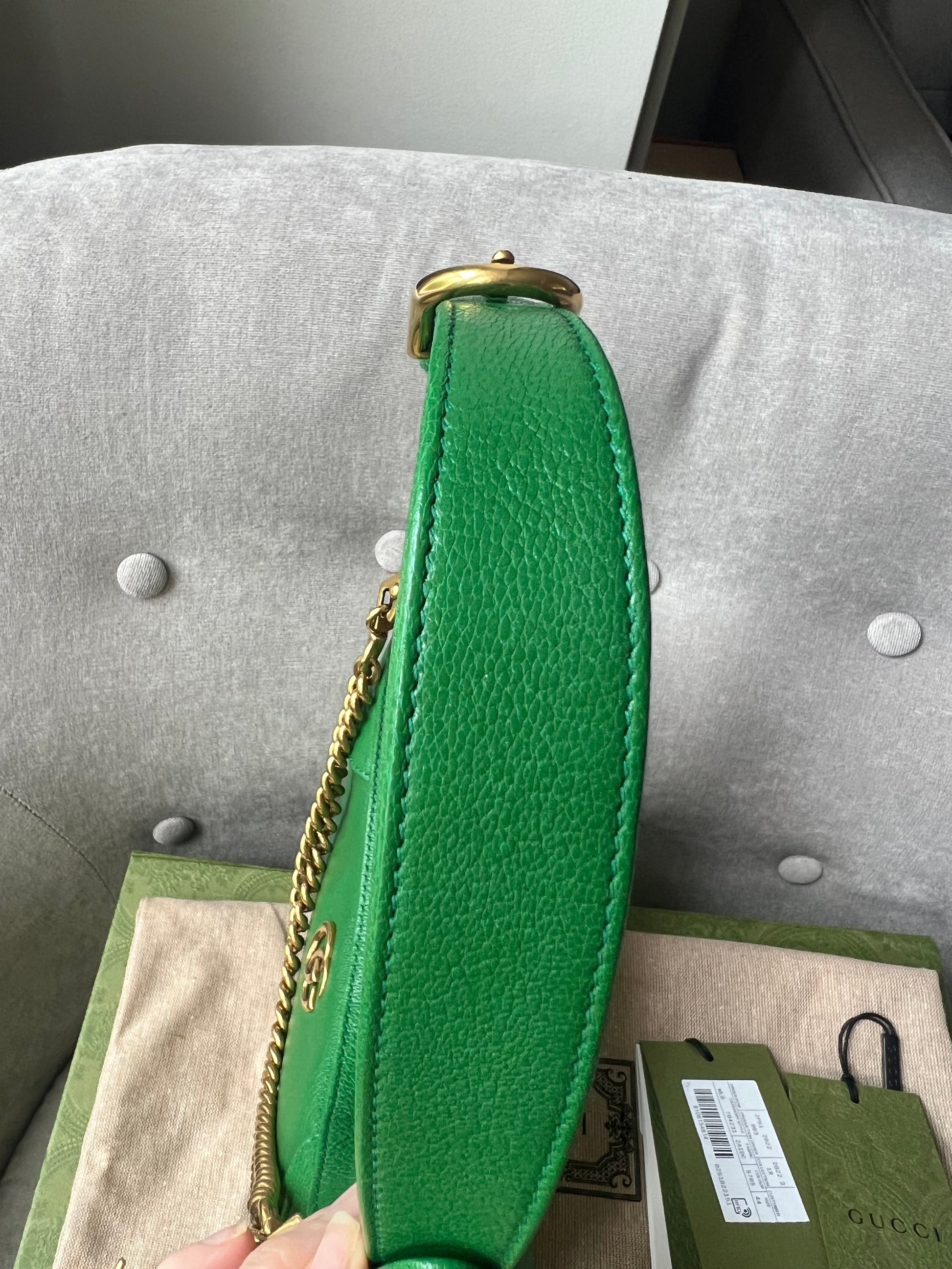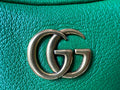 Gucci Small Aphrodite Shoulder Bag in Green Calfskin with gold hardware. Gucci’s Pre-Fall 2023 collection captures the essence of Gucci. This crescent-shaped shoulder bag is presented in green soft leather and enriched with the instantly recognisable Double G.can be carried over shoulder or in hand using top handle or chain strap, or cross body using the longer shoulder strap.