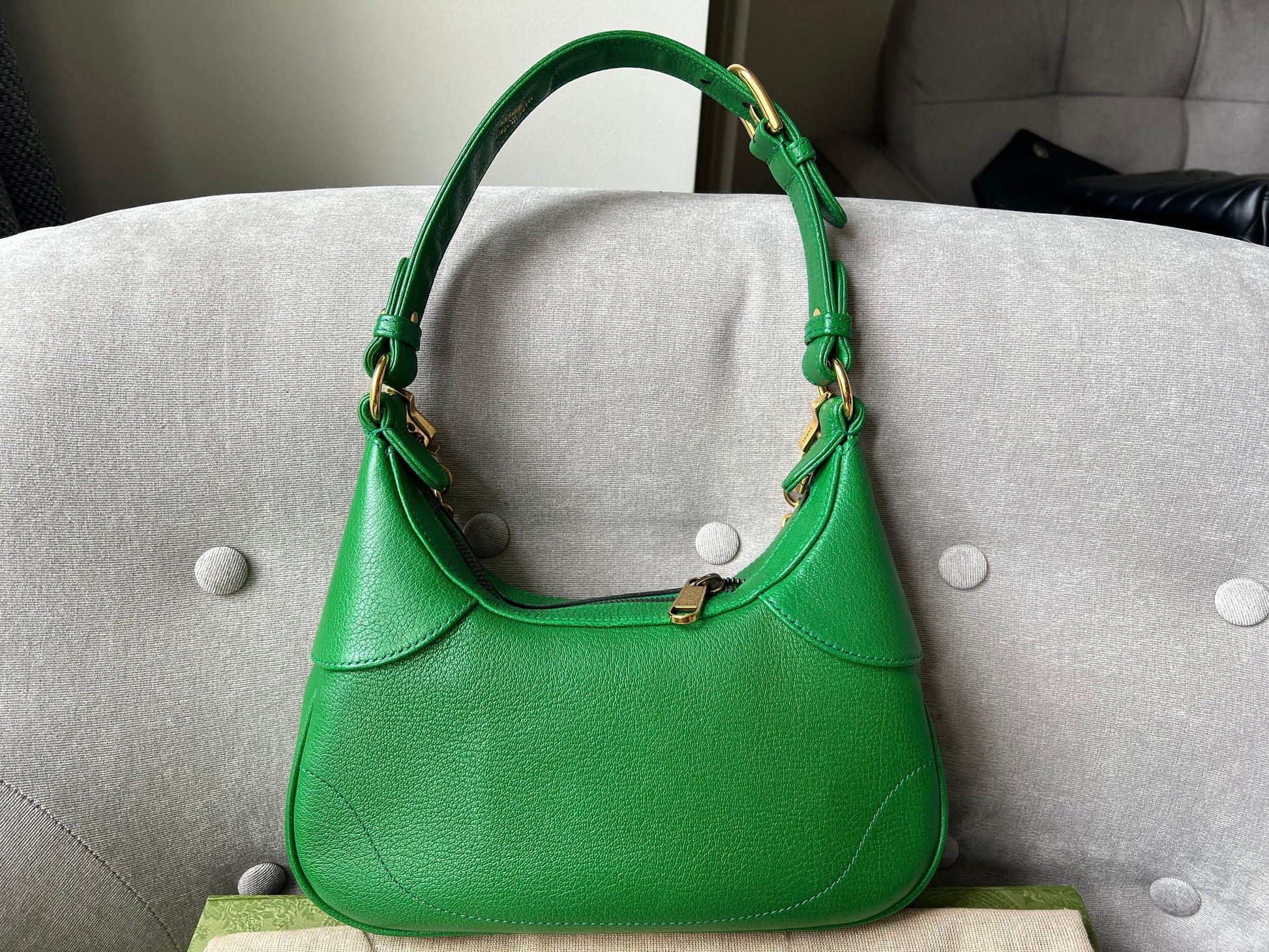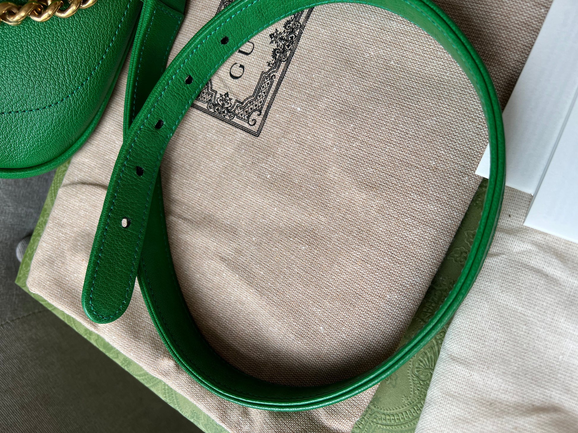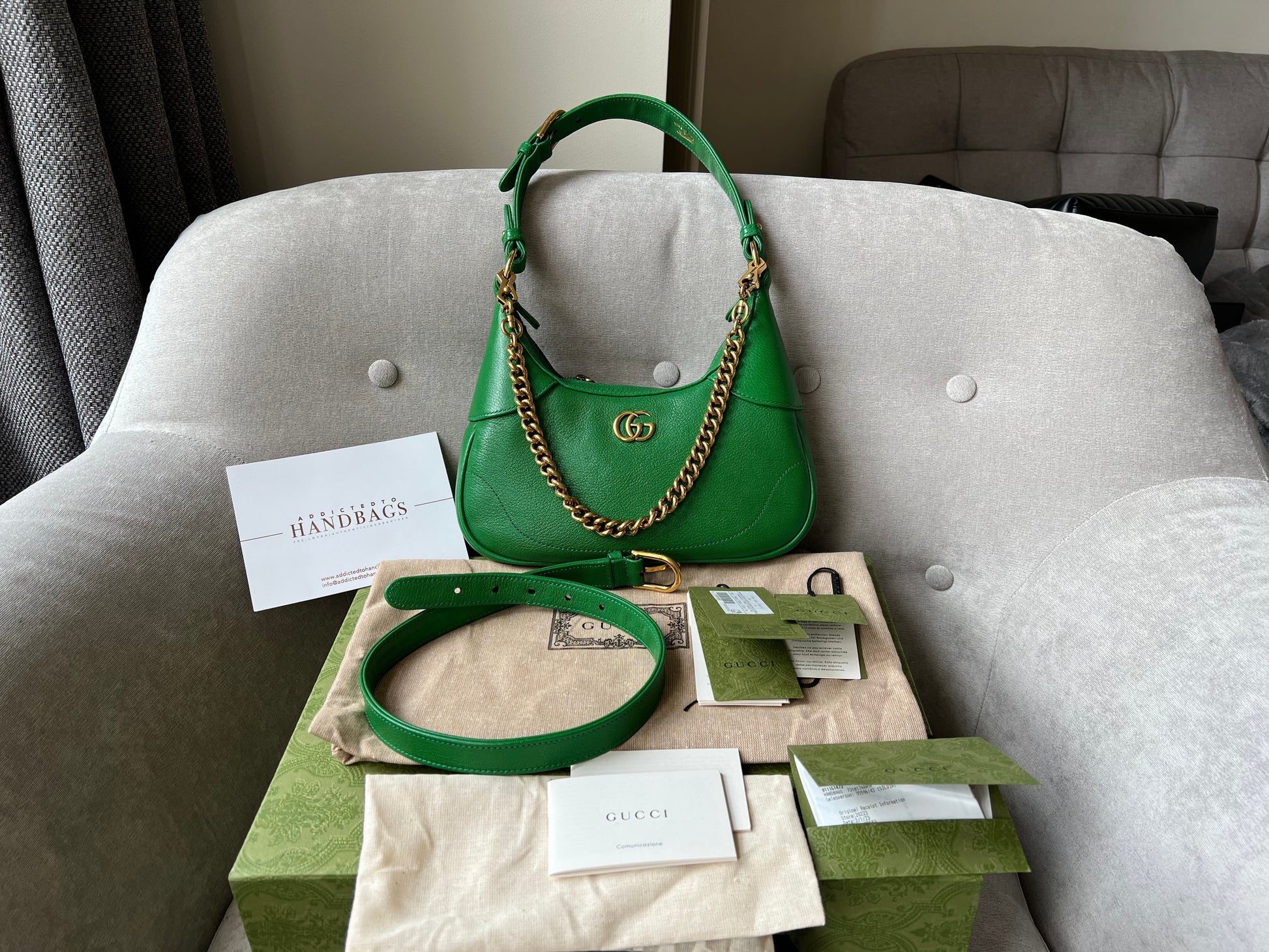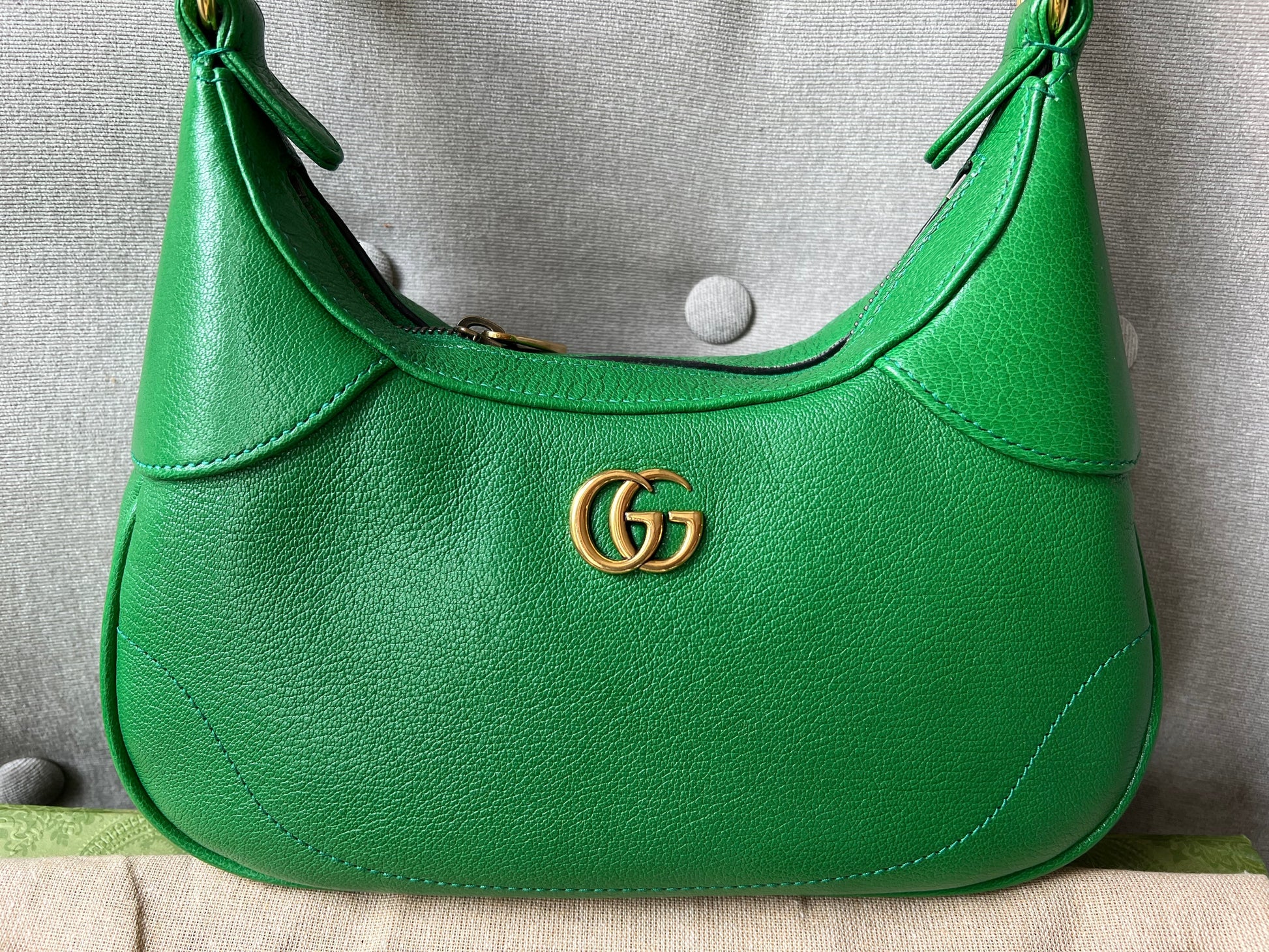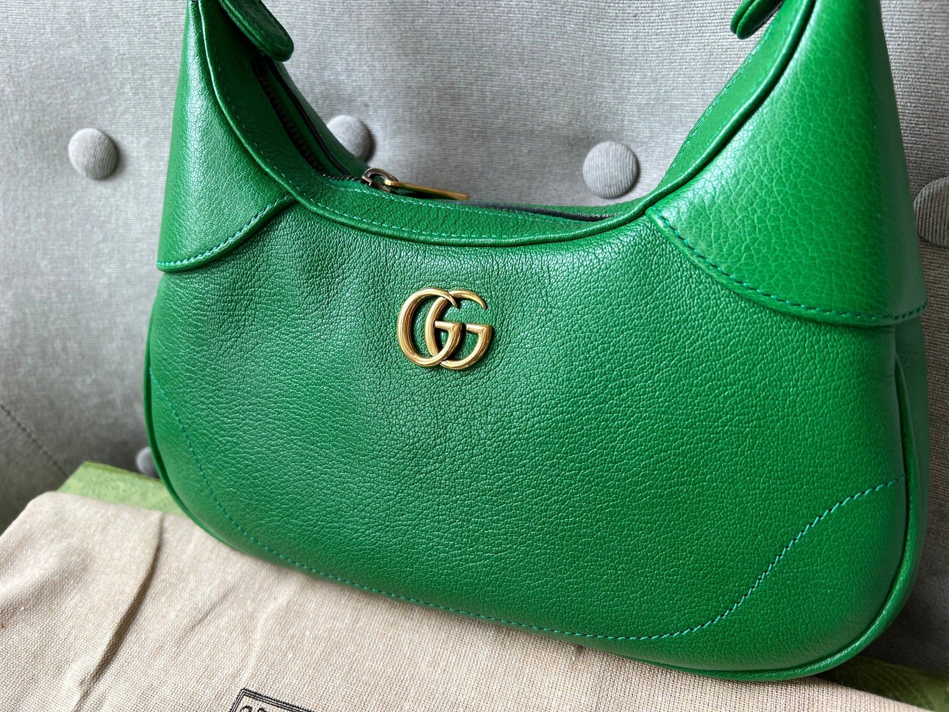 Gucci Small Aphrodite Shoulder Bag in Green Calfskin with gold hardware. Gucci’s Pre-Fall 2023 collection captures the essence of Gucci. This crescent-shaped shoulder bag is presented in green soft leather and enriched with the instantly recognisable Double G.can be carried over shoulder or in hand using top handle or chain strap, or cross body using the longer shoulder strap.