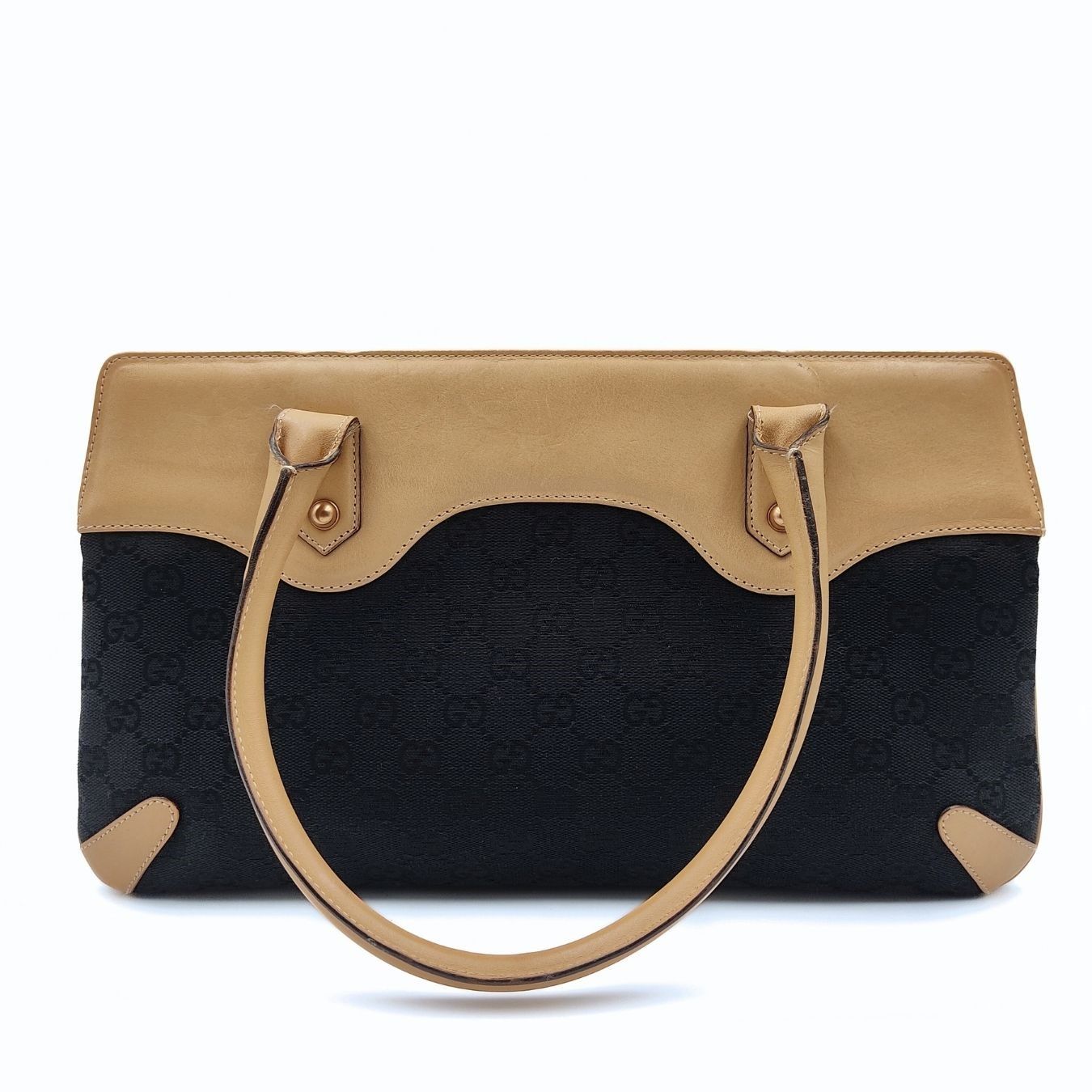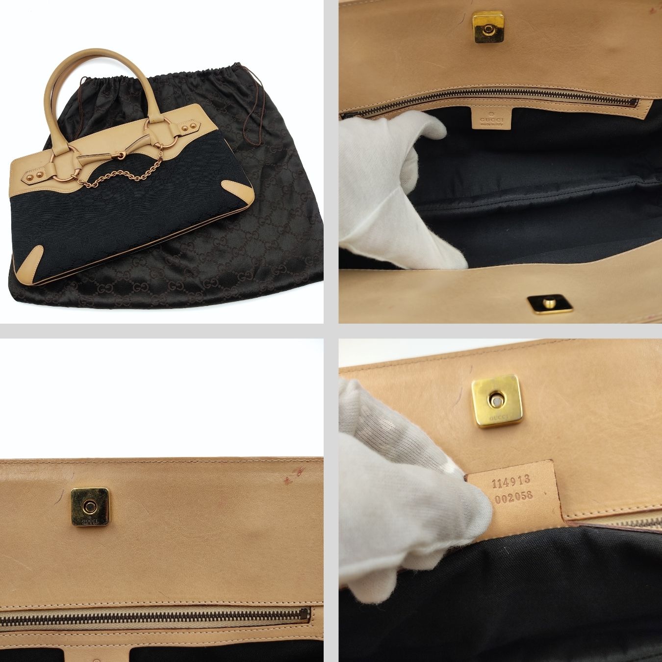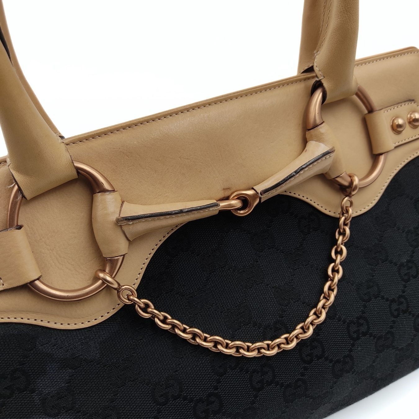 Gucci Horsebit Chain shoulder bag in canvas and leather.Made of black monogram canvas with beige leather trim.Bronze hardware.It has small scratches and a pen mark inside, but its overall condition is excellent.Complete with anti-dust bag.DIMENSIONS: L: 36 cm - H: 20 cm - W: 5 cm - Handles 17 cmAll our items are selected, carefully sanitized and ated by our experts.CODE: 5463B107BRAND: GucciMADE IN: ItalyITY CODE: 114913002058Black colourMATERIAL: CanvasCONDITION: Excellent