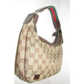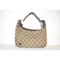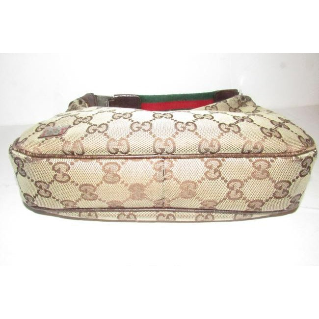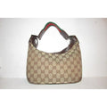 The bag is a hobo style shoulder purse by GUCCI. It is made from brown heavy, jacquard canvas with the Guccissima print and brown leather. It has a zip top closure with a wide, green and red striped fabric strap which is not adjustable. Attaching the handles are chrome links with red and green enamel horse-bit designs.