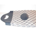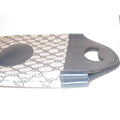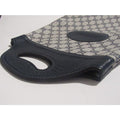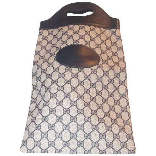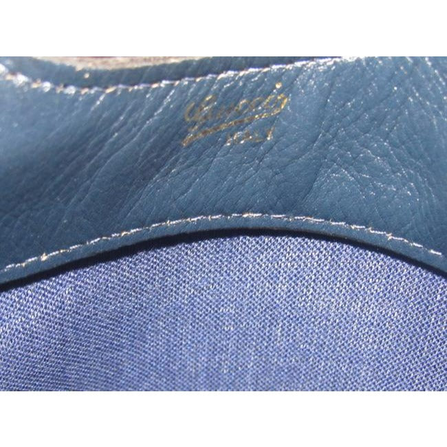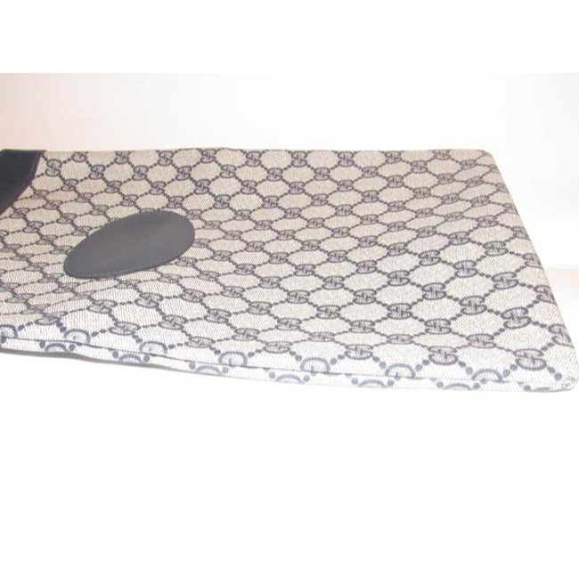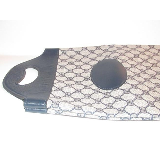 This is very similar to one of the vintage styles Gucci brought back with its new, vintage inspired styles! The bag is a punch hole/port hole tote or satchel style purse by GUCCI. It is made from navy blue large G logo print coated canvas and navy blue leather as the body with an oval leather accent in the center that could easily be personalized It has no top closure.