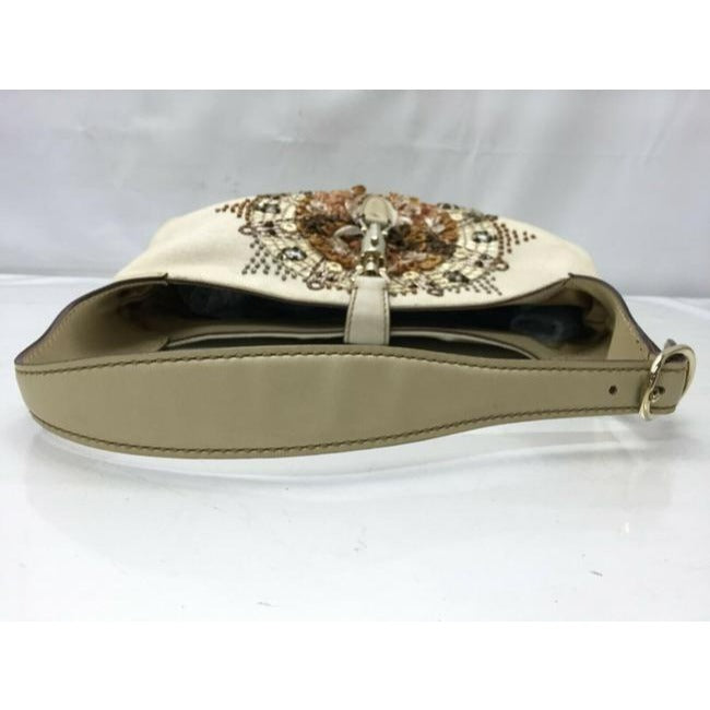 The bag is the perfect Limited Edition Jackie original by Gucci in an unusual color combination with a detailed beaded and embroidered design in shades of browns and pastels! It has a light canvas body with a stone colored smooth leather bottom, strap, trim, and closure attachment. The purse is the medium size and has a gold, piston style closure! The bag is in amazing condition!