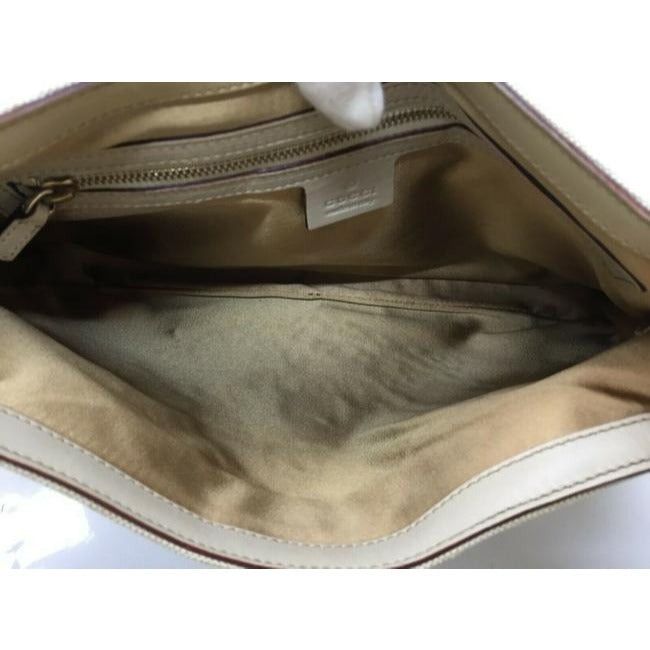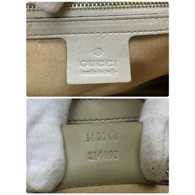 Inside, it has a very clean light brown fabric lining, one main compartment, and back zip pocket. There is an embossed leather tag that reads, 'Gucci , Made in Italy' on one side and has the serial #140040 214897 stamped on the back. It has been authenticated by a third party expert, so buy with confidence! It is the perfect size and color for year round, everyday use!