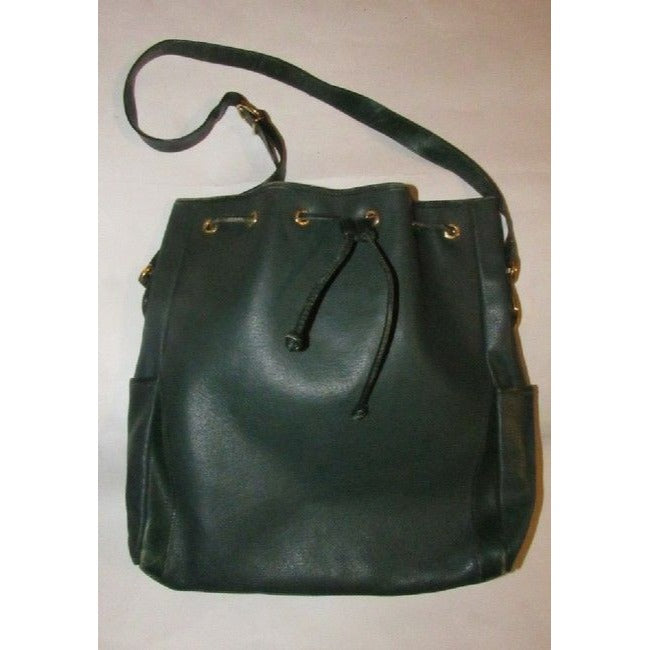The bag is made of buttery soft, emerald green leather in a drawstring bucket style with lots of room. There is an interior, zip top pocket. The top and the piping are solid and show little wear throughout! There is a gold embossed, logo tag on the exterior, but other than that and the pulls and hardware, this purse is very understated. This drawstring style and its many variations was (and still is) a style staple Gucci has produced and perfected and this is a great example! This is a perfect signature purse in a timeless style! It has a classic look that will never go out of style. It'd be a fantastic addition to any collection!
