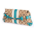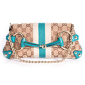 Details: Brown Monogram GG Canvas / Gold Tone Hardware / Turquoise�Leather Accent And Trim / Detachable Chain-Link Shoulder Strap / Beige And Turquoise Gucci Web Panel / Horsebit Embellishment At Front Face / Turquoise Interior Lining / Single Slit Pocket At Interior / Fold-In Flap Closure At Front