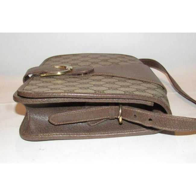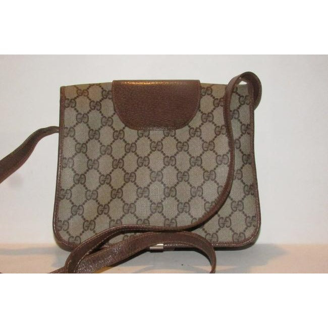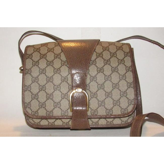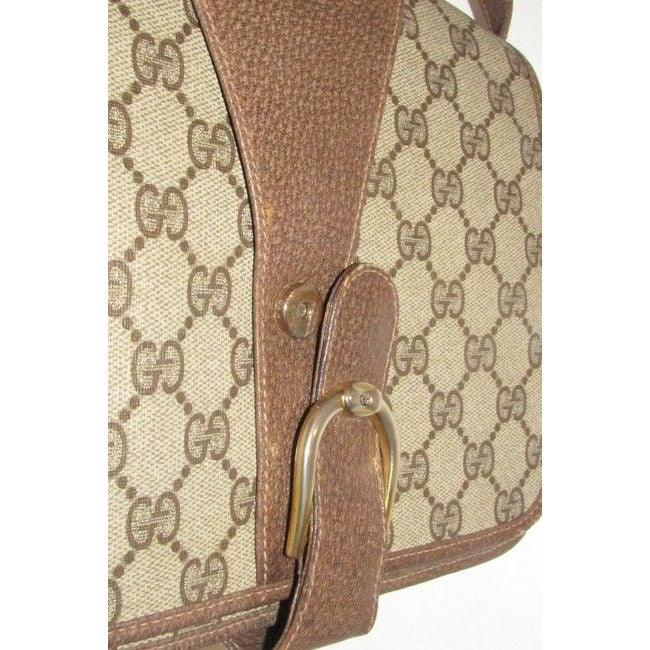 This is a gorgeous, large size, rare, early piece from Gucci that some one took extremely good care of! This is a fabulous bag by Gucci! The bag is made with the large 'G' logo print coated canvas and brown leather. The top of the purse is a leather, saddle bag style flap and there are gold tone, equestrian accents. It has an adjustable strap and a leather flap that attaches the snap closure. It is a large, square, classic, saddle bag shape. It has the leather framing the purse and as the strap and their connectors, base corners, piping, the adjustable strap, and top.