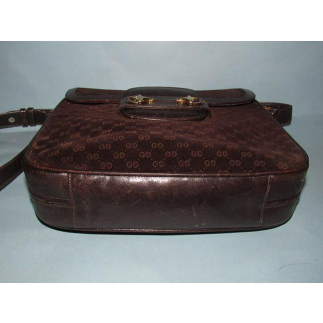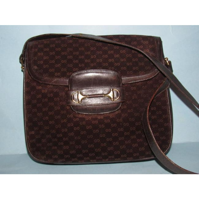 The bag is a large, envelope top, shoulder purse. The body is made of dark brown micro Guccissima print embossed suede and leather. It is a square shape and has bold gold hardware, including great horse bit equestrian accents at the center where it closes and at the sides where the strap is attached! The purse has multiple pockets, so it can hold a lot more than you might think!