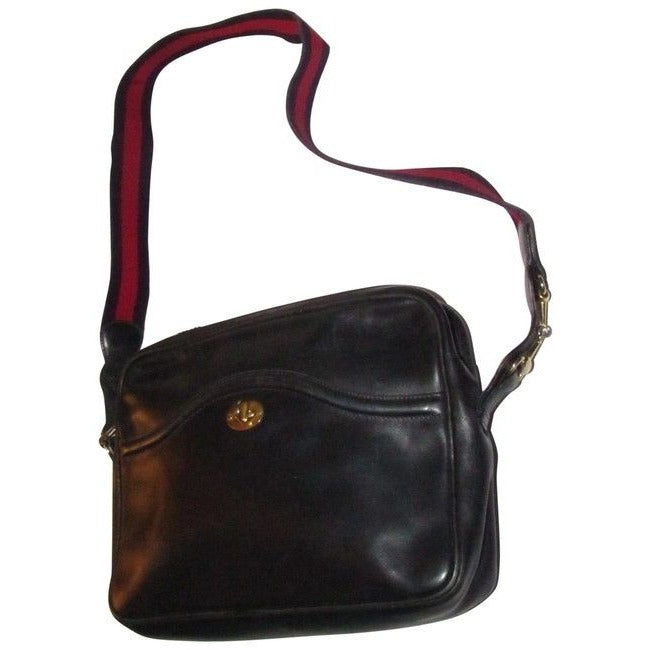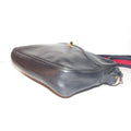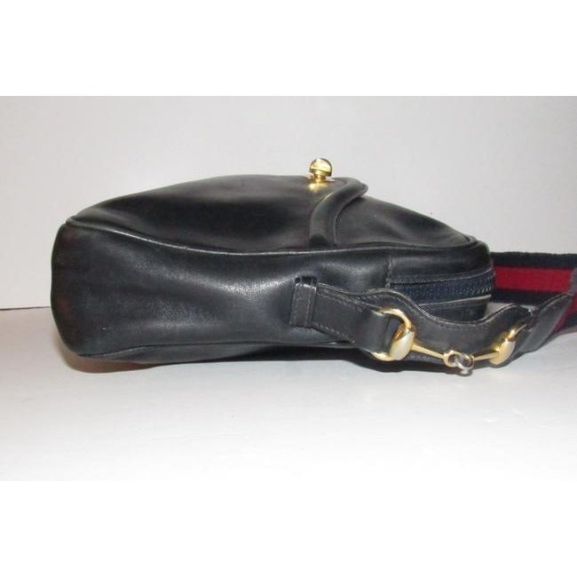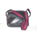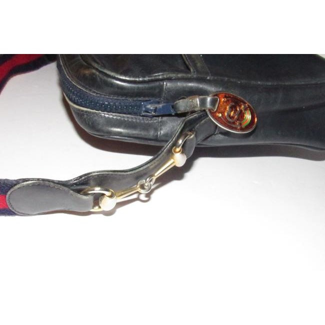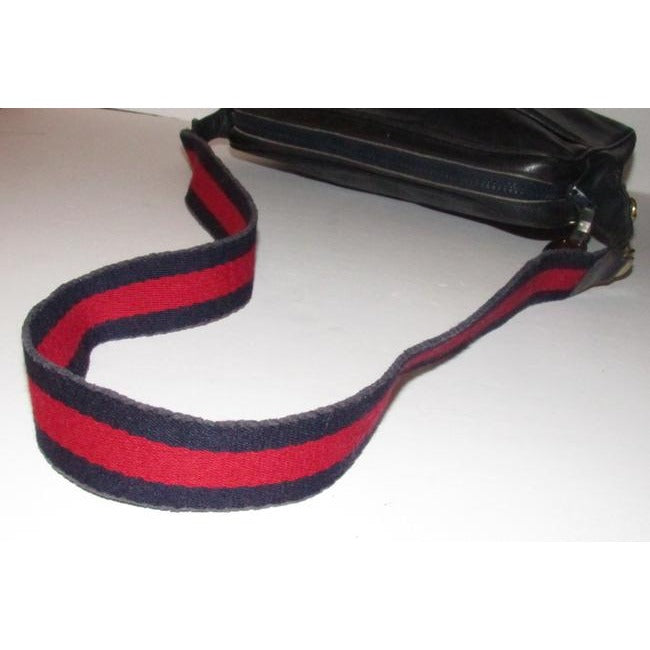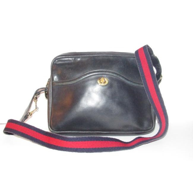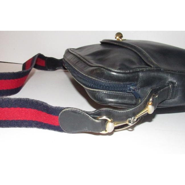 SALE! Vintage, Gucci, navy leather, shoulder bag with a zip top closure, front pocket, and a red and navy striped strap with gold horse-bit accents