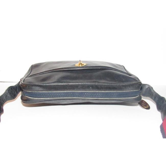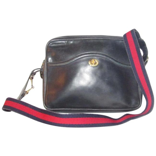 For sale is a vintage, Gucci, navy leather, shoulder bag with a zip top closure, front pocket, and a red and navy striped strap with gold horse-bit accents! It is a rare, early Gucci style that would be great used as your everyday navy blue purse!