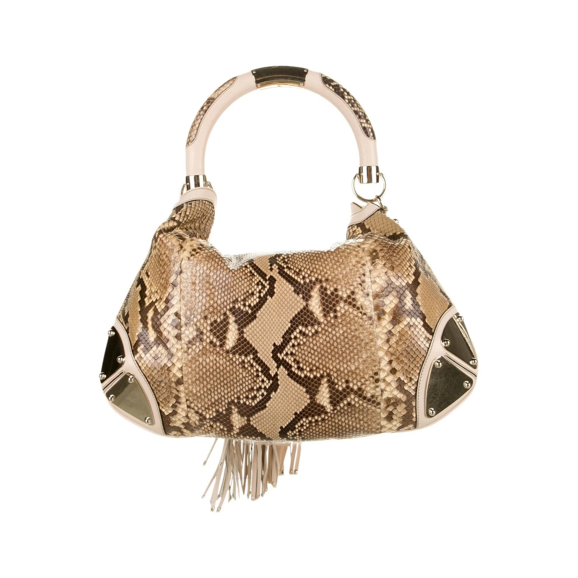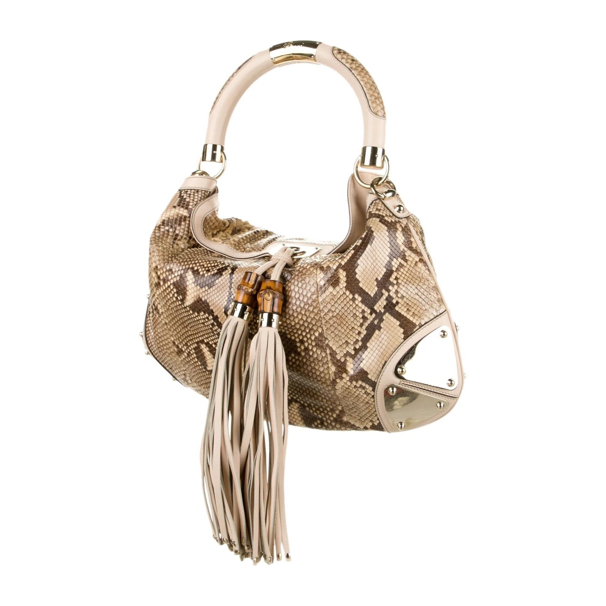 For sale is a vintage, AMAZING, GUCCI, Brown Python Animal Print XL Indy Two Way Top Handle Hobo with a drawstring top, leather accents, silver plates at the corners, a cross-over bamboo beaded, double-tassel flap closure, and an iconic style that is 100% Gucci!