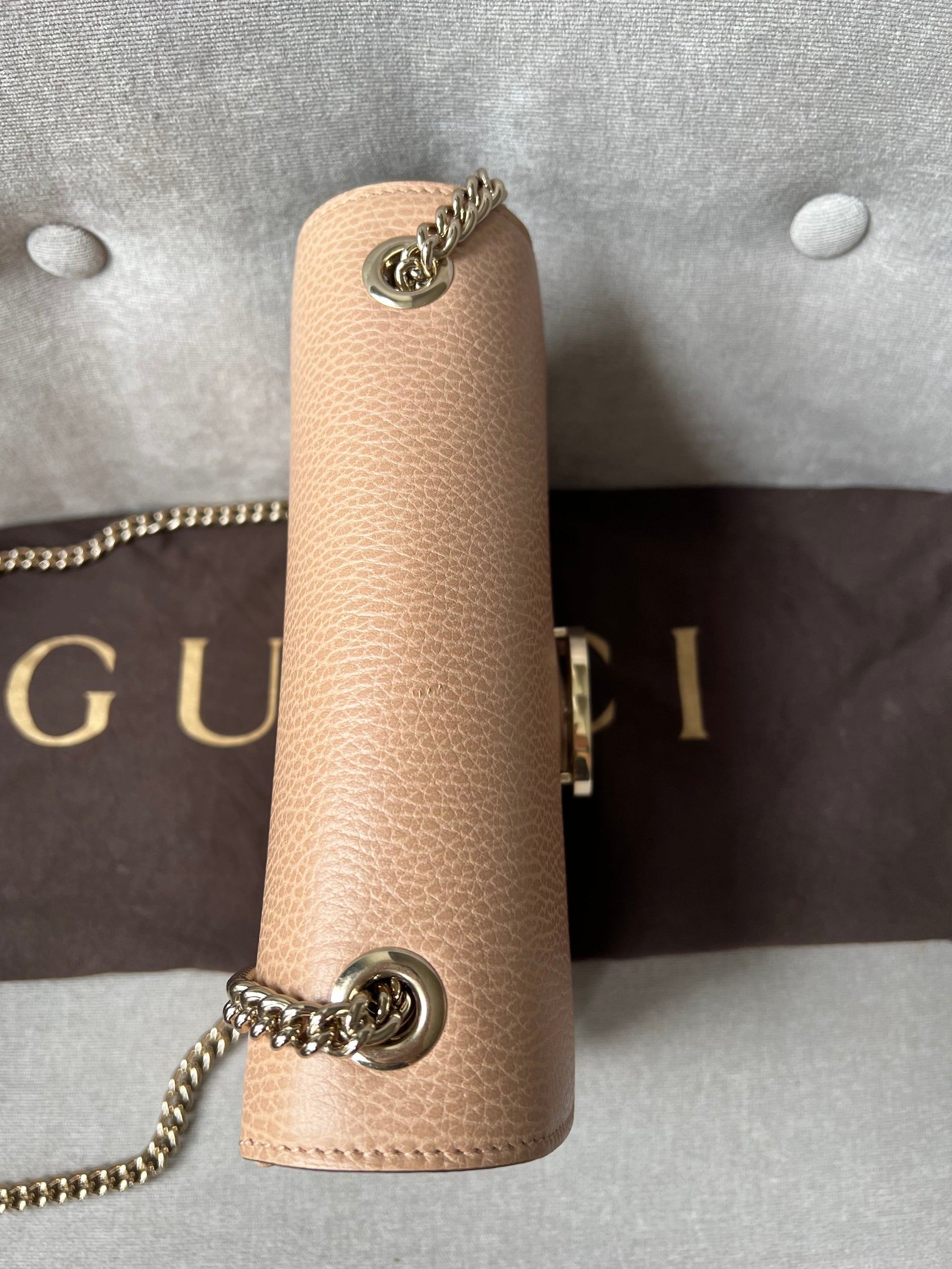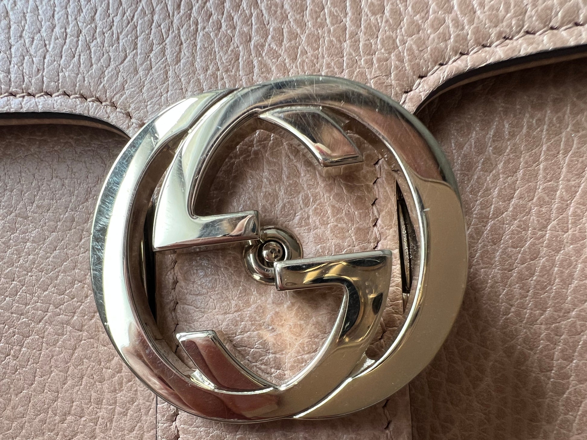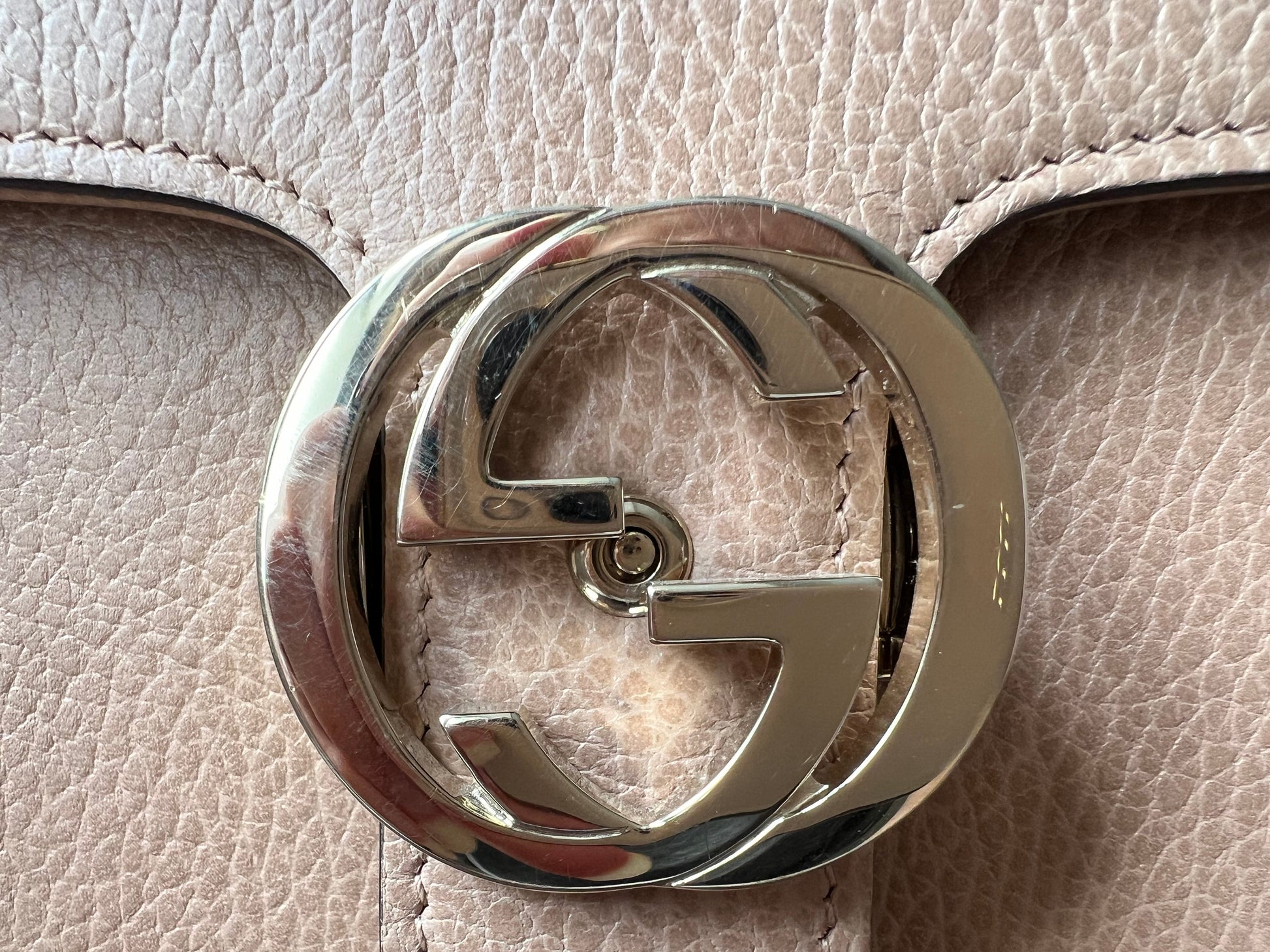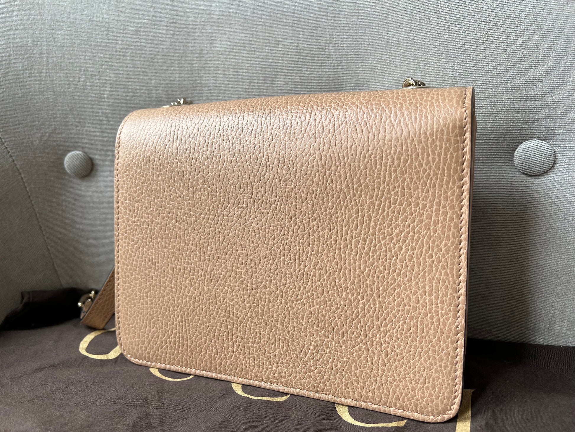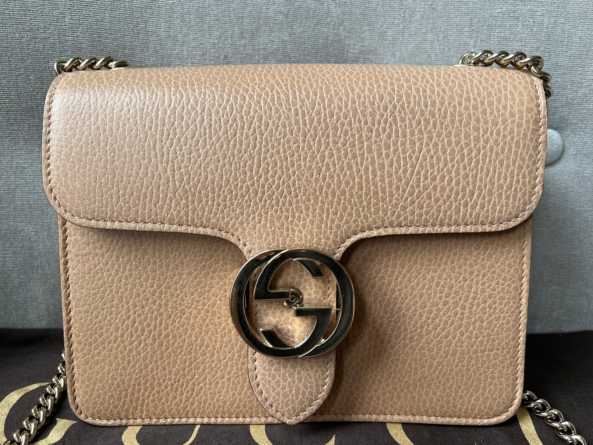 Gucci Interlocking Shoulder Bag in Beige grained calf leather with pale gold hardware. This structured shoulder bag style is sophisticated and chic and in this nude shade goes with almost any outfit. Can be carried over shoulder or cross body using the chain strap. Fold over flap with interlocking gg clasp closure. Ideal for day to day or evening wear.