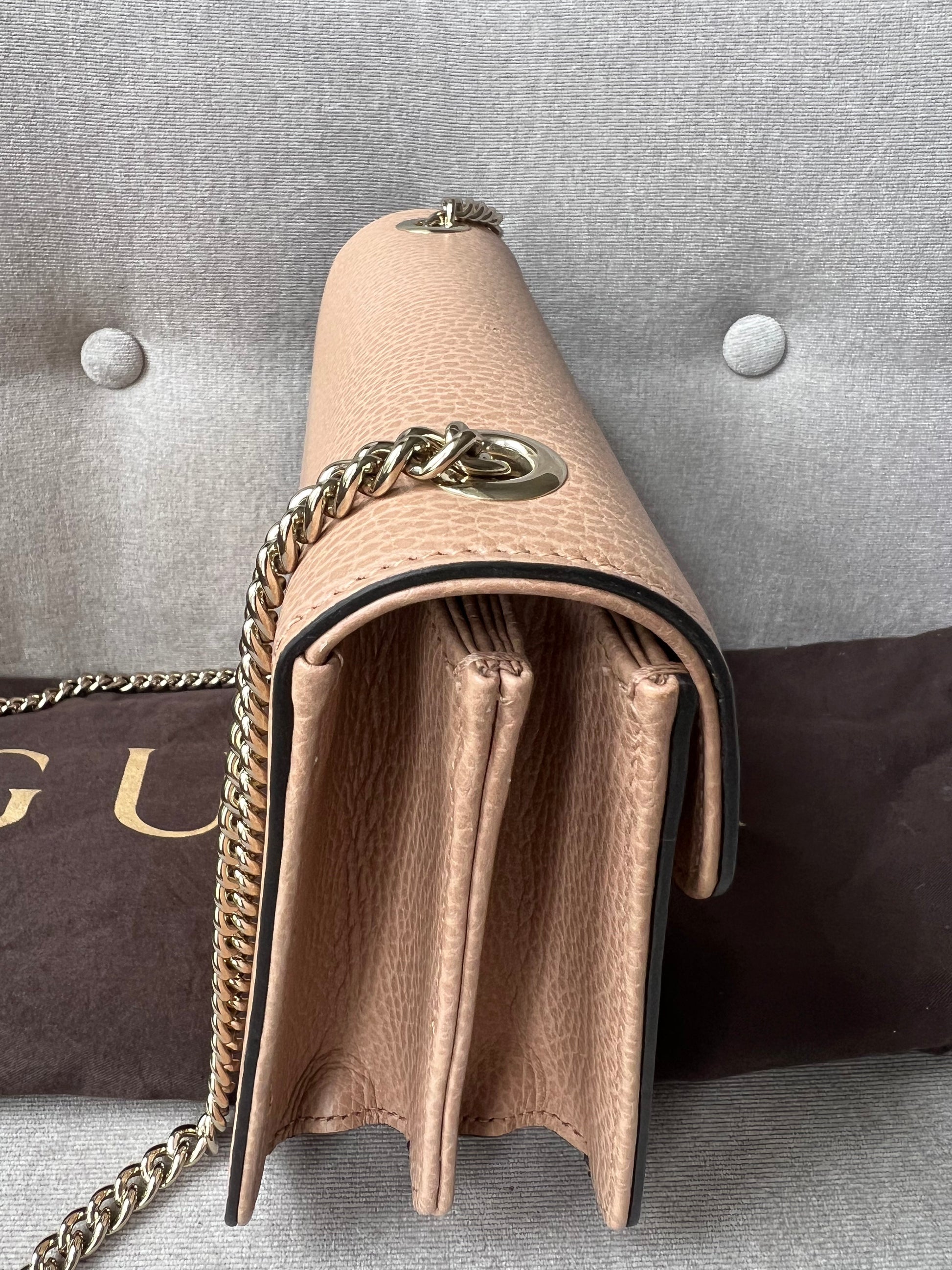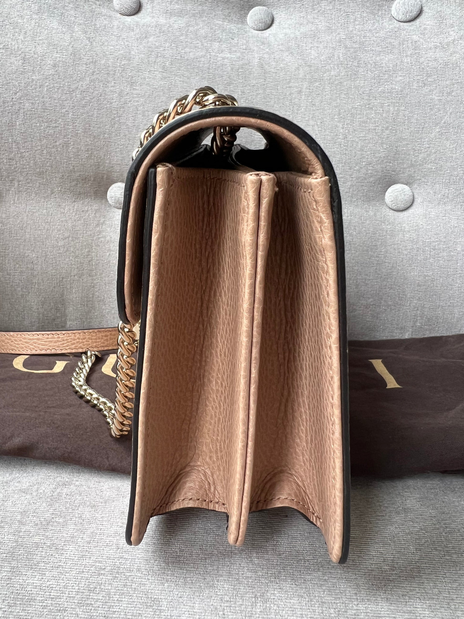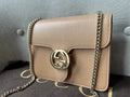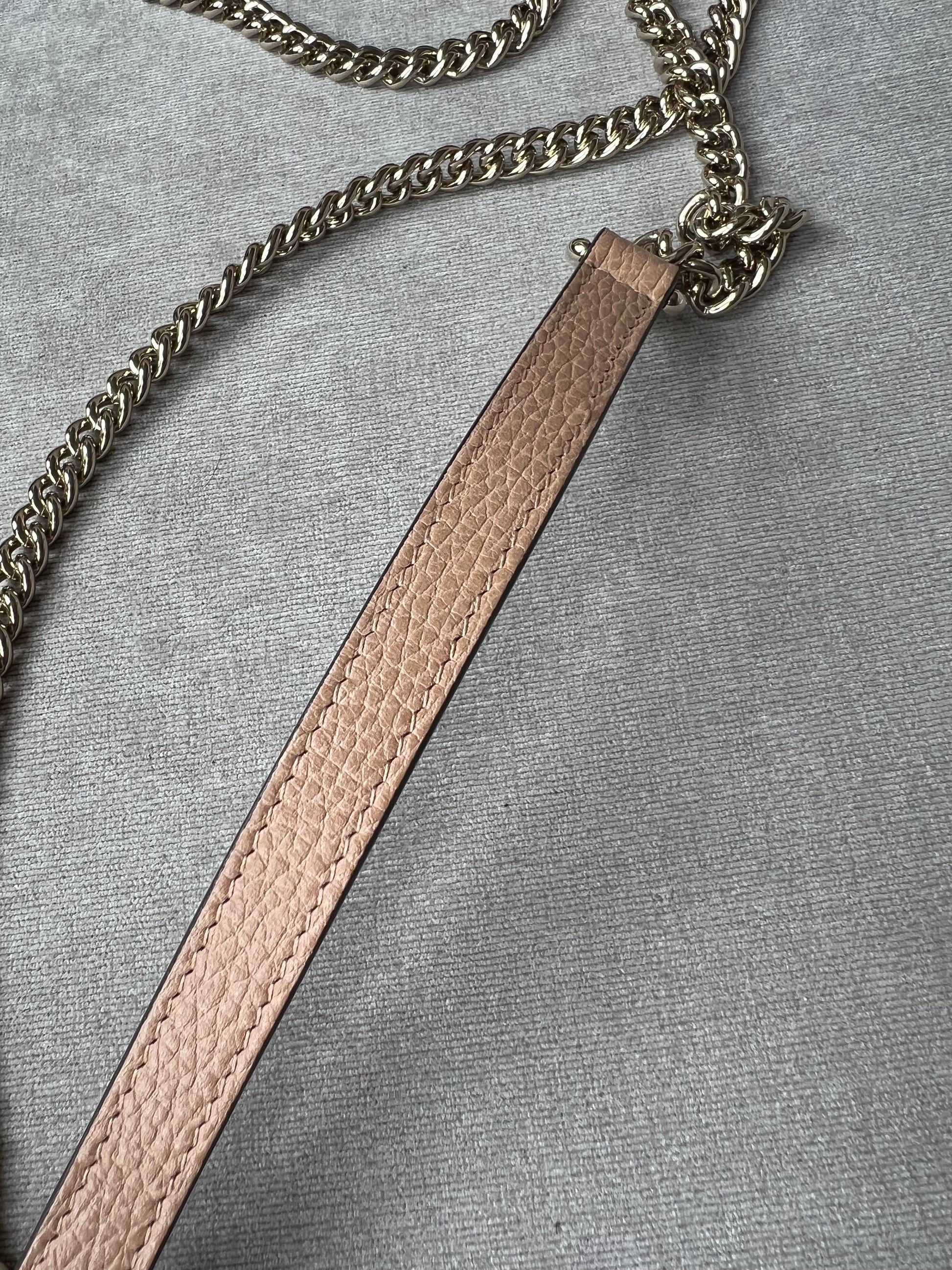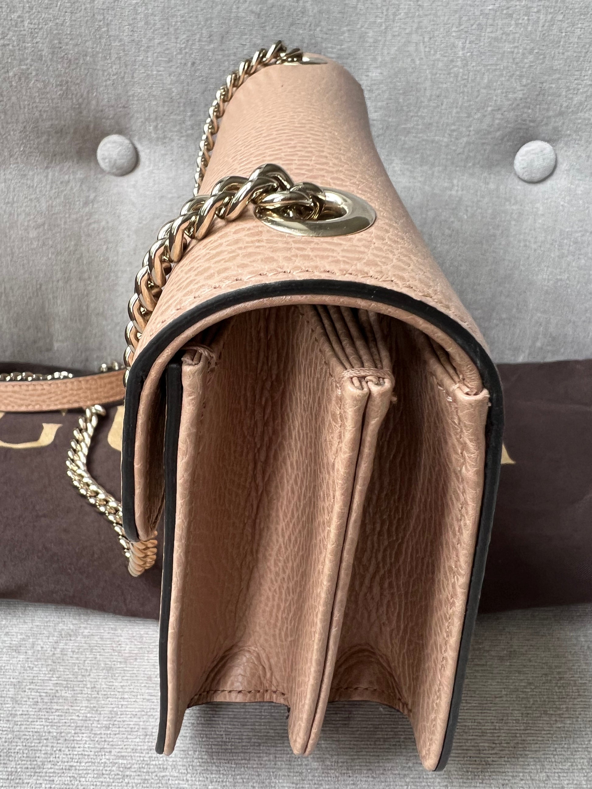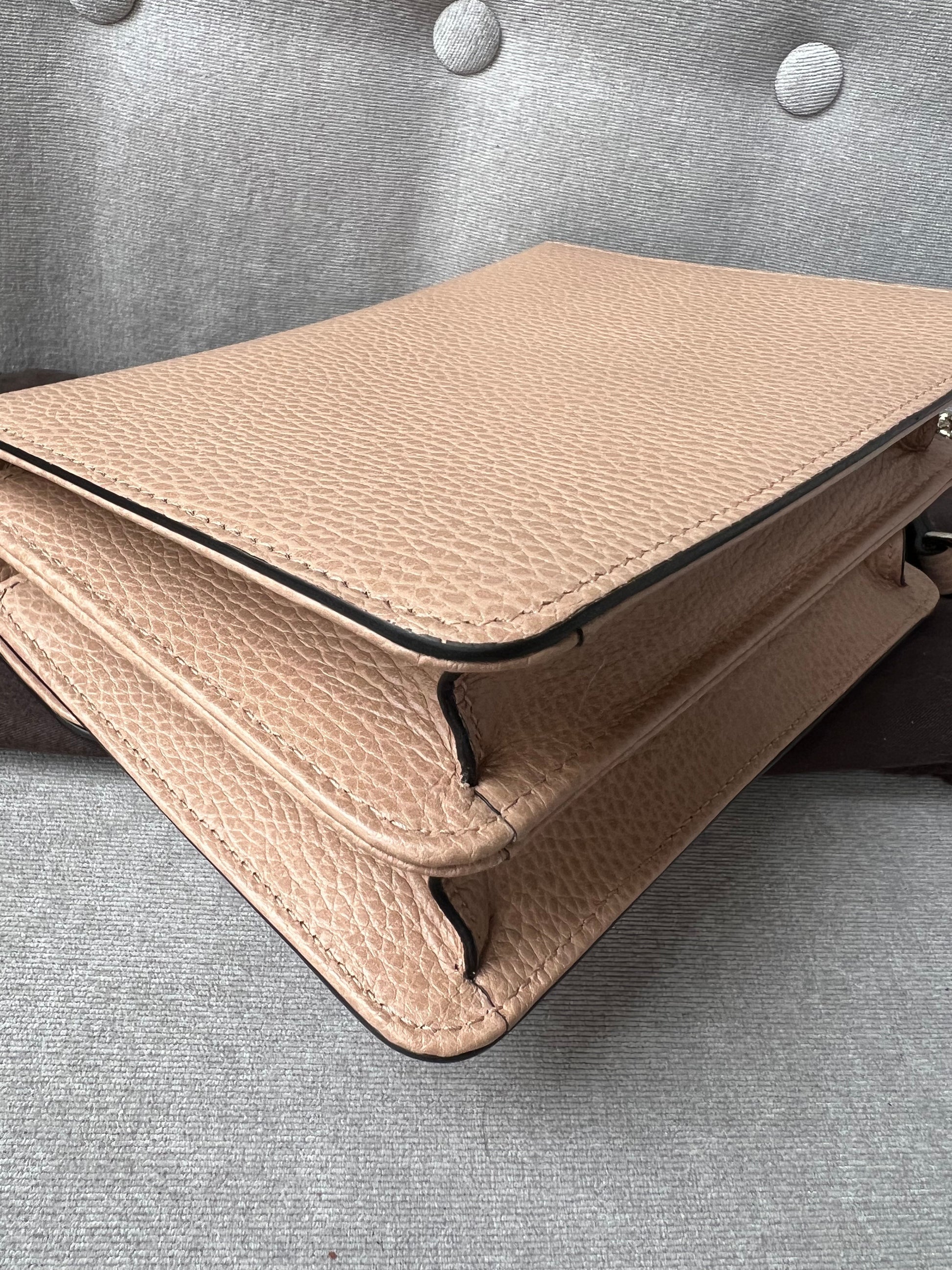 Gucci Interlocking Shoulder Bag in Beige grained calf leather with pale gold hardware. This structured shoulder bag style is sophisticated and chic and in this nude shade goes with almost any outfit. Can be carried over shoulder or cross body using the chain strap. Fold over flap with interlocking gg clasp closure. Ideal for day to day or evening wear.