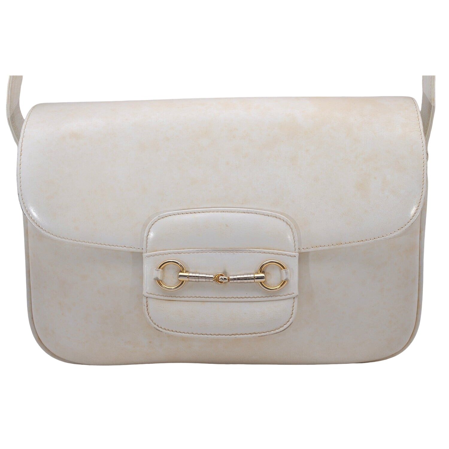 For sale is an original, Gucci, Tom Ford era ivory leather, 1955 Horse-bit, shoulder bag with an envelope top, expandable, accordion style, bottom, an adjustable strap with two- lengths & two- tone horse- bit accents! It is a classic style that would be great used as a signature, everyday ivory purse