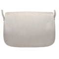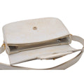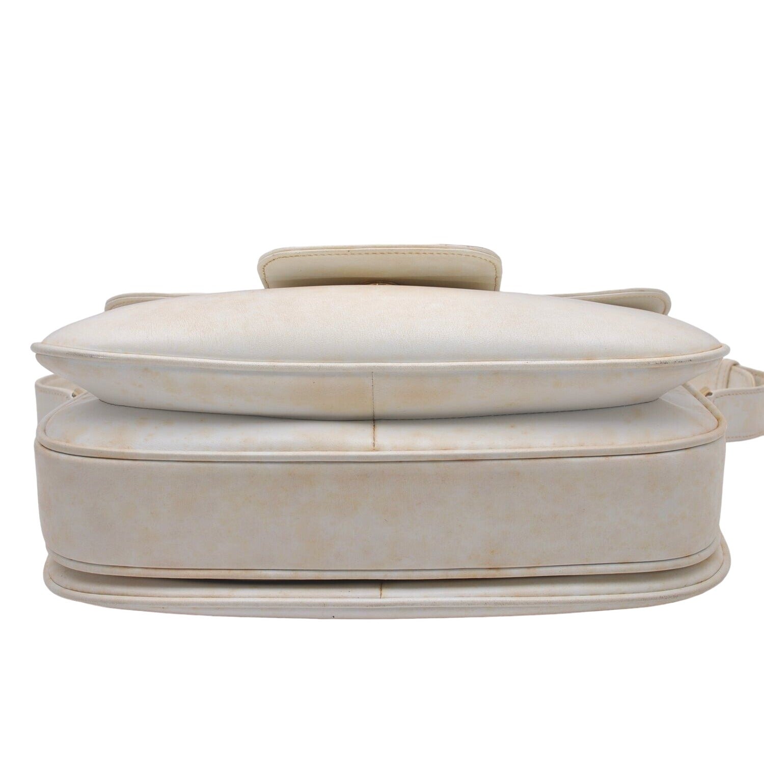 The bag is a large, envelope top, shoulder purse. The body is made of rich ivory leather with a matte finish & bold two-tone hardware, including a great equestrian accent at the center where it closes and sides where the strap is attached! The rectangular shaped purse has an expandable, accordion style bottom, so it can hold a lot more than you might think!